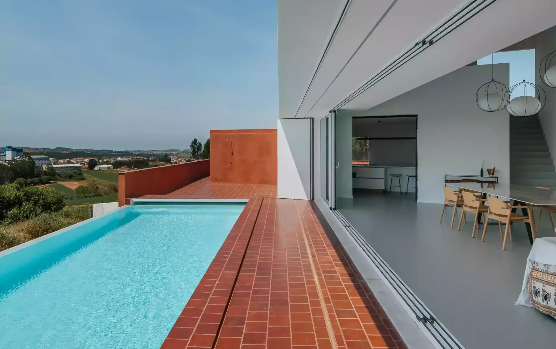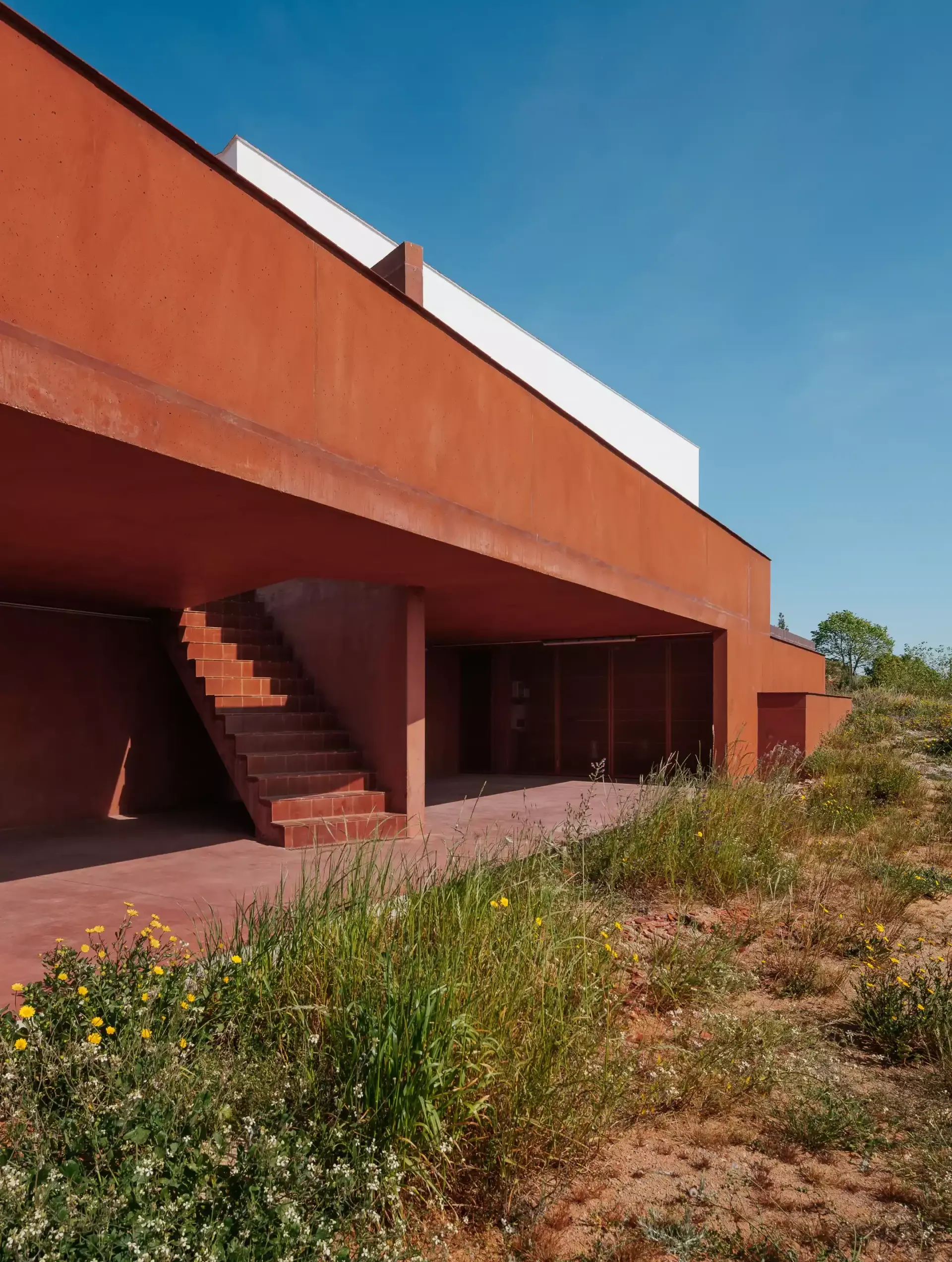 La vivienda se asienta sobre un podio exterior que permite gestionar la pendiente hacia el sur. De esta adaptación al terreno surge una planta inferior, como si se tratara de un bloque macizo, construido en hormigón pigmentado con óxido de hierro del color de la tierra del lugar, conocido por la extracción de barro y la producción cerámica.