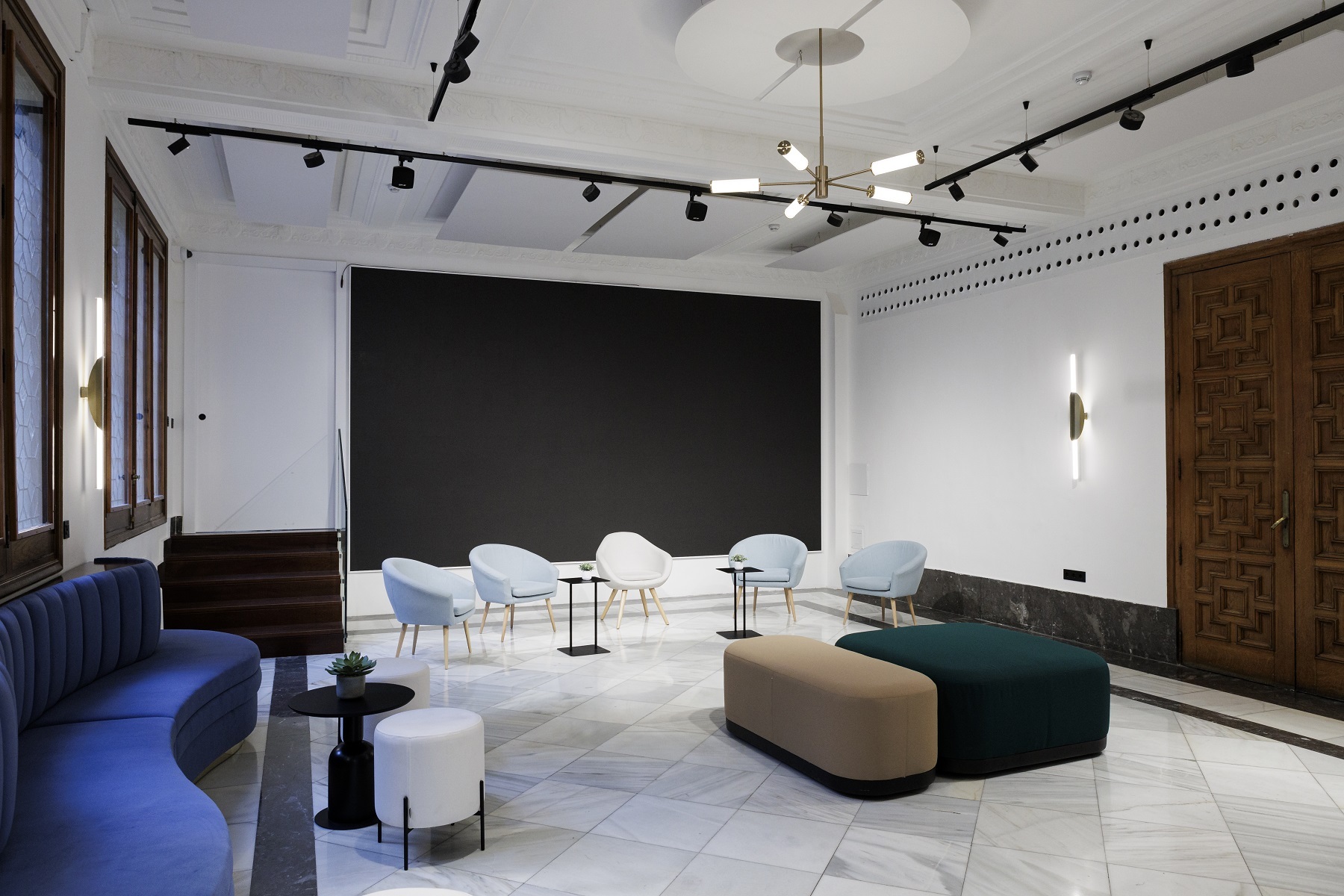 Todo este recorrido nos conduce a la sala polivalente de 70 m², preparada para acoger más de 40 personas sentadas. Incorpora una bancada a medida de más de 6 metros, tapizada en azul, junto a una impresionante pantalla LED de última generación de 12 m².