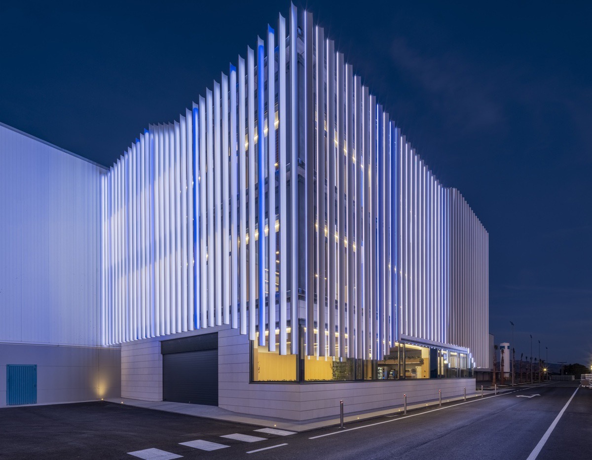 - Noormal Studio firma esta sede corporativa, en colaboración con Amat y Maestre Ingeniería, que transforma el aluminio en arquitectura viva a través de una fachada dinámica y cambiante con lamas retroiluminadas de hasta 12 metros