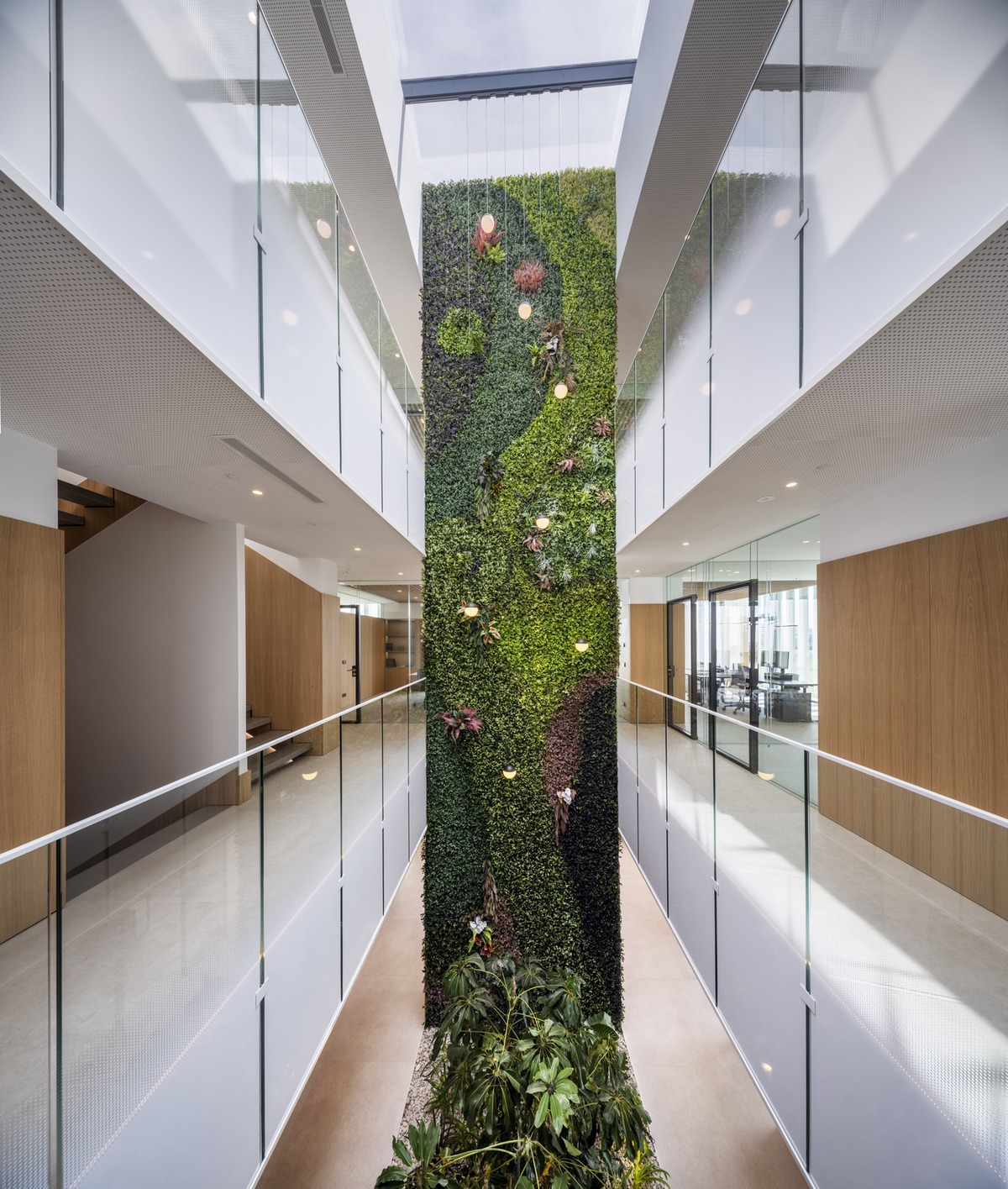 En el corazón del edificio, un atrio con lucernario cenital acoge un impresionante jardín vertical de 11 metros de altura, realizado con vegetación preservada. A sus pies, un jardín natural aporta oxígeno, humedad y referencias visuales a todas las plantas, generando un núcleo verde que actúa como filtro visual, acústico y emocional.