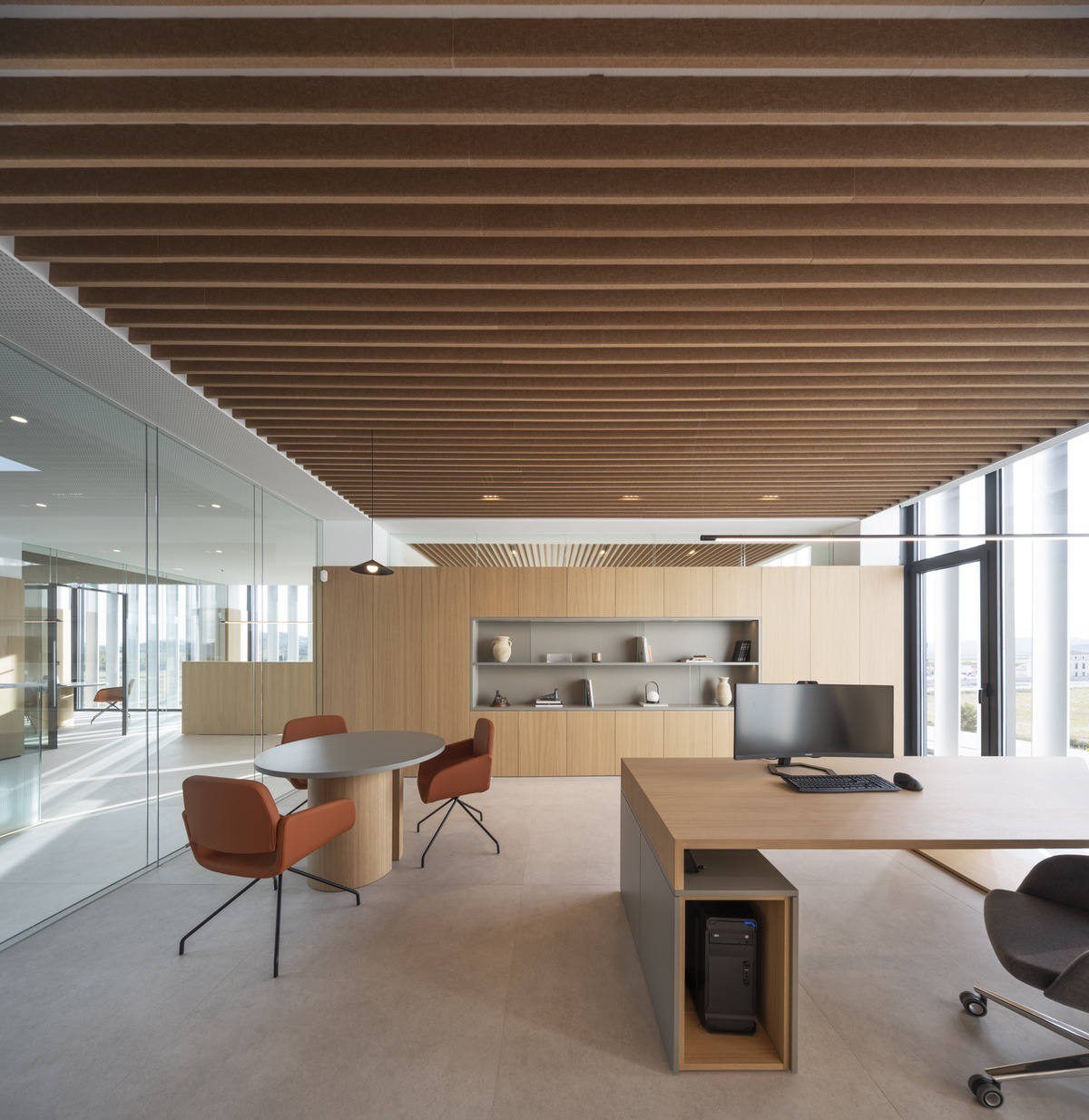 Desde los suelos cerámicos de gran formato de Living Ceramics hasta los techos acústicos de PET reciclado y Cleaneo de Knauf, cada elemento ha sido pensado para crear un espacio funcional, cálido y mínimamente intervenido. Todo el mobiliario, desde las mesas de juntas hasta las sillas de dirección, ha sido fabricado a medida, con acabados en roble natural y lacados en grises neutros (RAL 7030 y 7016). La línea visual se mantiene a 2,30 metros en todo el edificio: puertas (en su mayoría escamoteadas), ventanas, muebles y luminarias siguen esta cota para generar una continuidad visual homogénea.