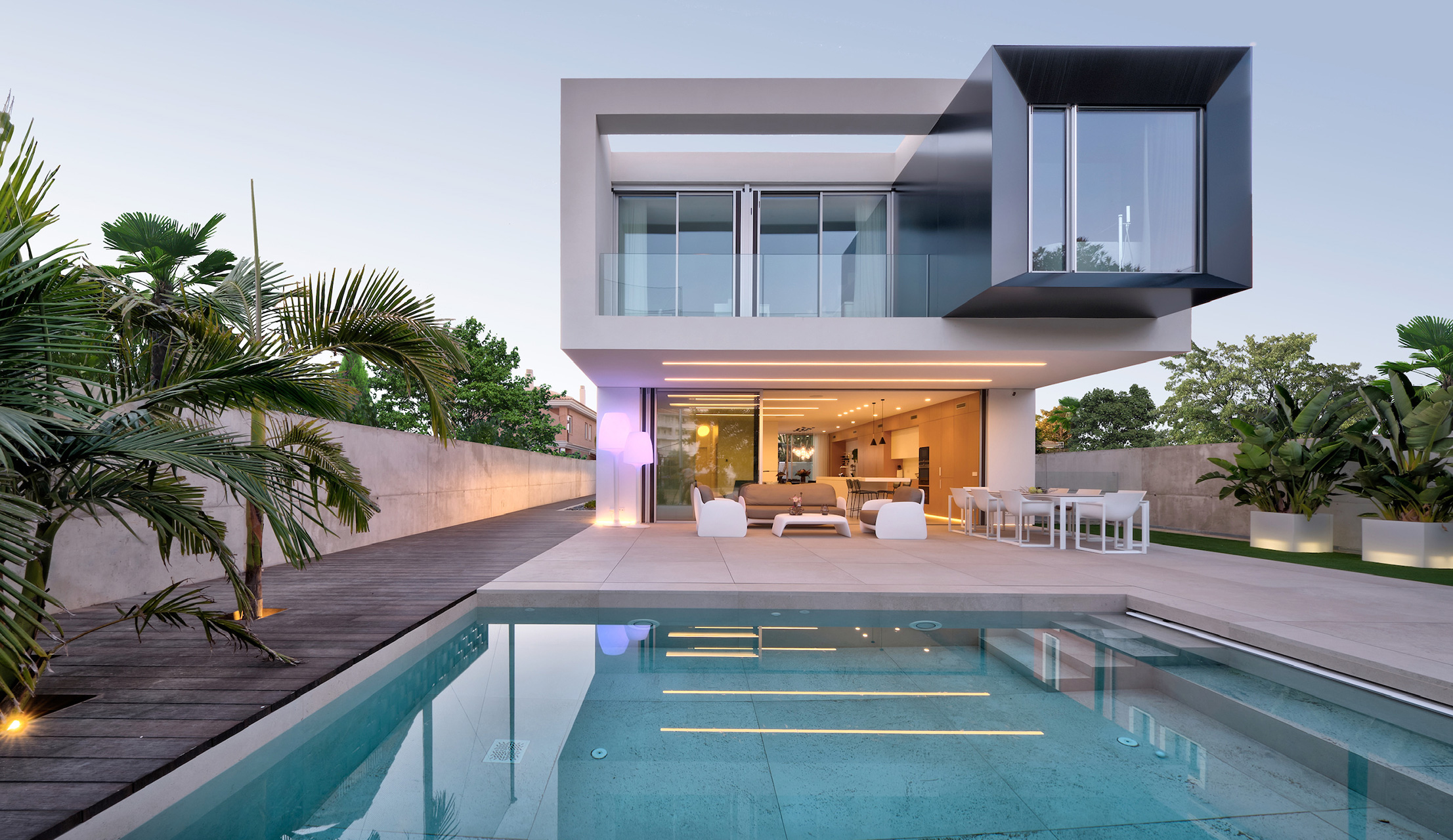 La continuidad de techos, iluminación y pavimento, junto al tratamiento de las piezas de mobiliario que ordenan la planta contribuye, aún más, a que los espacios exteriores de la vivienda se interpreten como una parte más de la misma.