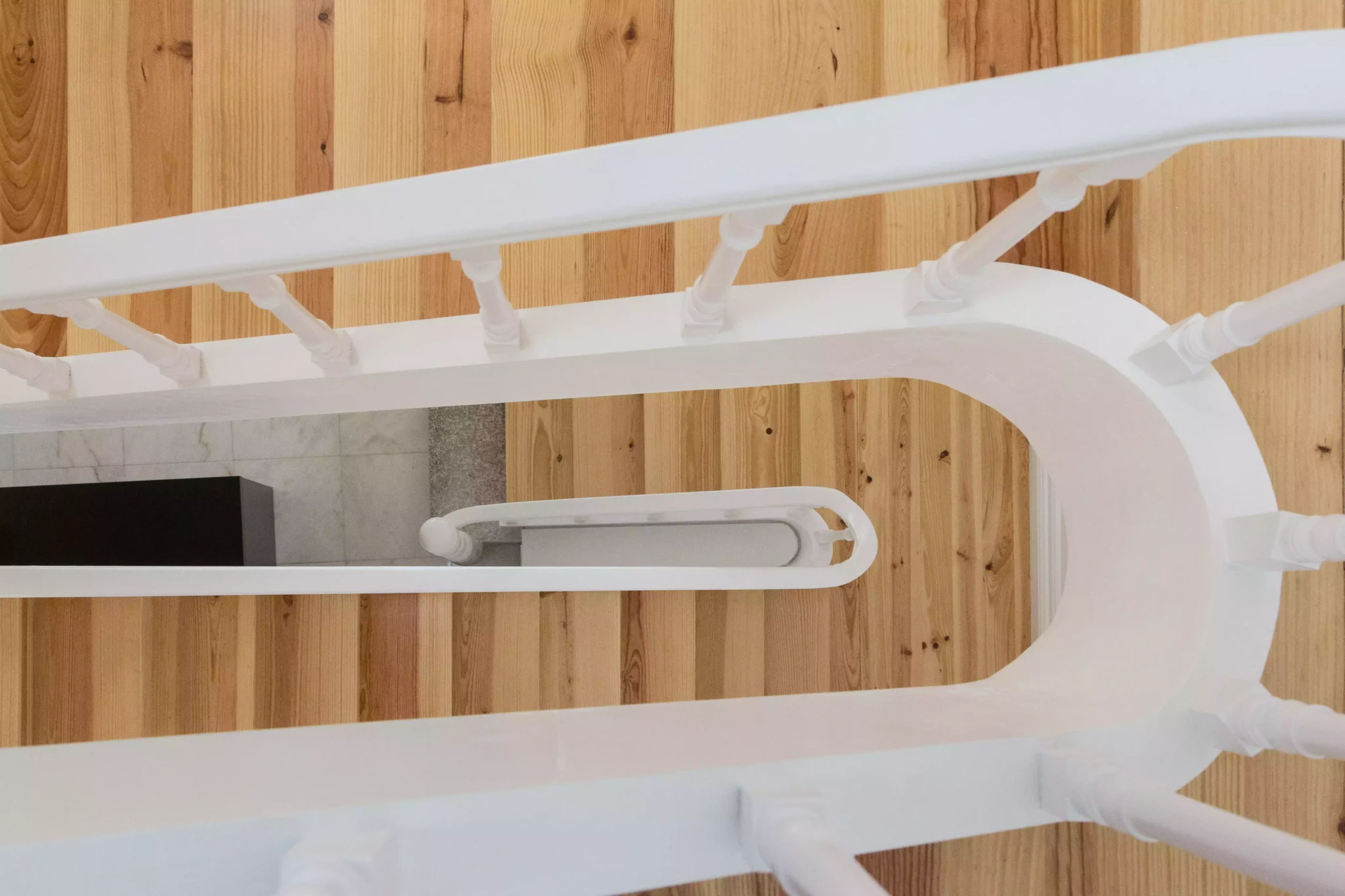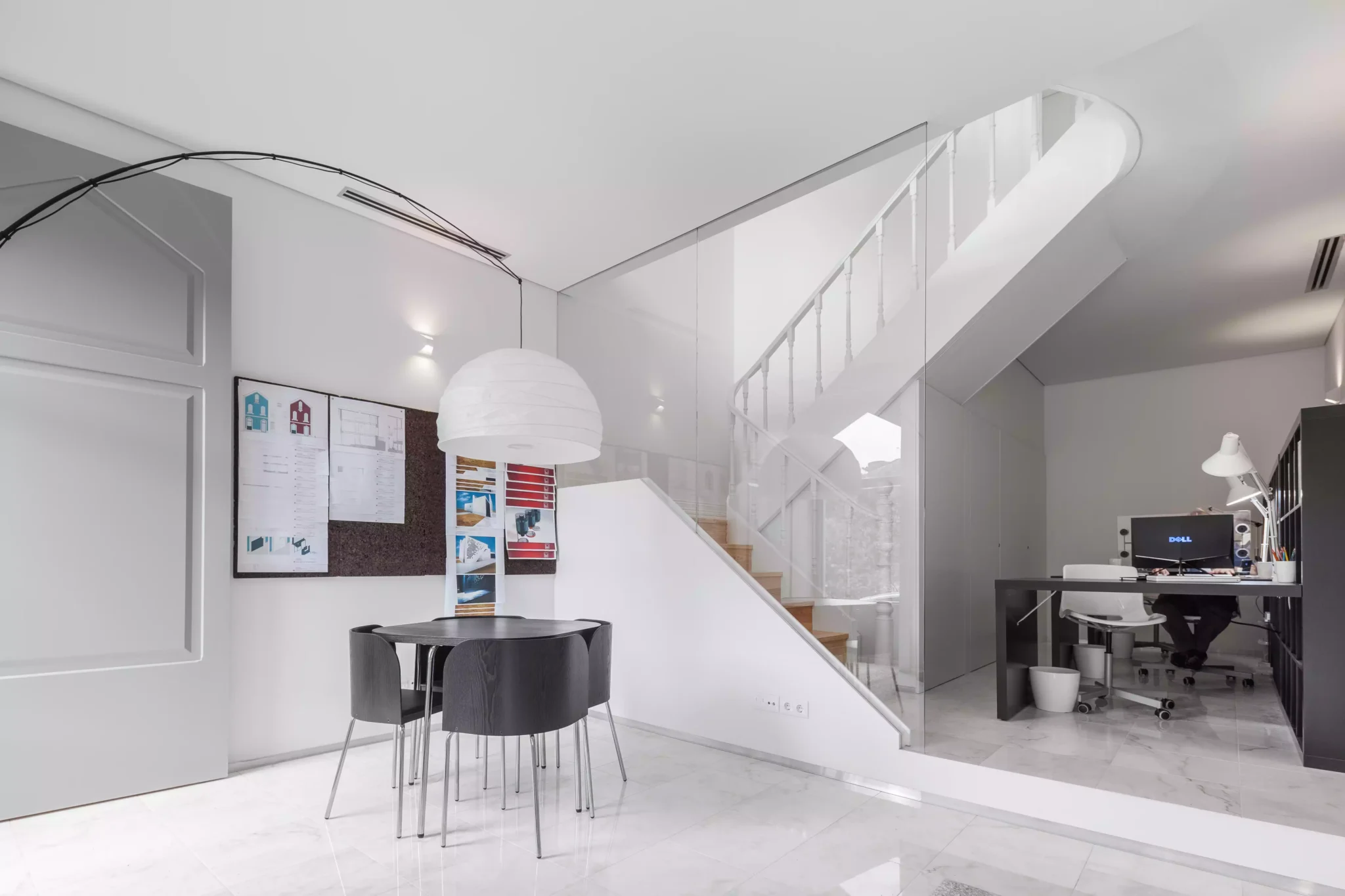 La geometría de la escalera filtra eficientemente las relaciones visuales entre los dos programas, mientras permitiendo que la luz natural de los pisos superiores baje sobre el estudio de trabajo.