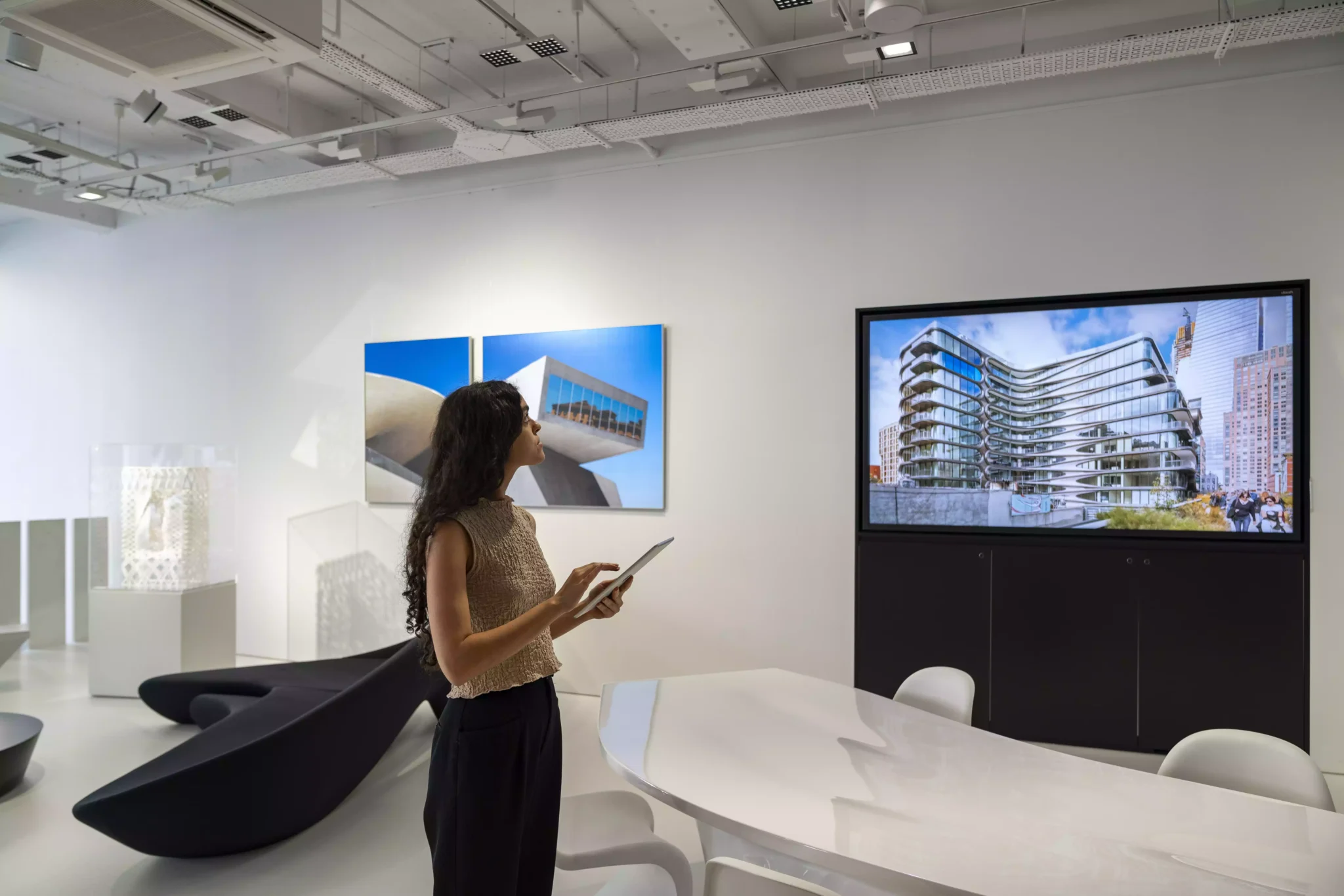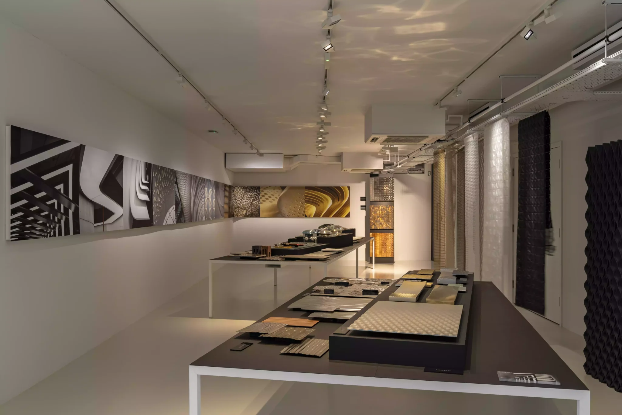 Leung cree que estos espacios tipo escaparate desempeñan un papel decisivo para explicar a la gente el proceso que subyace en la arquitectura de ZHA. Una exposición reciente incluía efectos luminosos dinámicos que transmitían la sensación de que los objetos y materiales expuestos estaban animados. «Para nosotros es muy importante crear un entorno», añade Leung, «para que cuando la gente llegue, se adentre en el universo de Zaha Hadid Architects.»