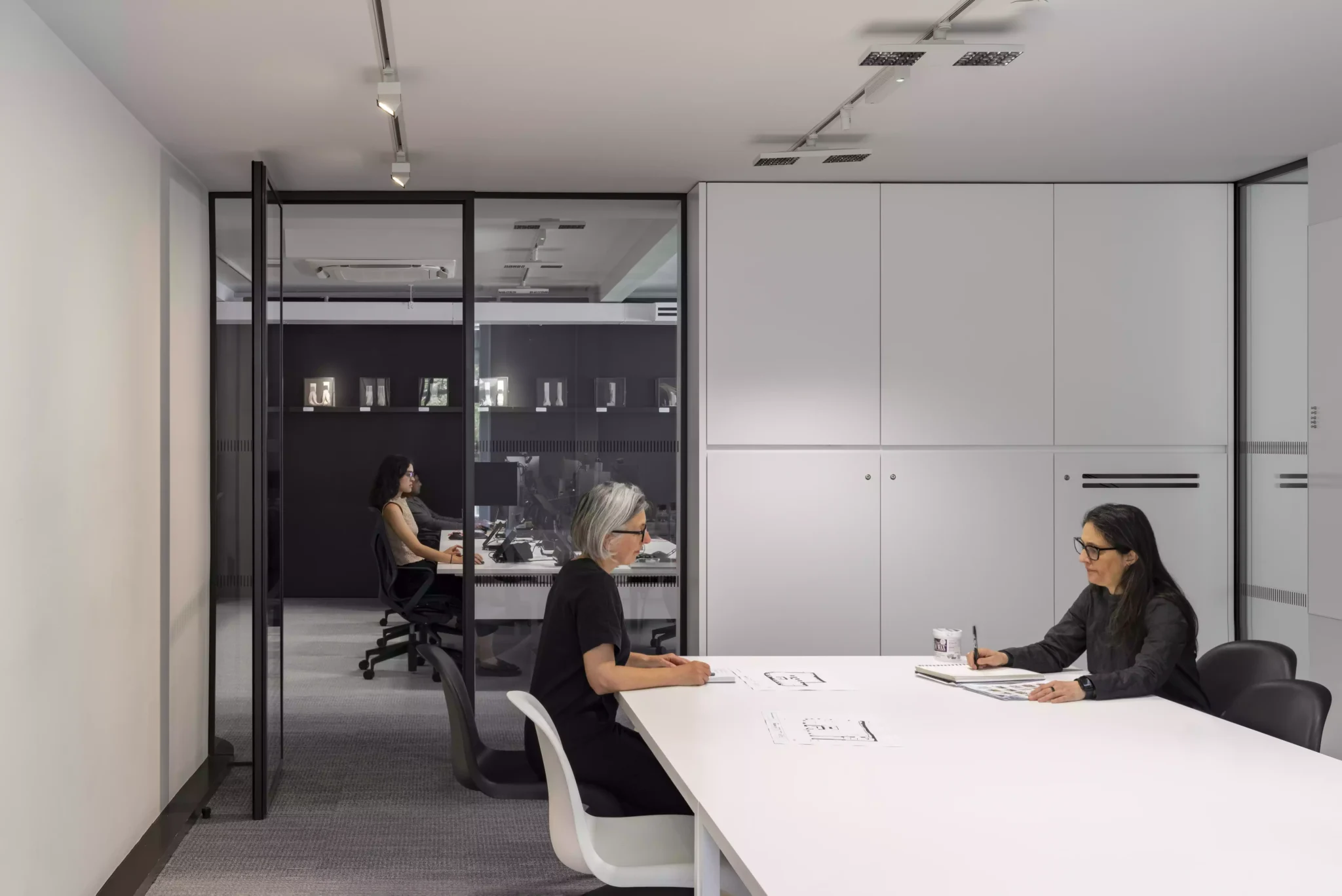 En las plantas baja y subterránea se encuentran las salas de exposiciones y las instalaciones dedicadas a la investigación de diseño y a la producción digital, lo que permite a ZHA crear diversos escenarios de innovación arquitectónica. Estas plantas también acogen otras actividades de cara al público, que abarcan desde cenas privadas y cócteles hasta talleres y mesas redondas. Los proyectores Parscan 48V de ERCO permiten a ZHA acentuar diferentes zonas, dependiendo de su uso. «Podemos organizar el espacio de diferentes maneras», nos dice Melodie Leung, directora asociada de ZHA. «A veces queremos que sea un espacio muy amplio y unificado, y otras veces queremos que sea más escénico.»