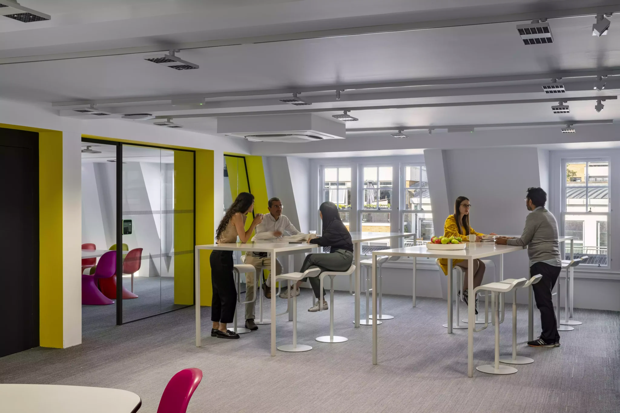 Una ventaja fundamental del sistema Jilly es su flexibilidad. Este sistema permite reubicar los proyectores en el raíl electrificado fácilmente y sin herramientas. Este era uno de los objetivos principales de la reforma del 101 de la Goswell Road, que se planificó con el departamento de análisis, Analytics + Insights (ZHAI), de ZHA, un grupo de investigación que utiliza datos digitales e inteligencia artificial para predecir de forma inteligente el futuro del diseño del espacio de trabajo. «Antes, el diseño de oficinas se fundamentaba en un planteamiento único que se aplicaba en todos los casos, pero esto ya se ha superado», afirma Ulrich Blum, codirector de ZHAI. «Los espacios de trabajo deben poder adaptarse, incluso sin previo aviso, para poder tener en cuenta las diferencias en la forma de trabajar de los equipos.» Esta circunstancia dio lugar a un diseño que ofrece menos escritorios, pero una mayor variedad de espacios donde se puede reunir el personal. Ejemplo de ello es la cuarta planta, que se ha convertido en un espacio común que facilita reuniones y encuentros improvisados.