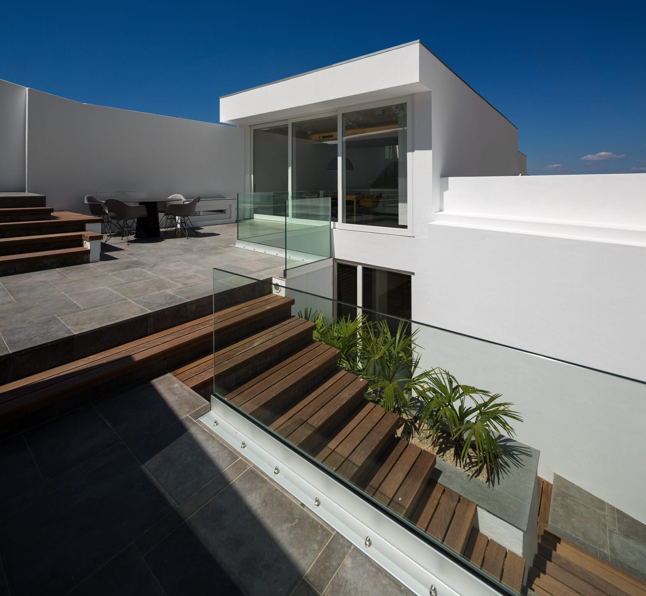 Los arquitectos han sabido sacar el máximo partido a una disposición anteriormente adversa: la topografía inclinada e irregular ha sido plenamente aprovechada mediante una colonización espacial que permite la extensión de las distintas estancias más allá de sus límites interiores.