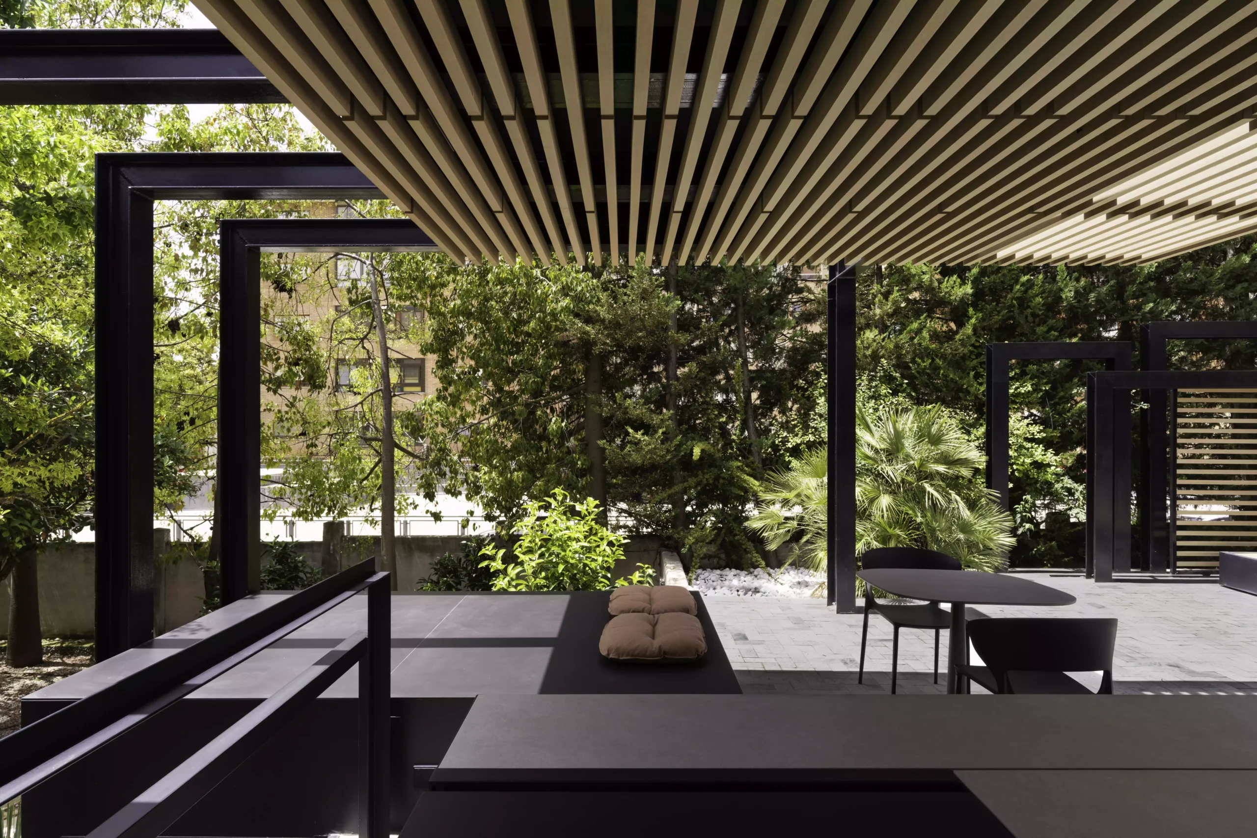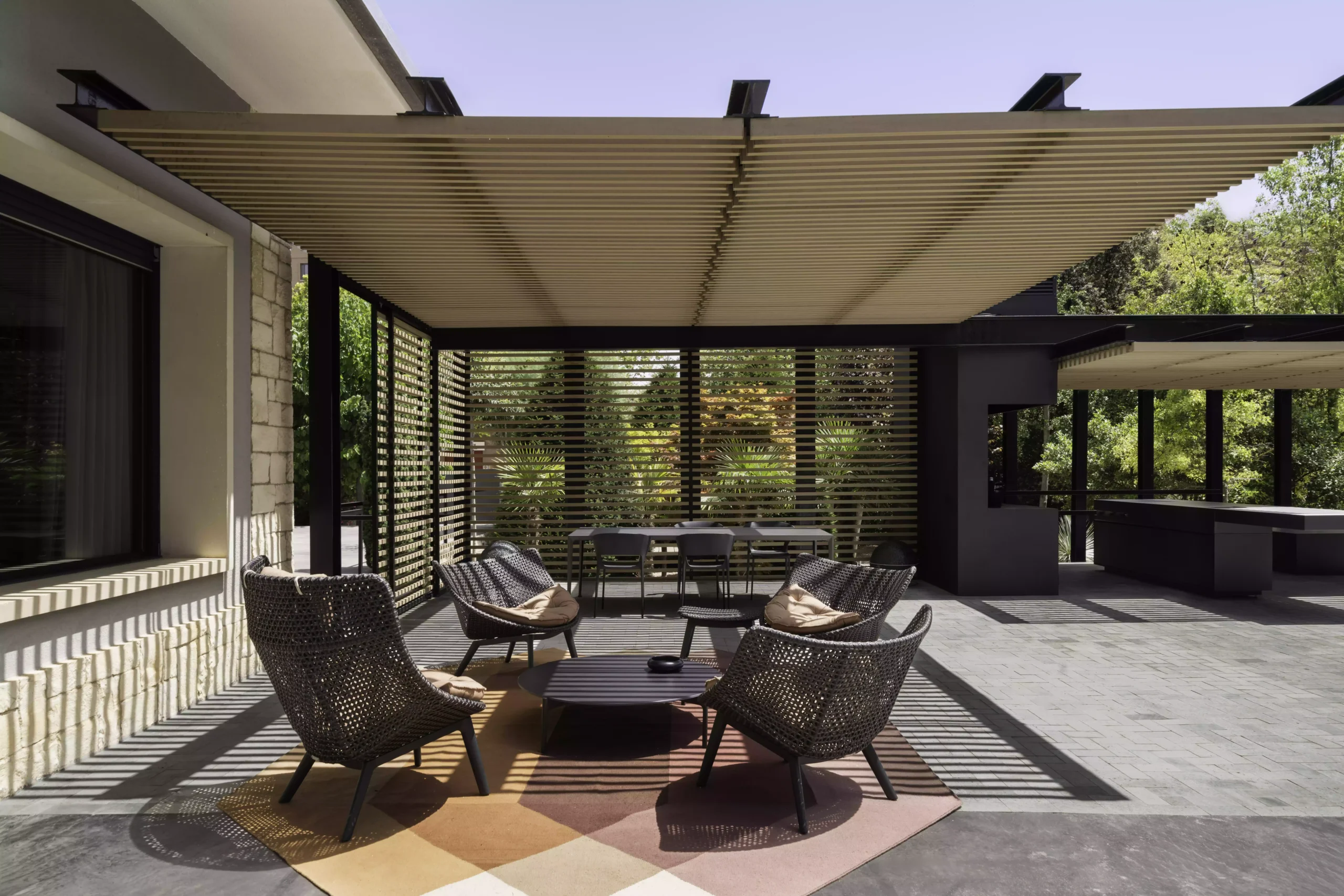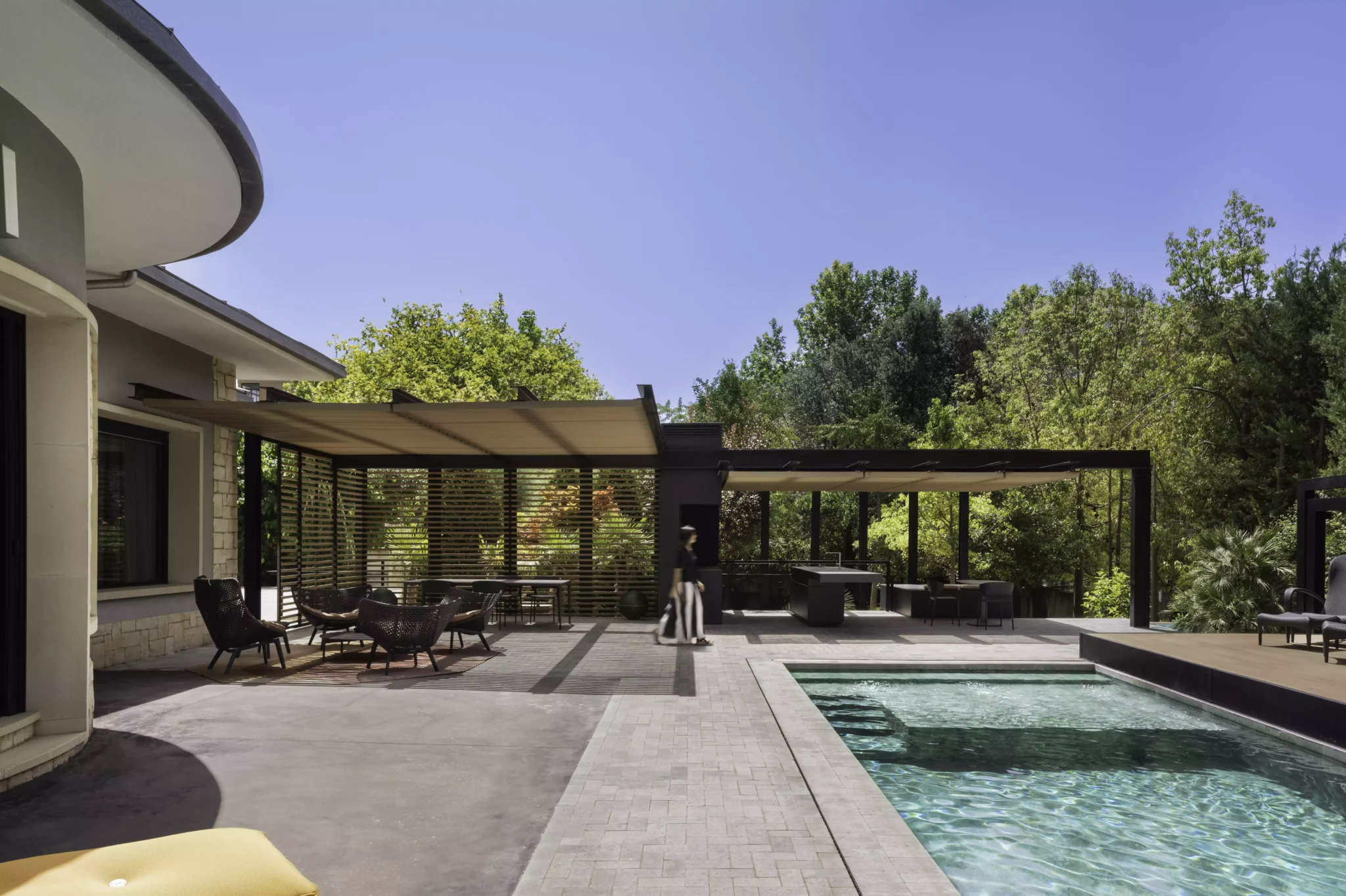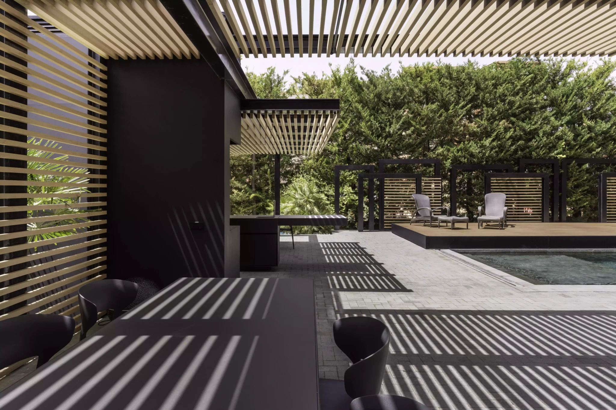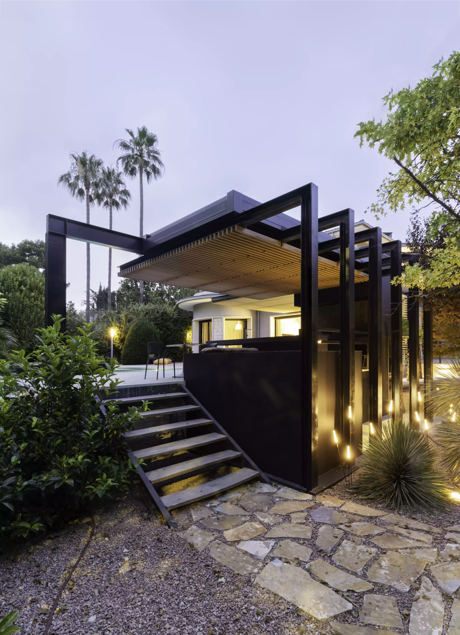 El eje director de este nuevo espacio exterior es la pérgola. La pérgola adquiere diversas funciones entre las cuales destacan la de elemento generador y vertebrador de espacios de diferente índole. El carácter poético de la intervención responde a una organización mediante la separación de los elementos naturales fundamentales. Estos son el agua representada por la zona de baño, la tierra representada por el jardín trasero, el fuego representado por la zona de chimenea-barbacoa y el aire representado por el gran voladizo generado por la propia pérgola.