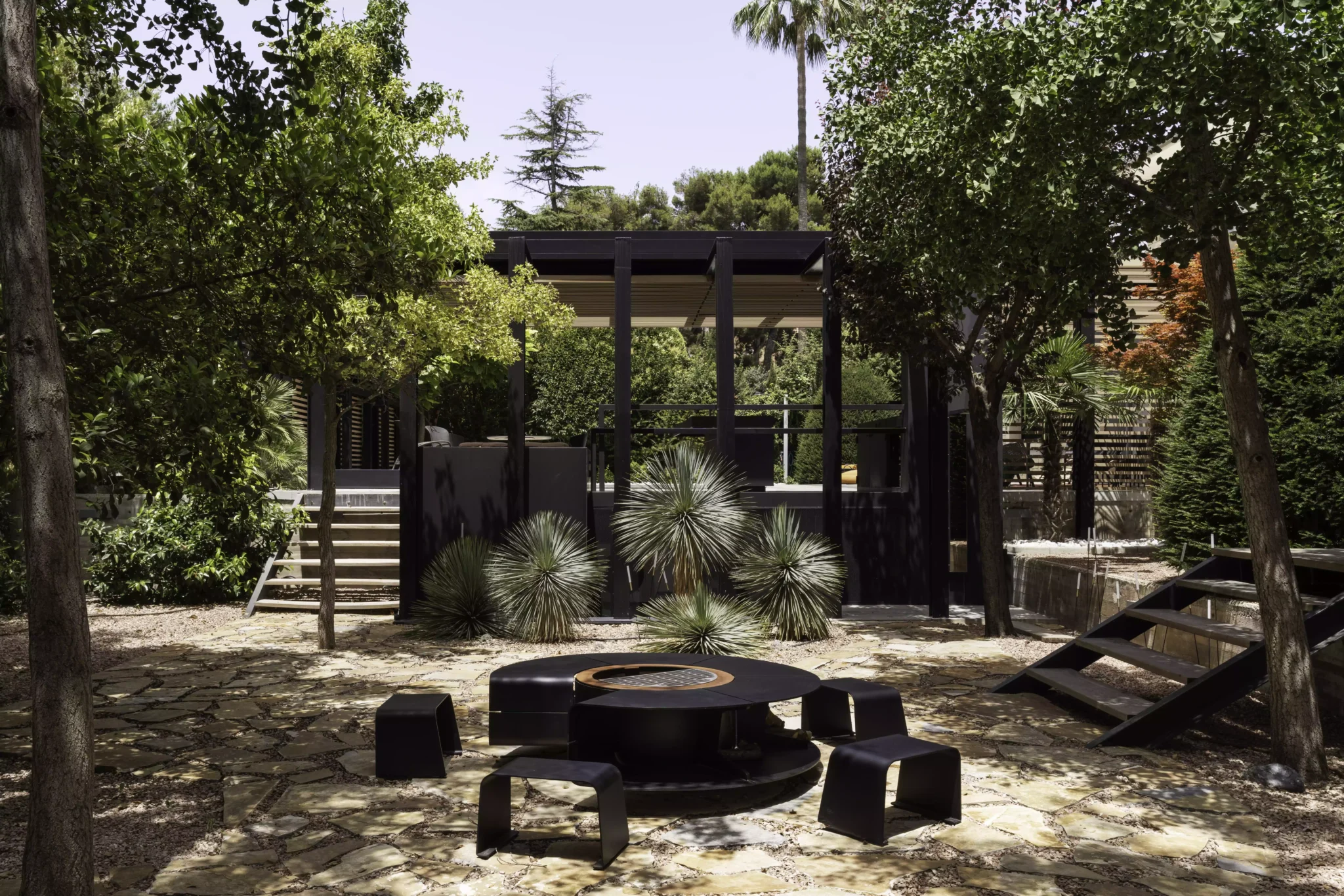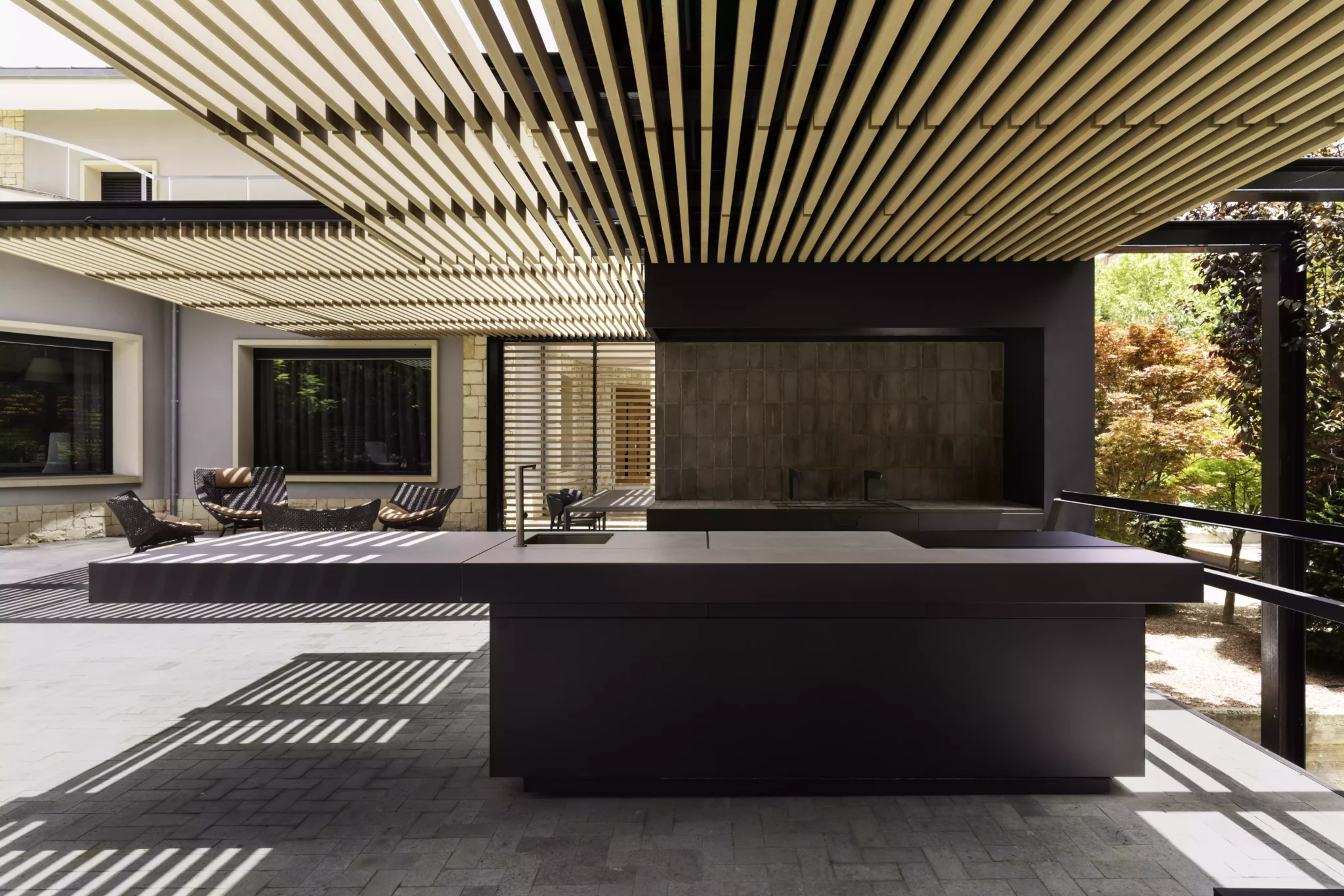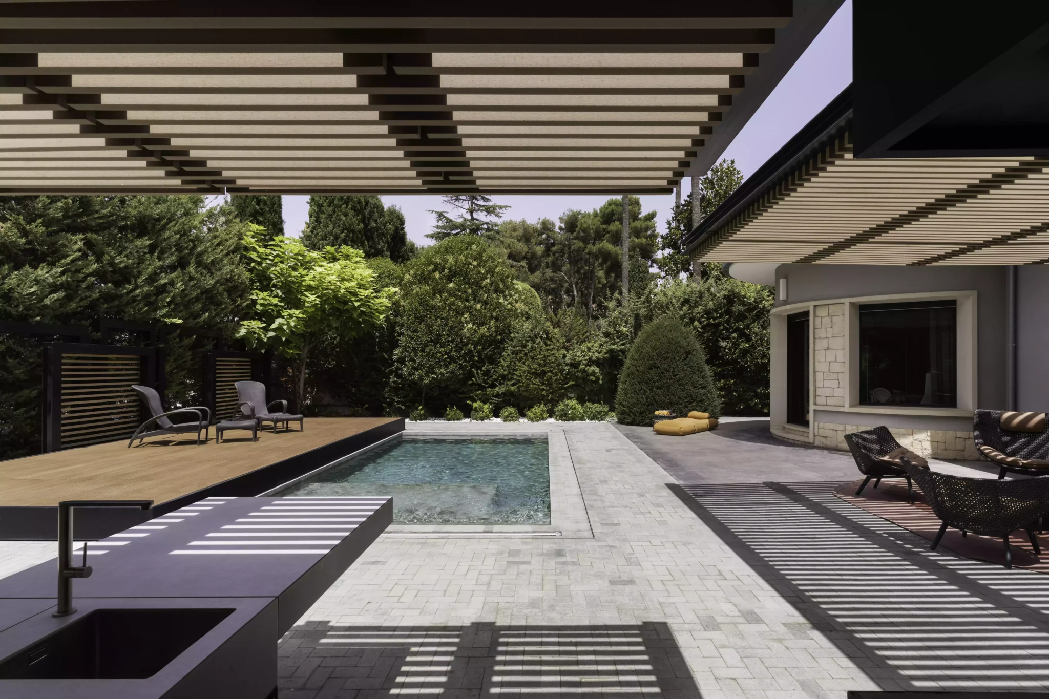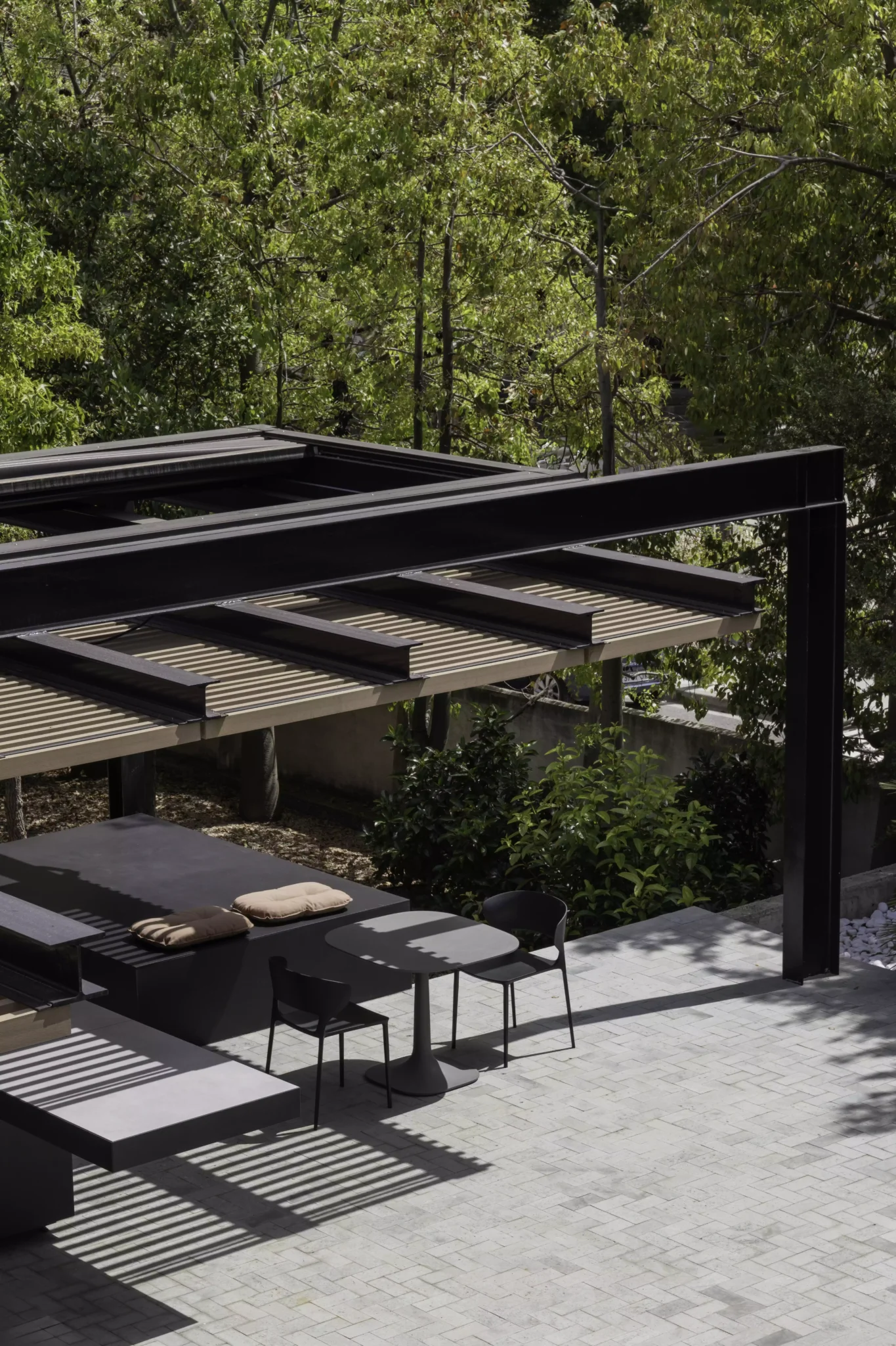 El eje director de este nuevo espacio exterior es la pérgola. La pérgola adquiere diversas funciones entre las cuales destacan la de elemento generador y vertebrador de espacios de diferente índole. El carácter poético de la intervención responde a una organización mediante la separación de los elementos naturales fundamentales. Estos son el agua representada por la zona de baño, la tierra representada por el jardín trasero, el fuego representado por la zona de chimenea-barbacoa y el aire representado por el gran voladizo generado por la propia pérgola.