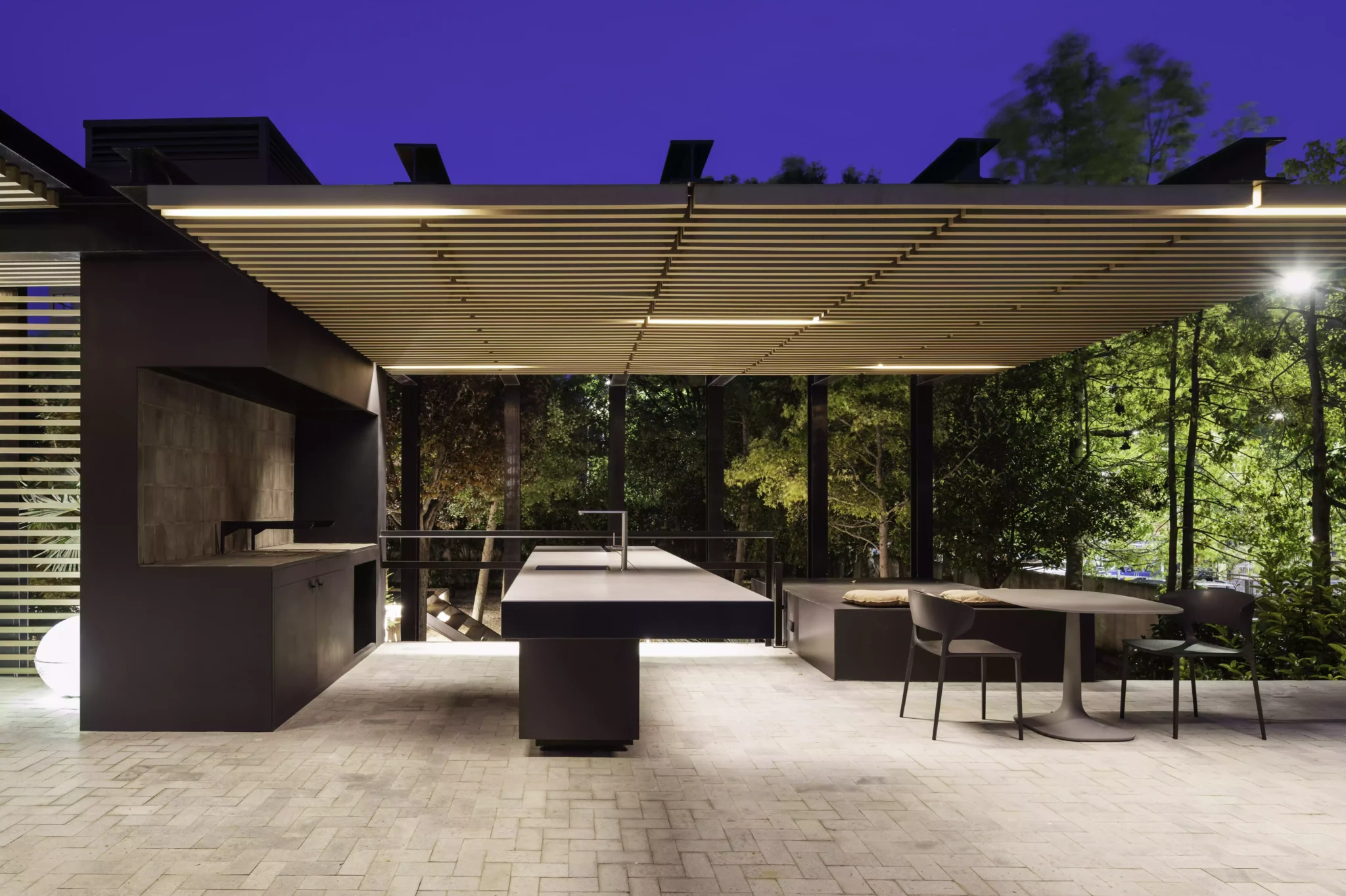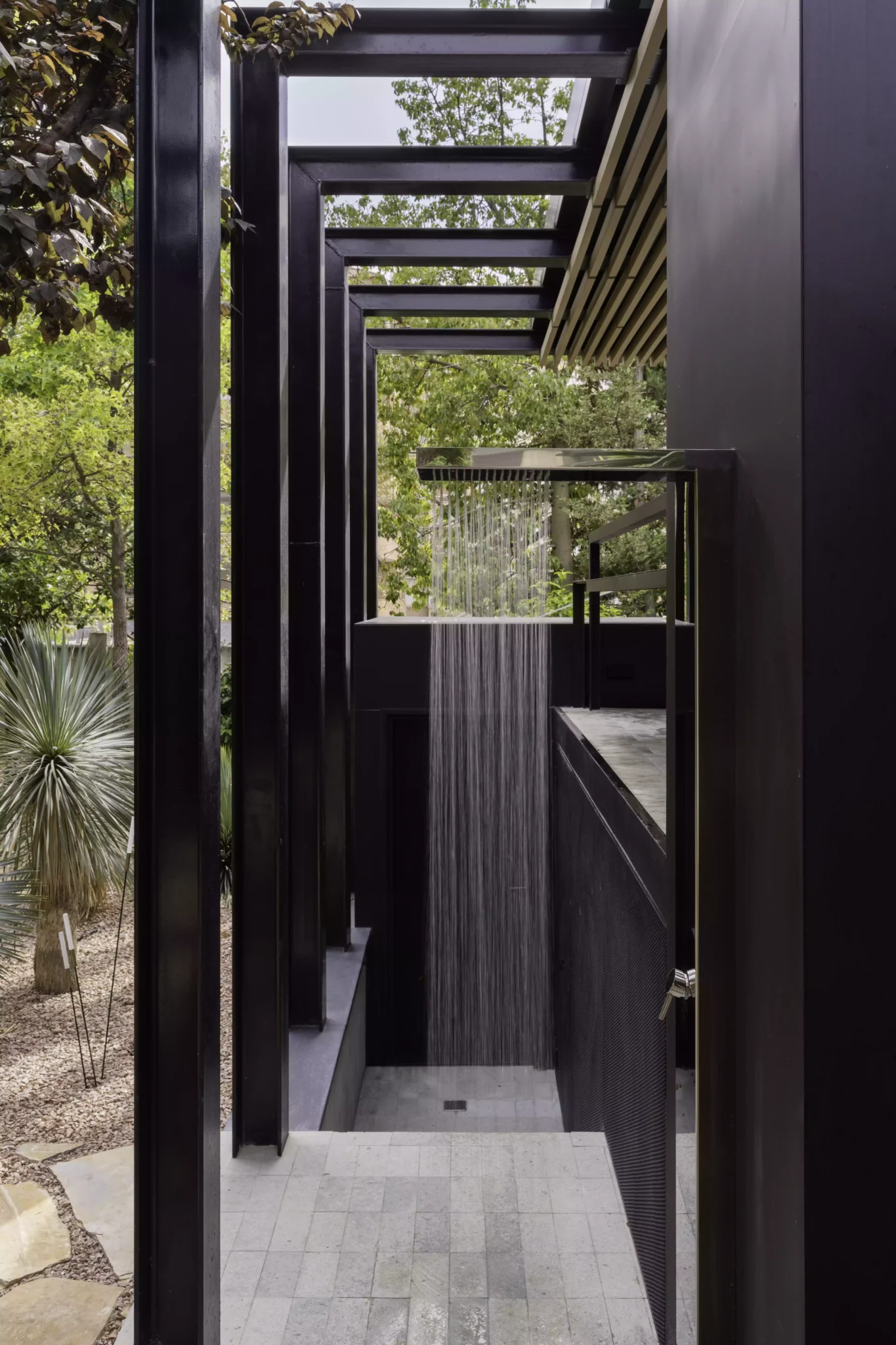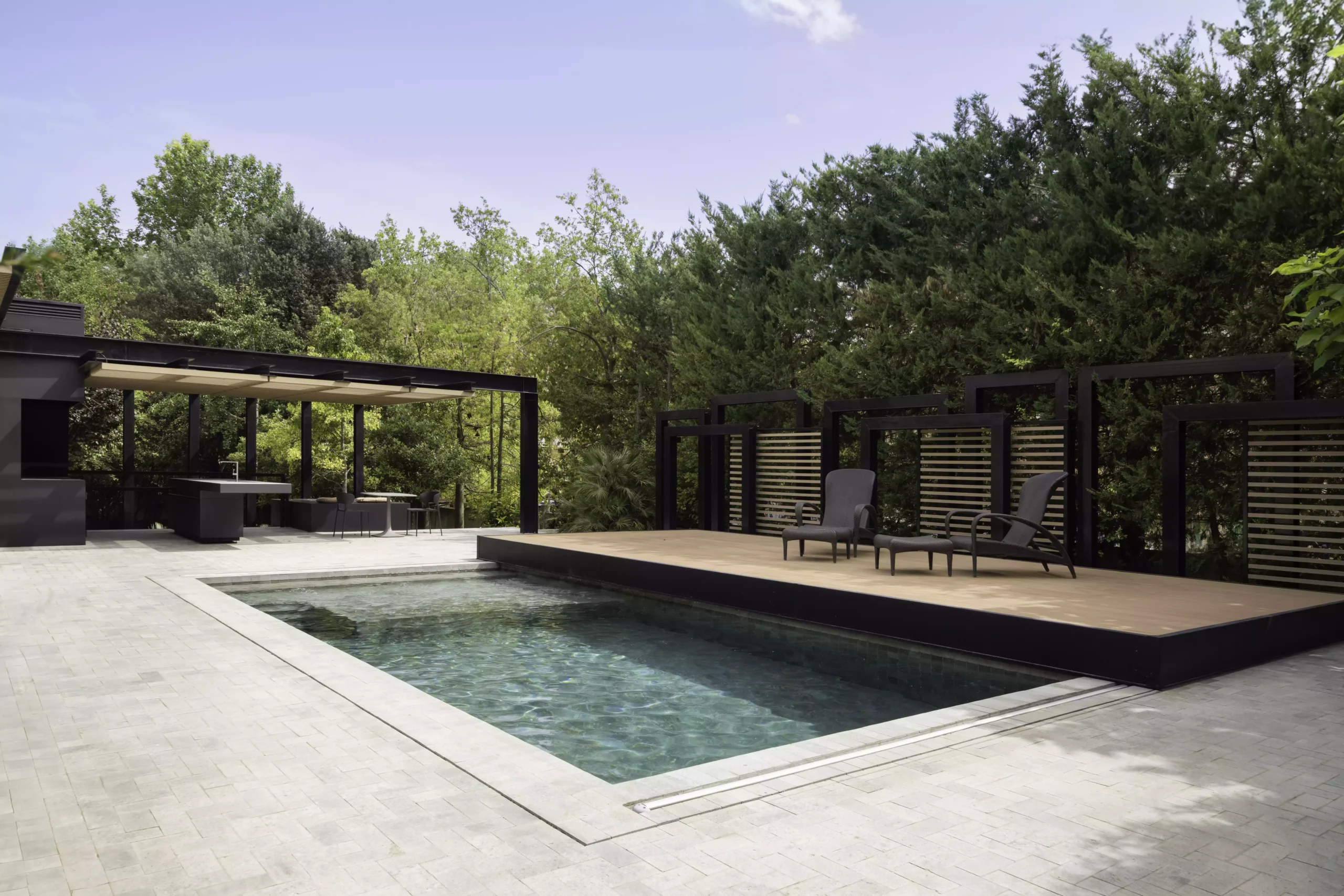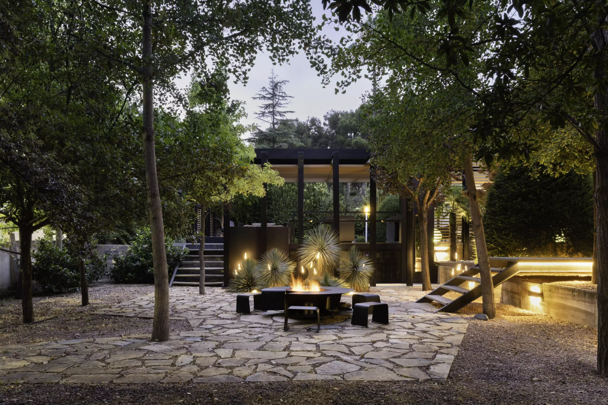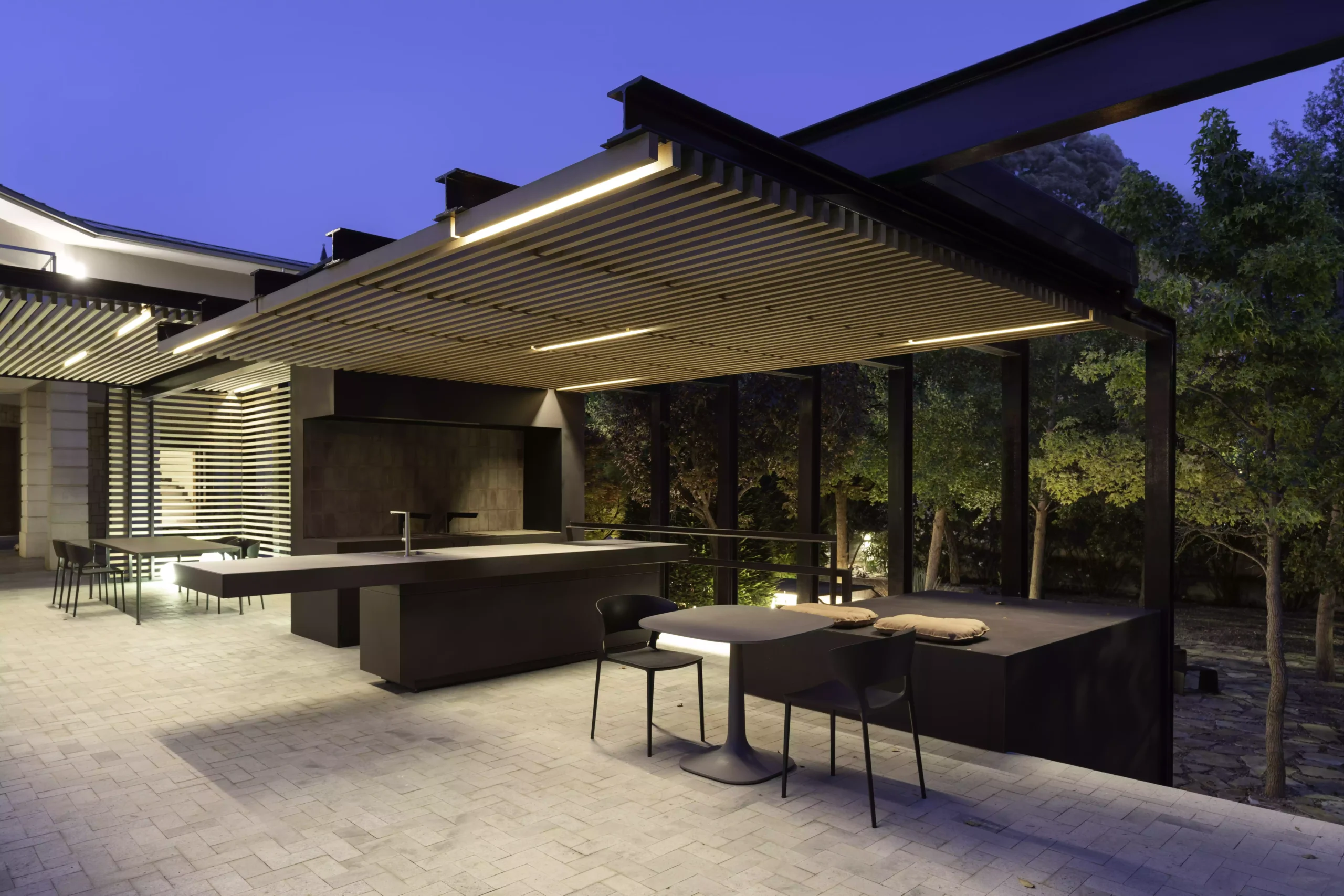 El eje director de este nuevo espacio exterior es la pérgola. La pérgola adquiere diversas funciones entre las cuales destacan la de elemento generador y vertebrador de espacios de diferente índole. El carácter poético de la intervención responde a una organización mediante la separación de los elementos naturales fundamentales. Estos son el agua representada por la zona de baño, la tierra representada por el jardín trasero, el fuego representado por la zona de chimenea-barbacoa y el aire representado por el gran voladizo generado por la propia pérgola.