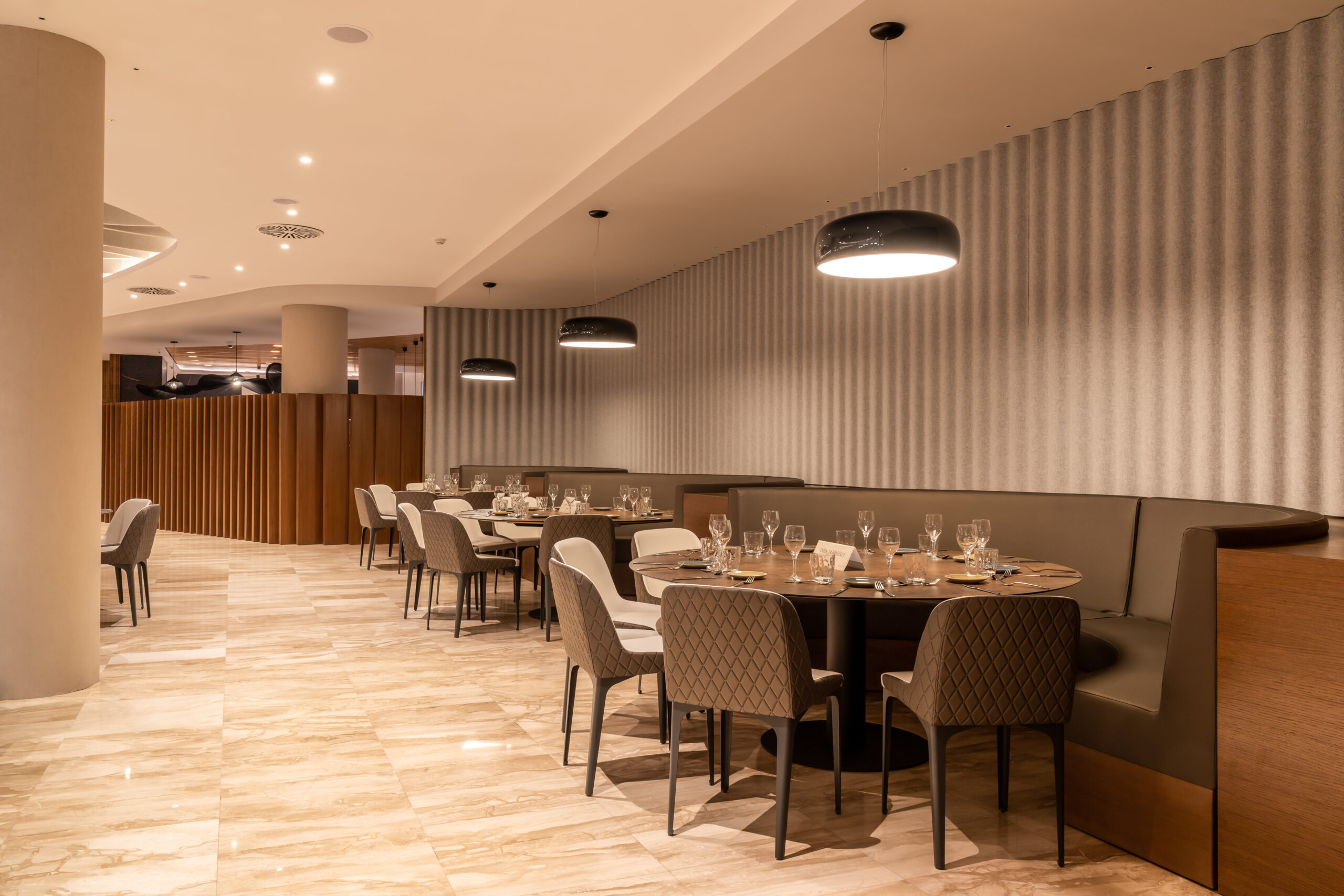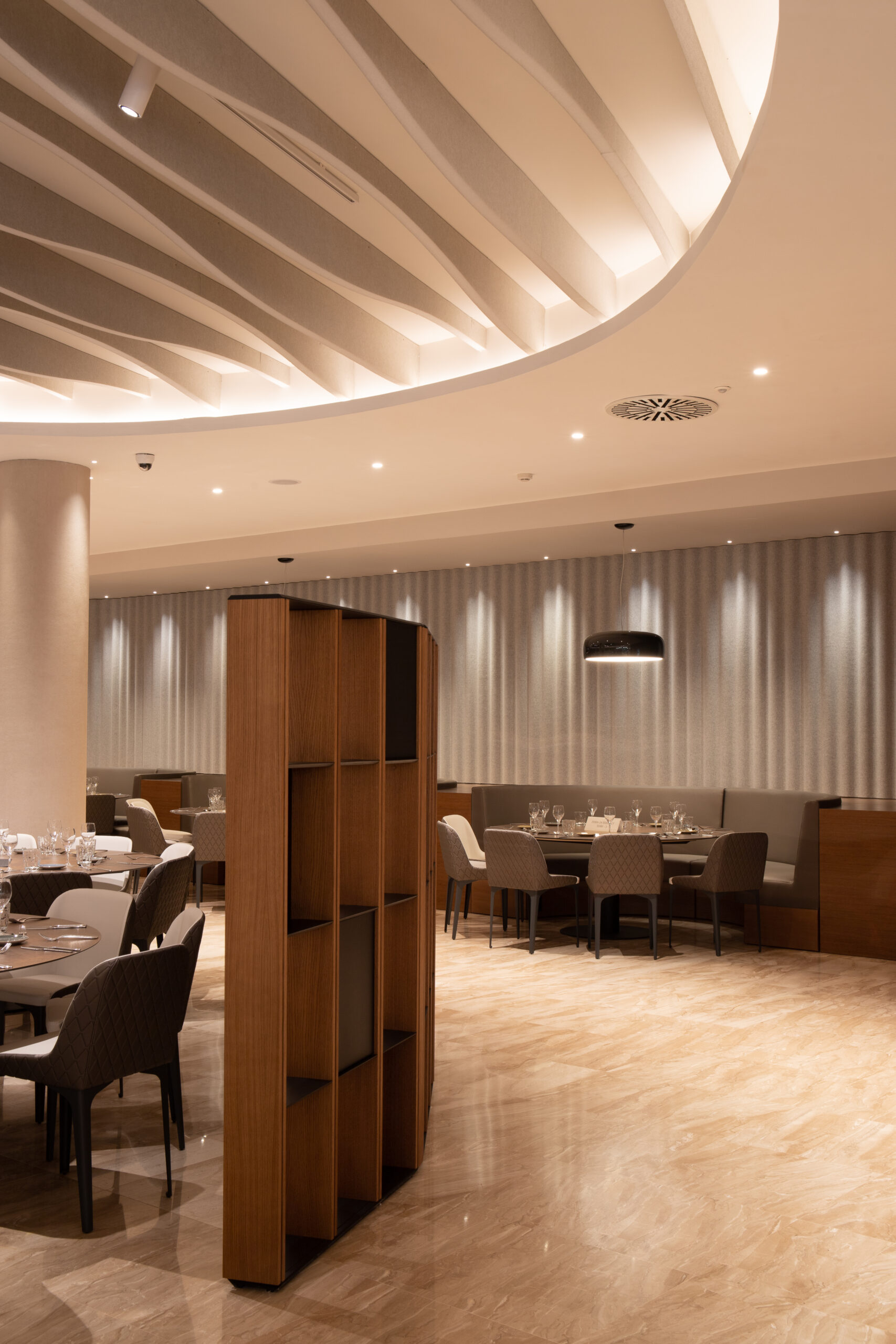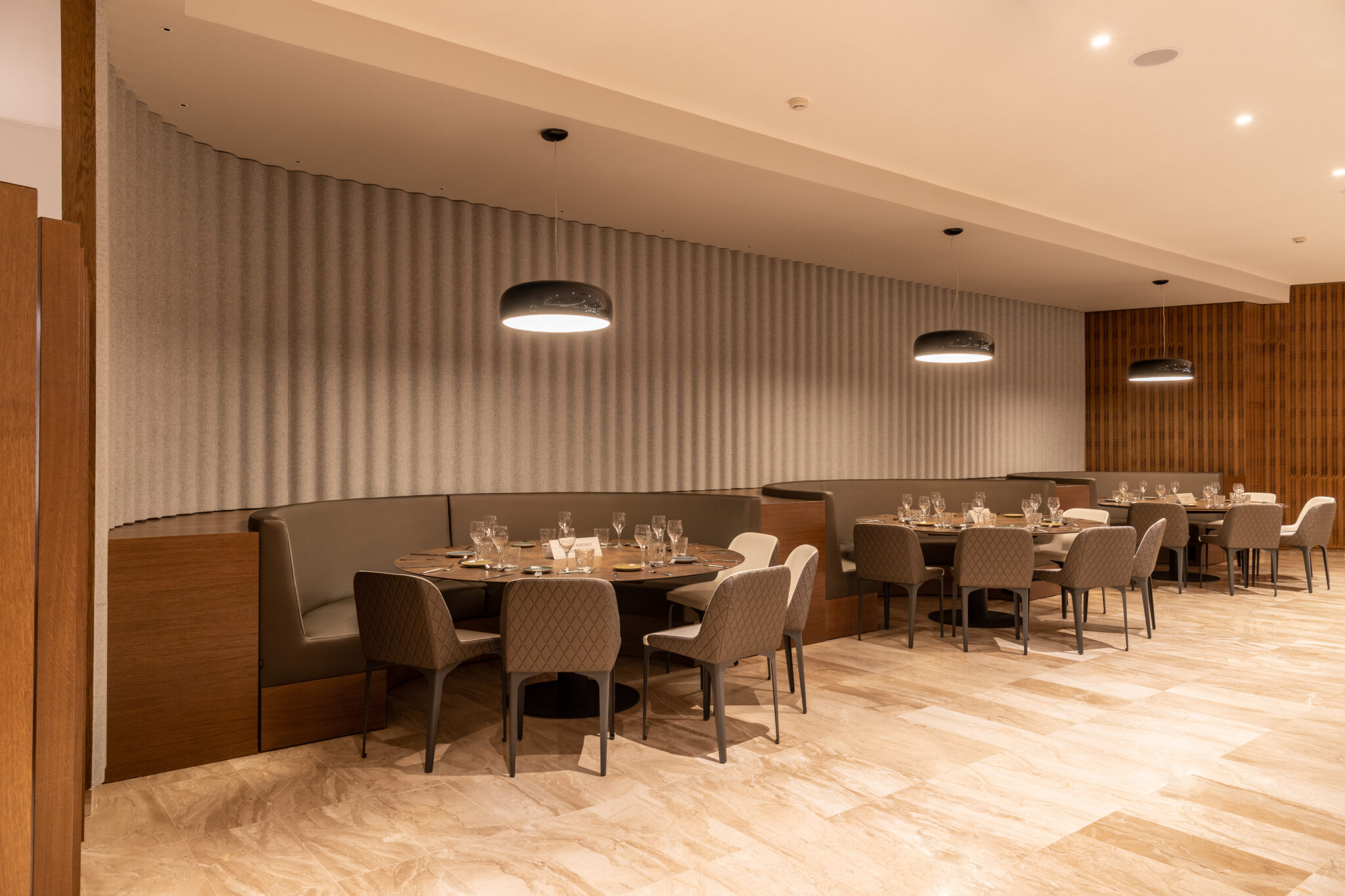 La atención meticulosa a la acústica en todos los espacios garantiza una experiencia gastronómica sin igual. Desde los revestimientos verticales y horizontales hasta los techos elípticos con material acústico Ecophon, cada detalle se ha considerado para crear un ambiente donde la excelencia culinaria se mezcla con una atmósfera acogedora y visualmente impactante.