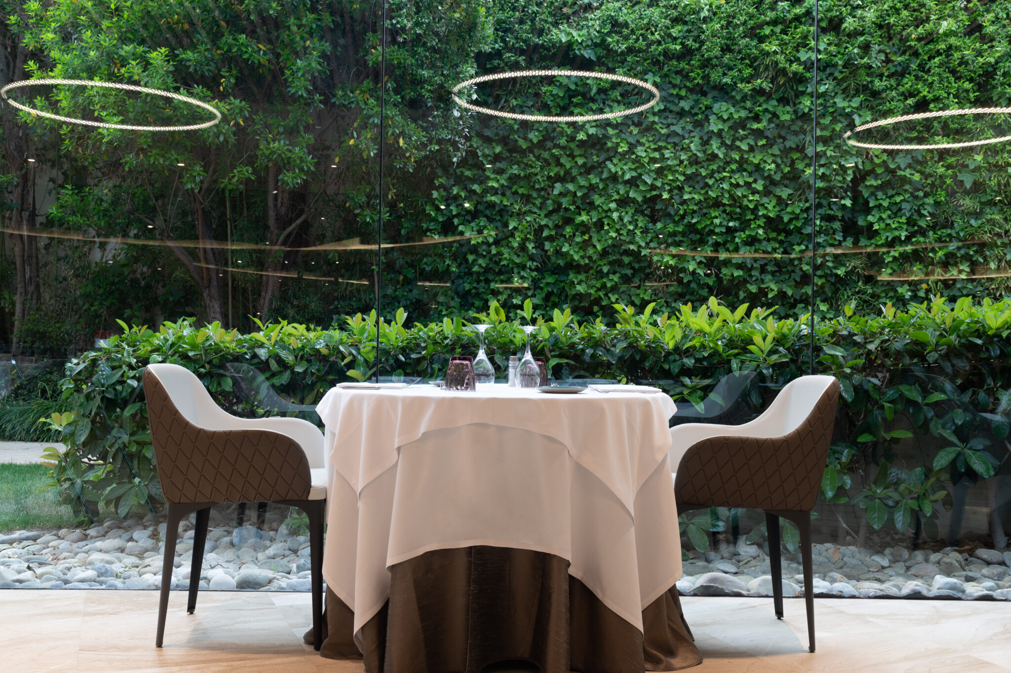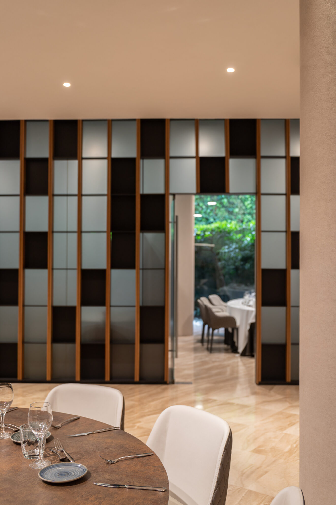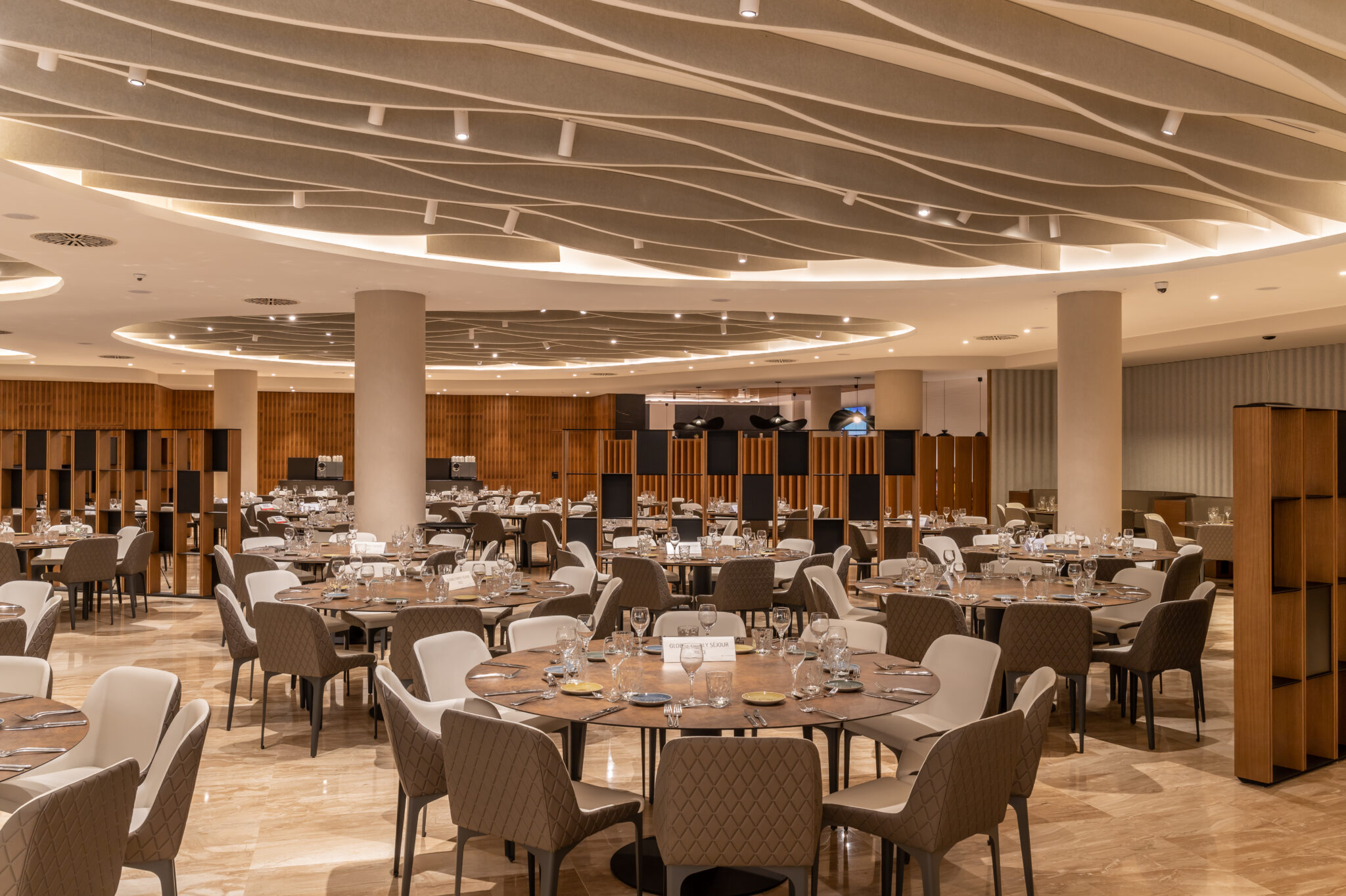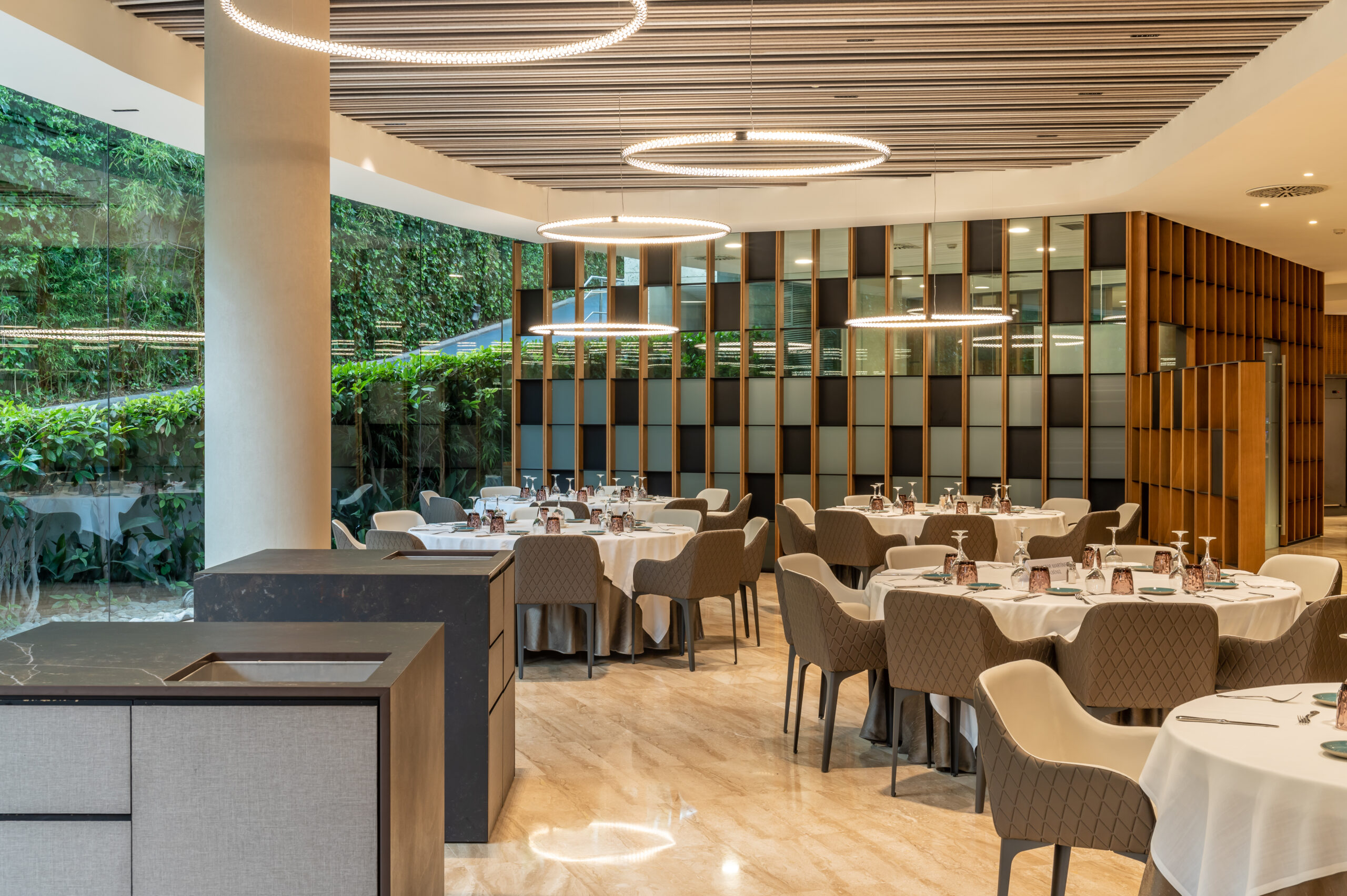 La atención meticulosa a la acústica en todos los espacios garantiza una experiencia gastronómica sin igual. Desde los revestimientos verticales y horizontales hasta los techos elípticos con material acústico Ecophon, cada detalle se ha considerado para crear un ambiente donde la excelencia culinaria se mezcla con una atmósfera acogedora y visualmente impactante.