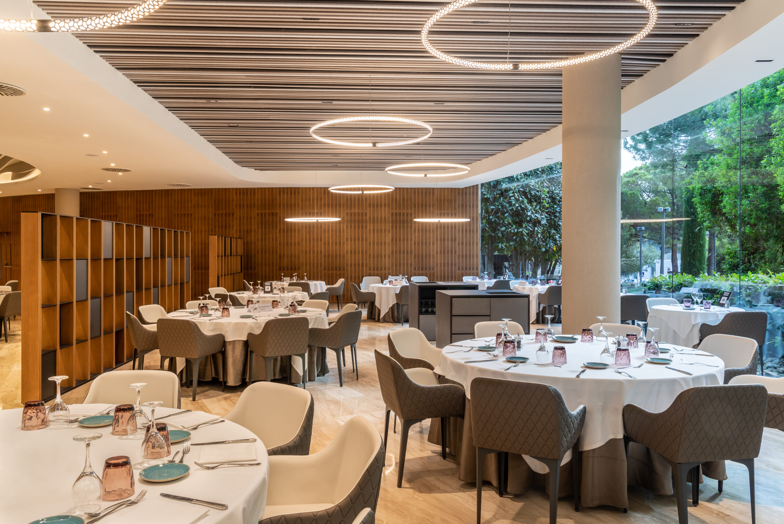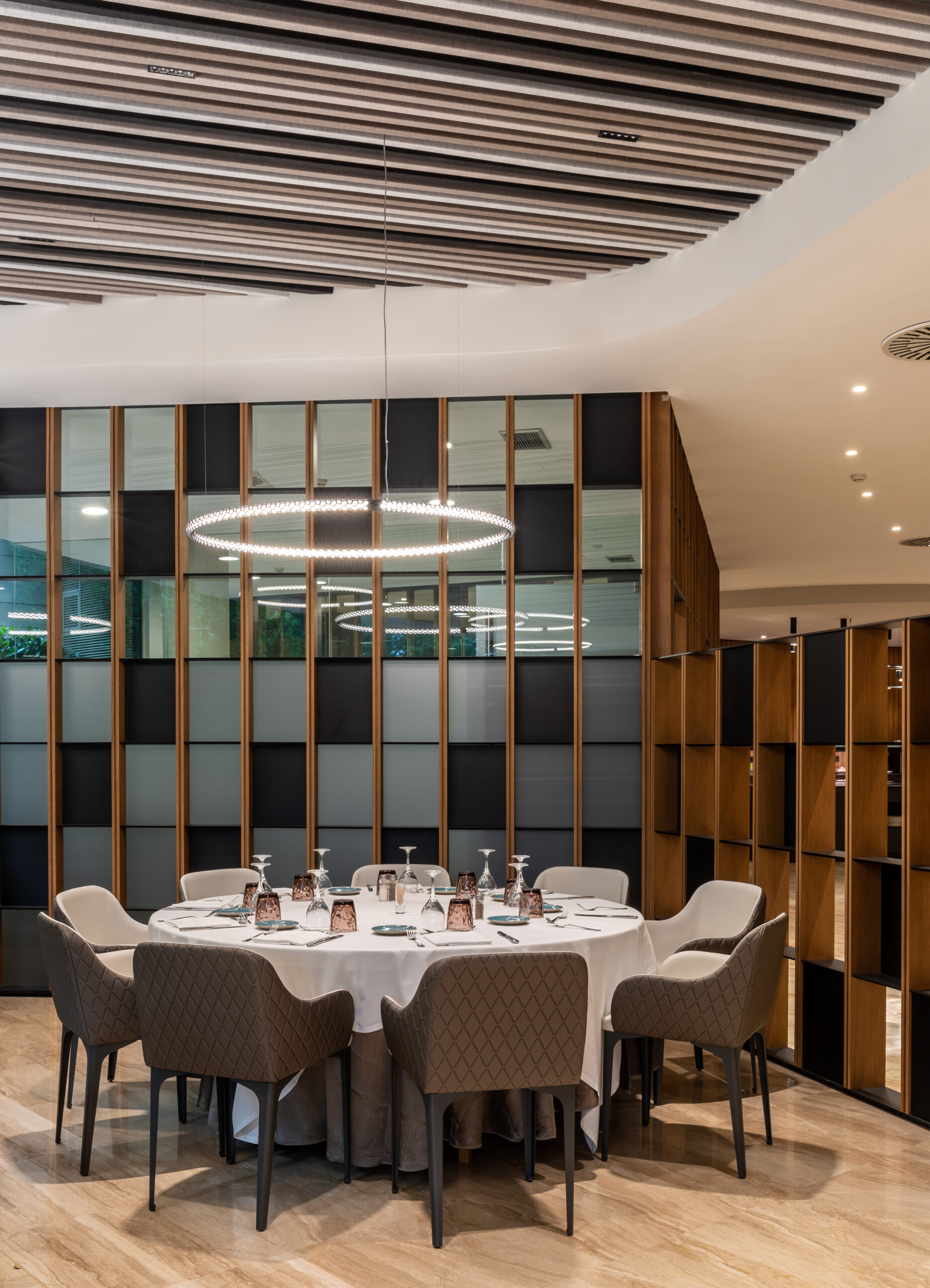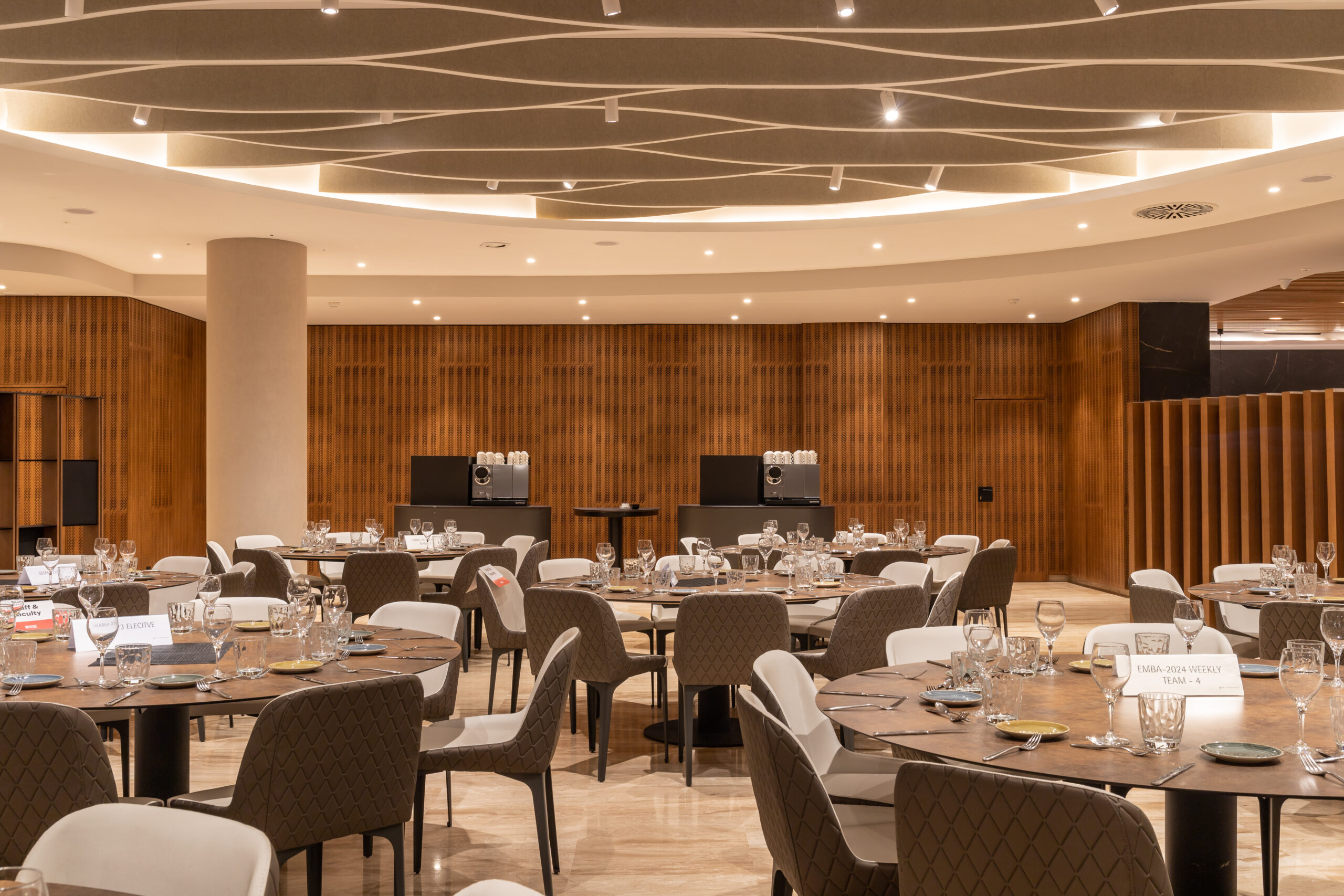 Enfrentándonos a la complejidad de un edificio circular, el diseño se adapta perfectamente a la arquitectura del Campus Norte de la Universidad IESE Business School, logrando una fusión magistral de forma y función. El espacio de mil metros cuadrados se organiza cuidadosamente en tres áreas distintas: la sala principal, la sala a la carta y las salas privadas, todas elles convergiendo en una unidad espacial armoniosa.