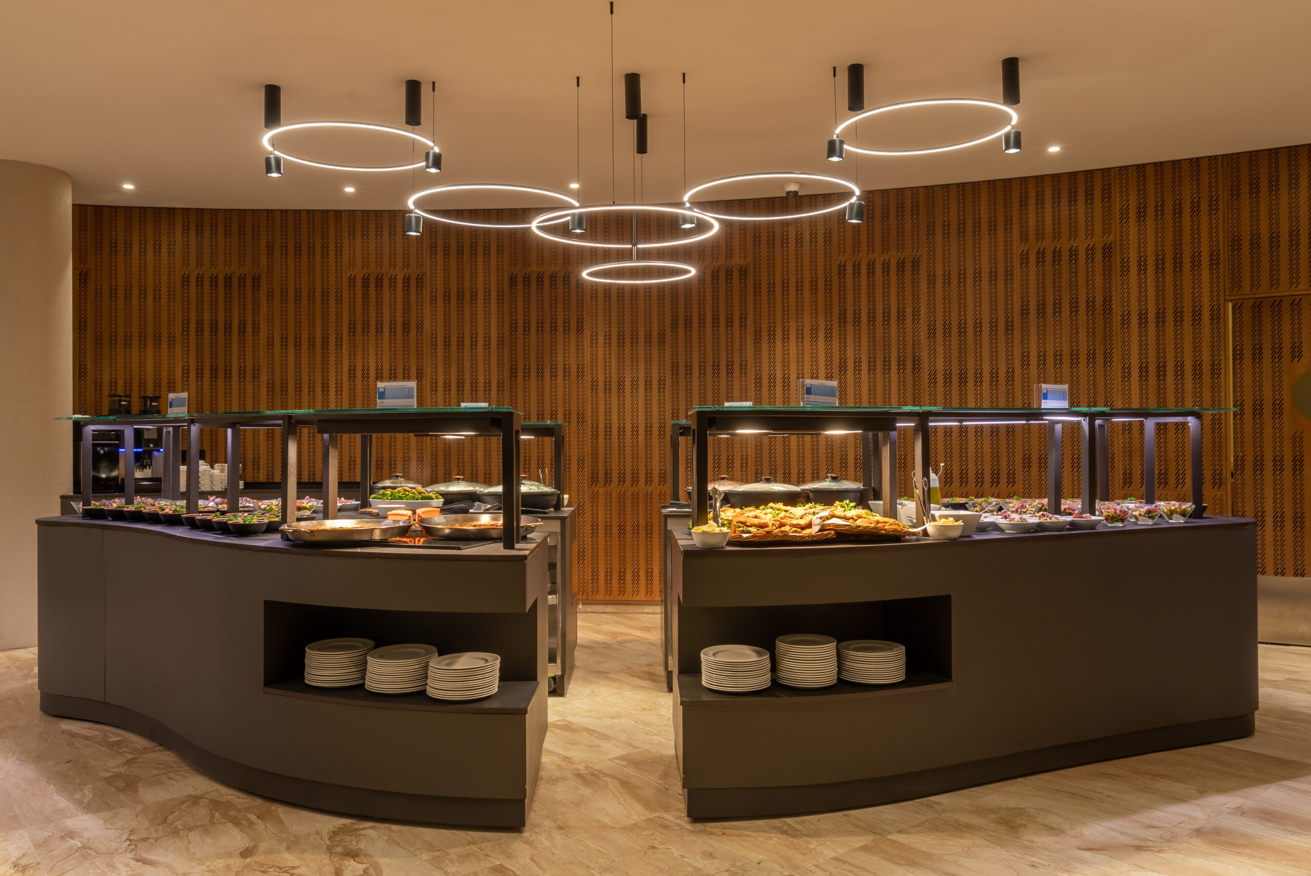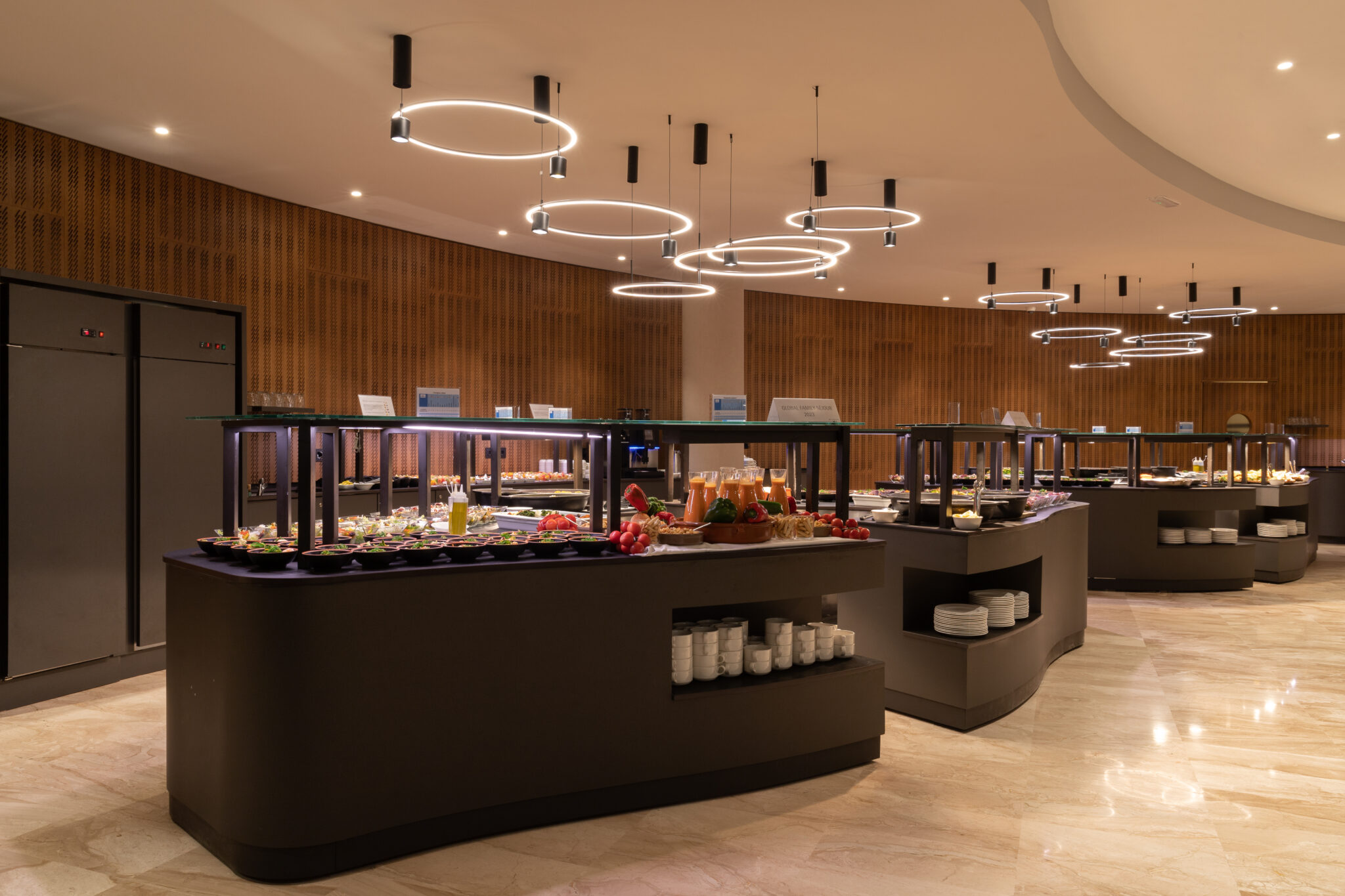 Las dos islas de “showcooking” en la sala principal no solo destacan por la calidad de su formes y ejecución, sino que también sirven como puntos de atracción central para los usuarios.
