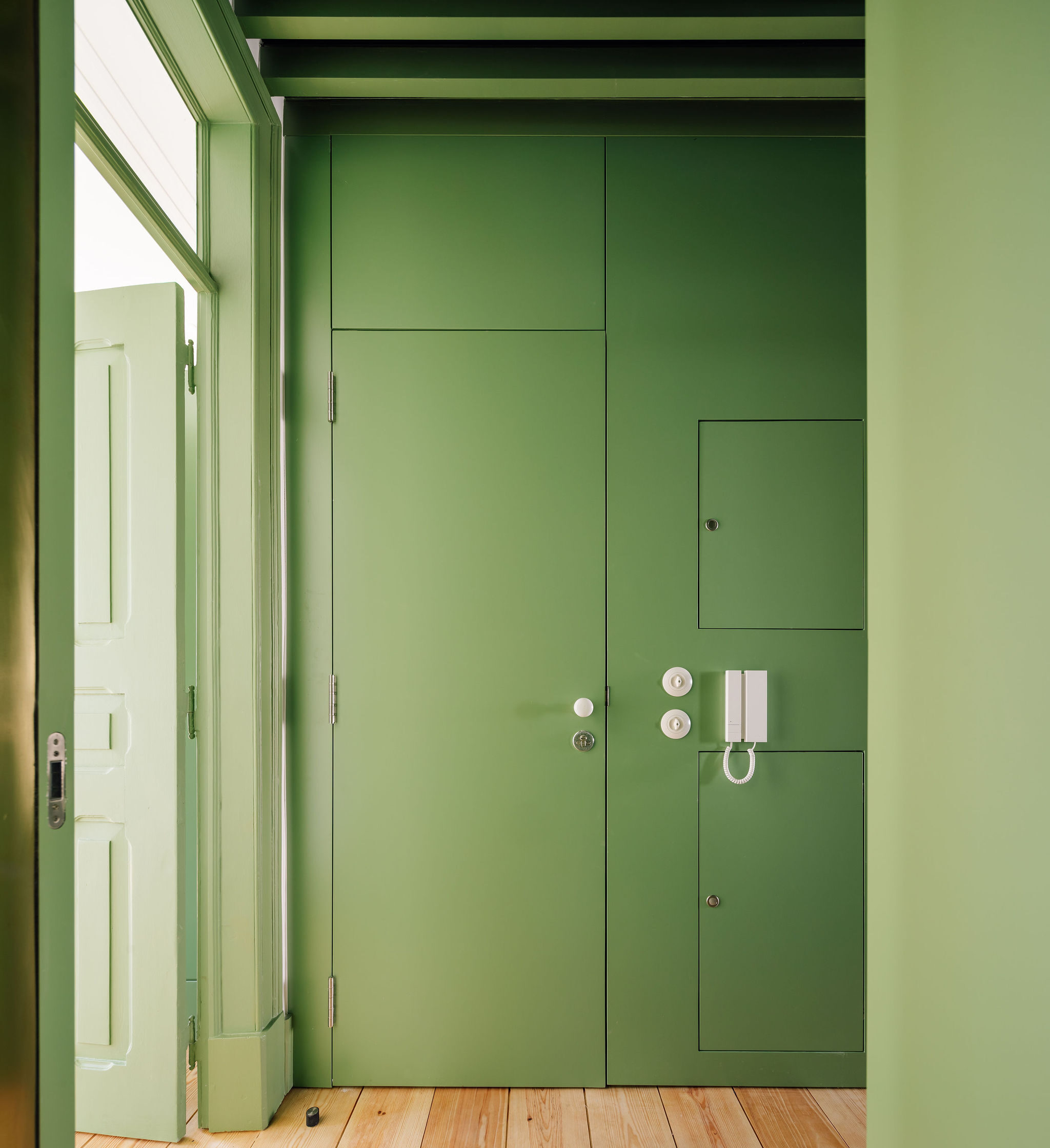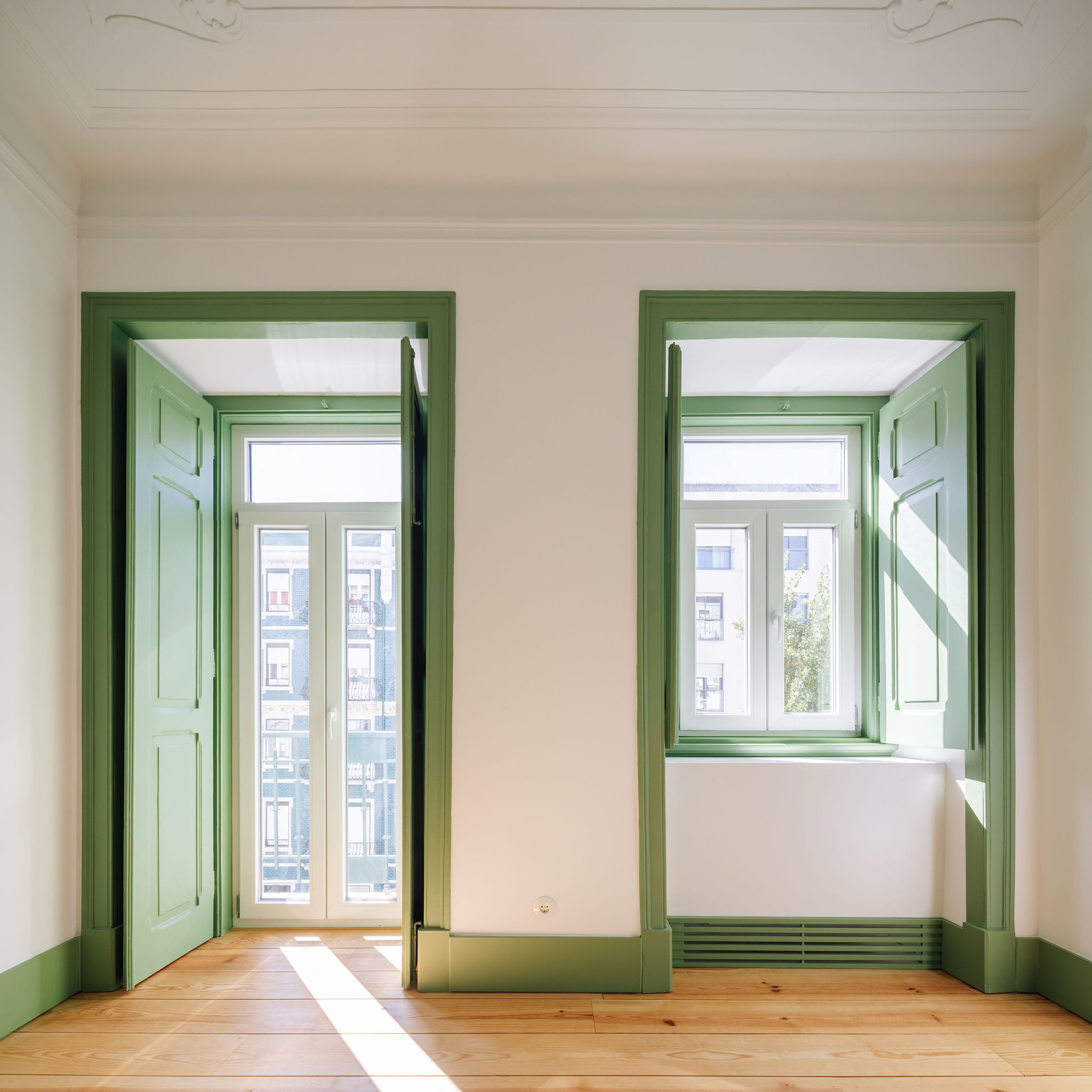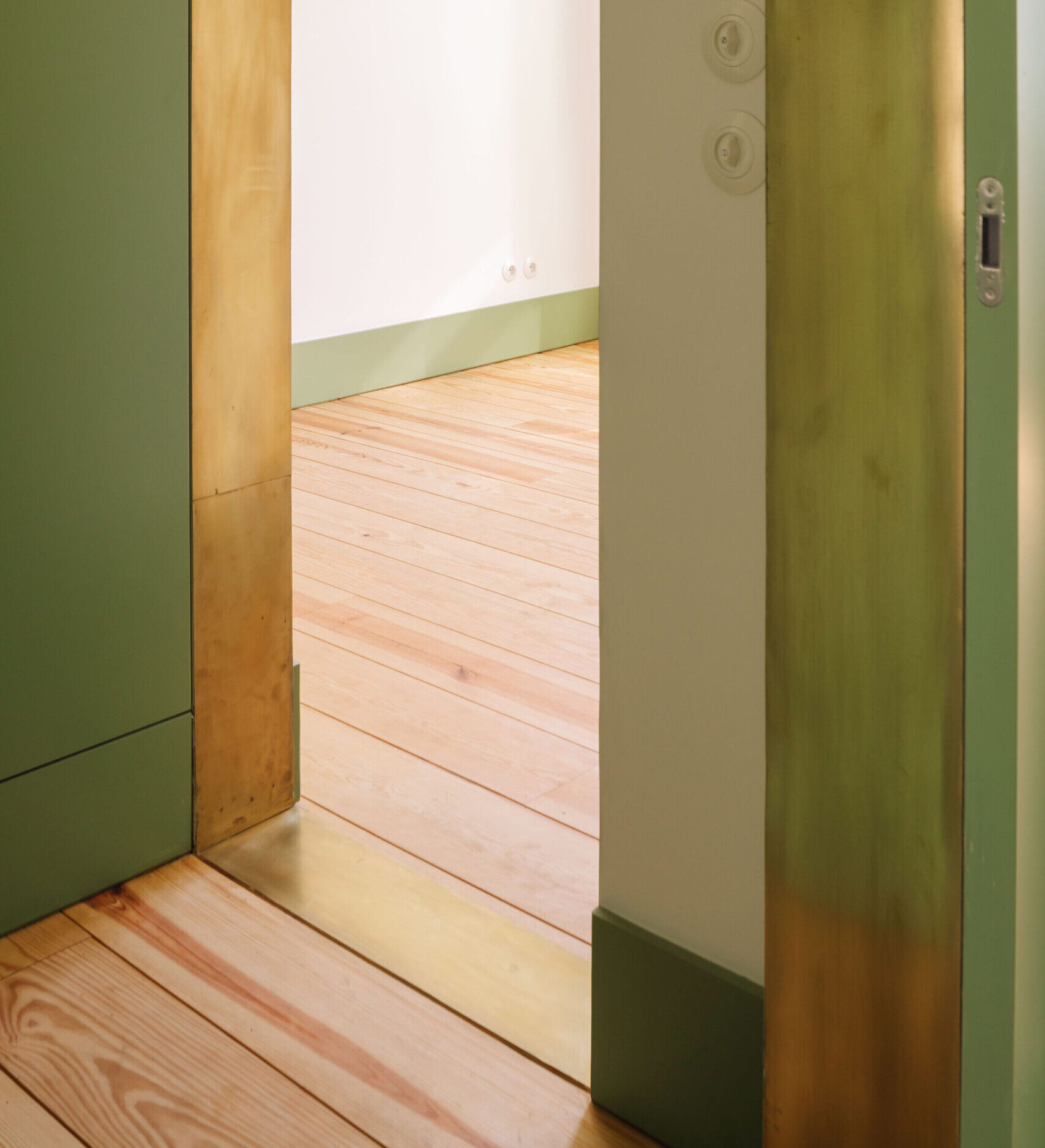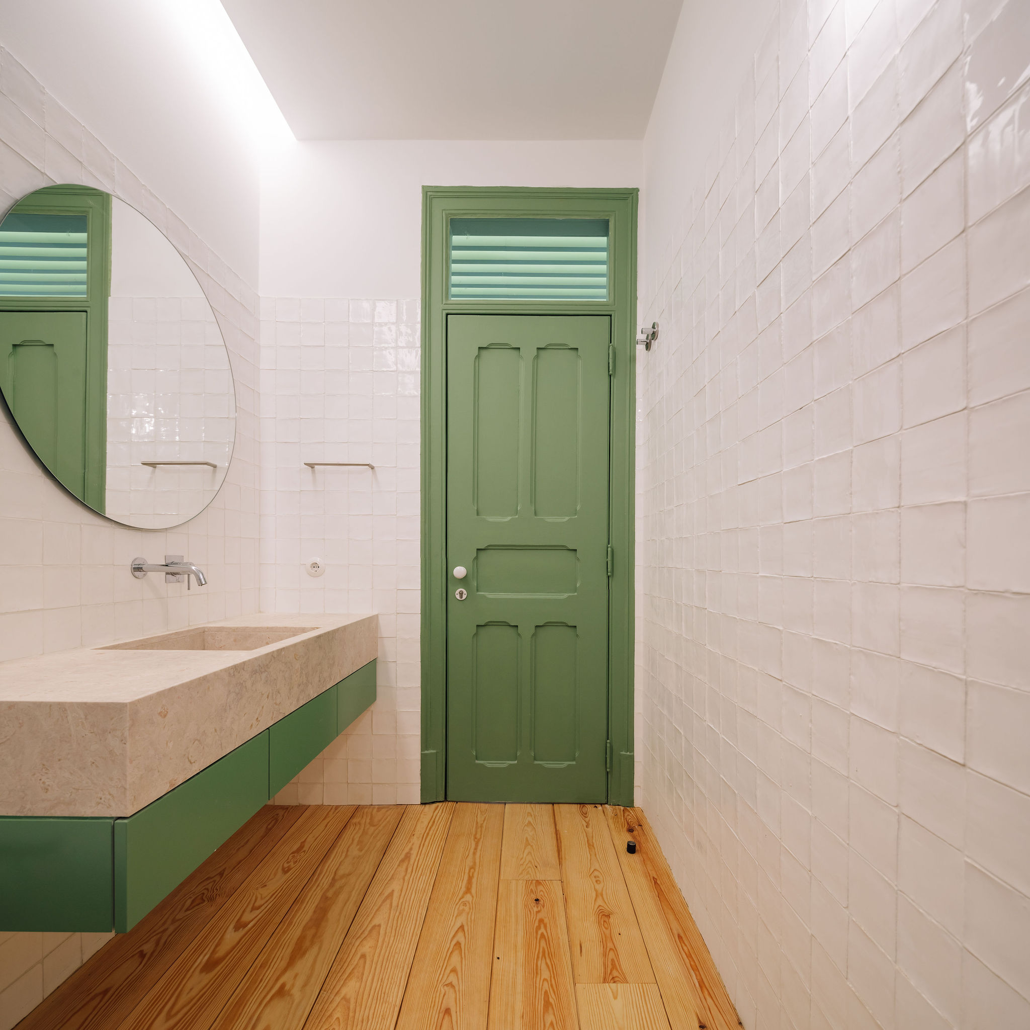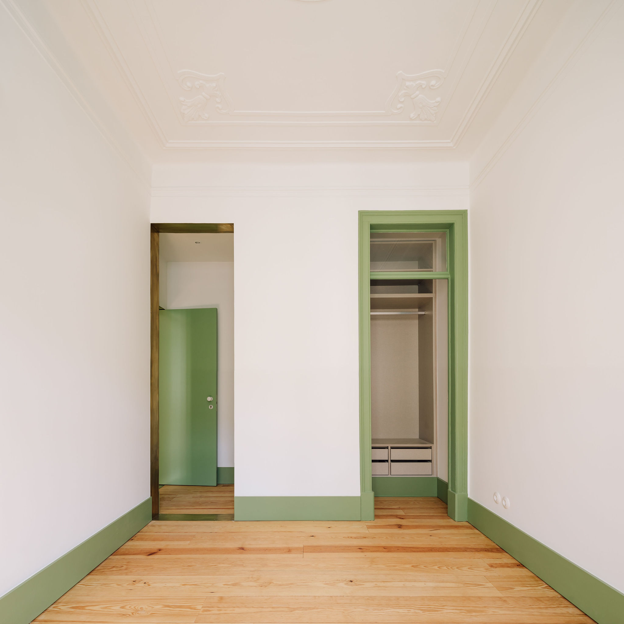 A materialidade foi cuidadosamente trabalhada para homogeneizar os espaços e reforçar a identidade original do edifício, utilizando elementos típicos da época, como o pavimento de soalho de madeira, a pedra de Lioz e azulejo manual. O contraste entre as paredes brancas e as carpintarias em verde pastel — cor característica do período — é acentuado por detalhes em chapa de latão, que evidenciam, de forma quase cirúrgica, as incisões presentes nas paredes.