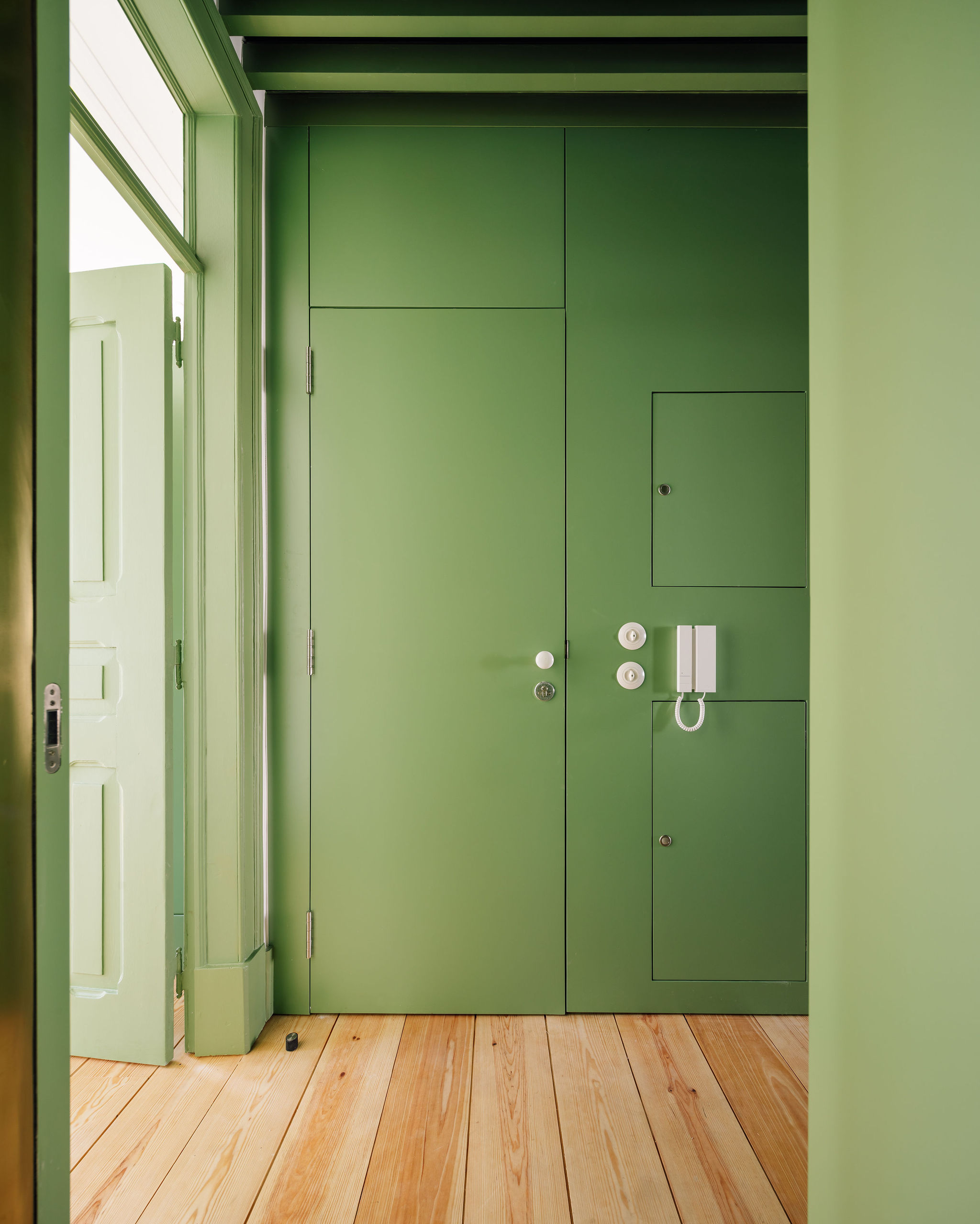 La materialidad fue cuidadosamente trabajada para homogeneizar los espacios y reforzar la identidad original del edificio, utilizando elementos típicos de la época, como el suelo de madera, la piedra de Lioz y azulejos artesanales. El contraste entre las paredes blancas y las carpinterías en verde pastel —color característico del periodo— se acentúa con detalles en chapa de latón, que evidencian de forma casi quirúrgica las incisiones presentes en las paredes.