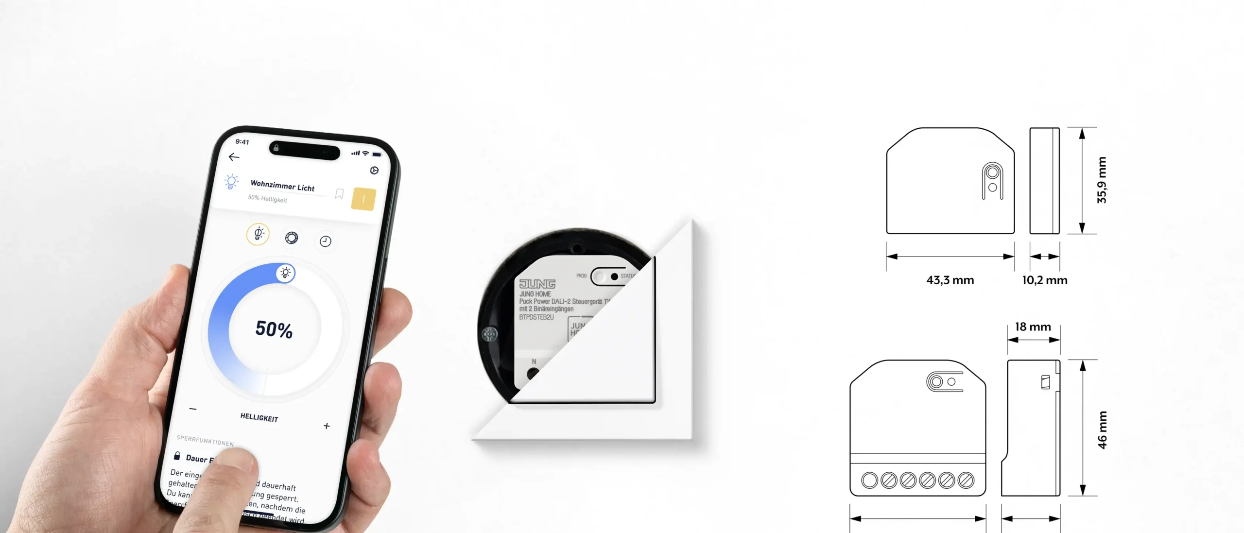 Los actuadores compactos JUNG HOME Pucks gestionan luz y clima integrando la medición de consumo eléctrico. ⚡ Funcionan mediante tecnología Bluetooth Mesh con cifrado automático, garantizando una transmisión de datos segura.
