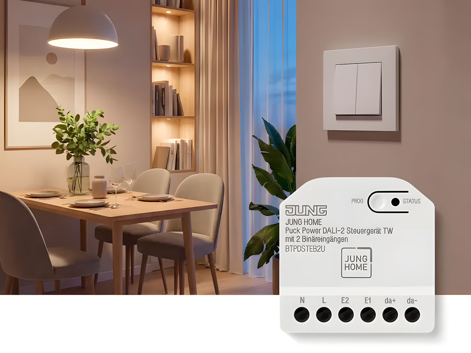 Una aplicación típica de los JUNG HOME Pucks es en la iluminación. En esta área destaca el regulador Puck Power DALI-2 con tecnología Tunable White, que permite un ajuste preciso de la intensidad lumínica, así como el cambio de la temperatura de color de la luz. Así, el sistema puede pasar de una luz fría durante el día a tonos más cálidos para el horario nocturno. Se puede completar la instalación con el Puck actuador de conmutación de dos canales, el cual ofrece la posibilidad de gestionar circuitos independientes de luz o combinar una carga lumínica con una aplicación de calefacción.