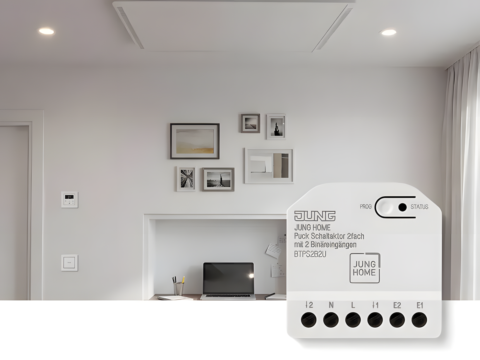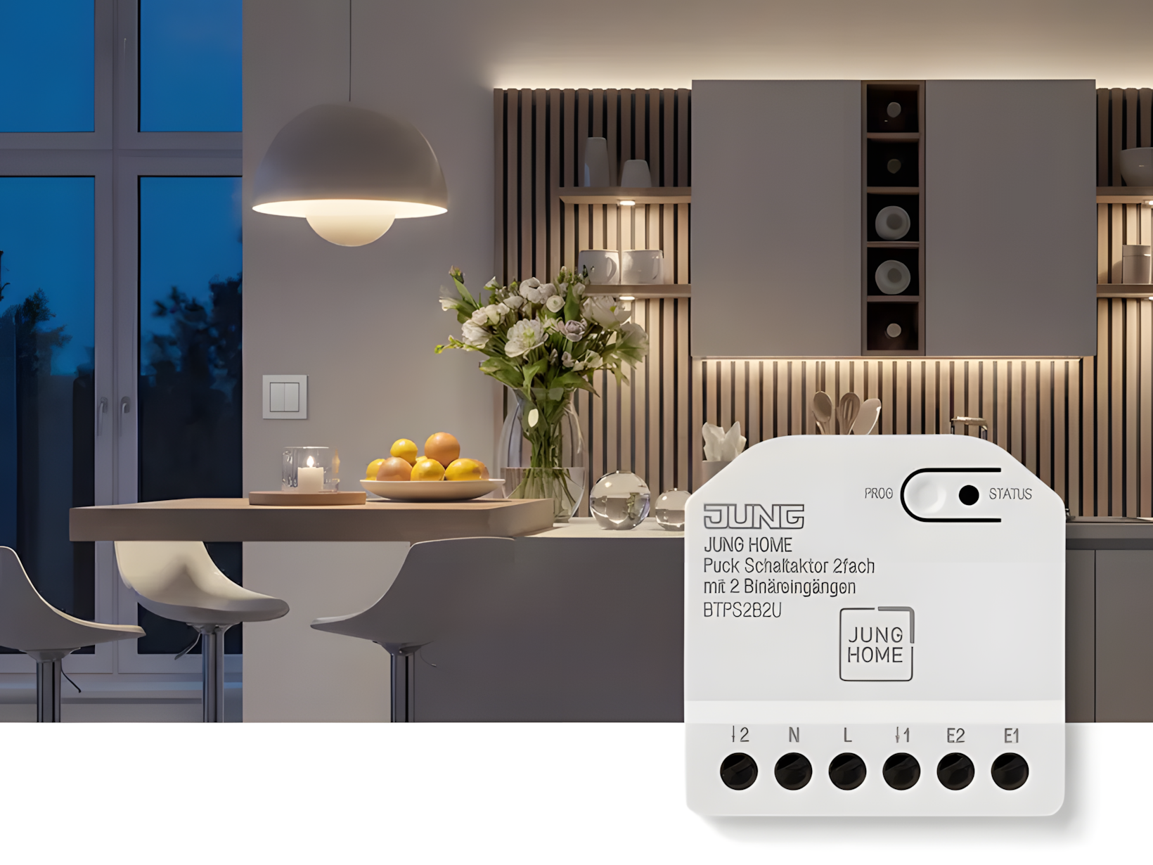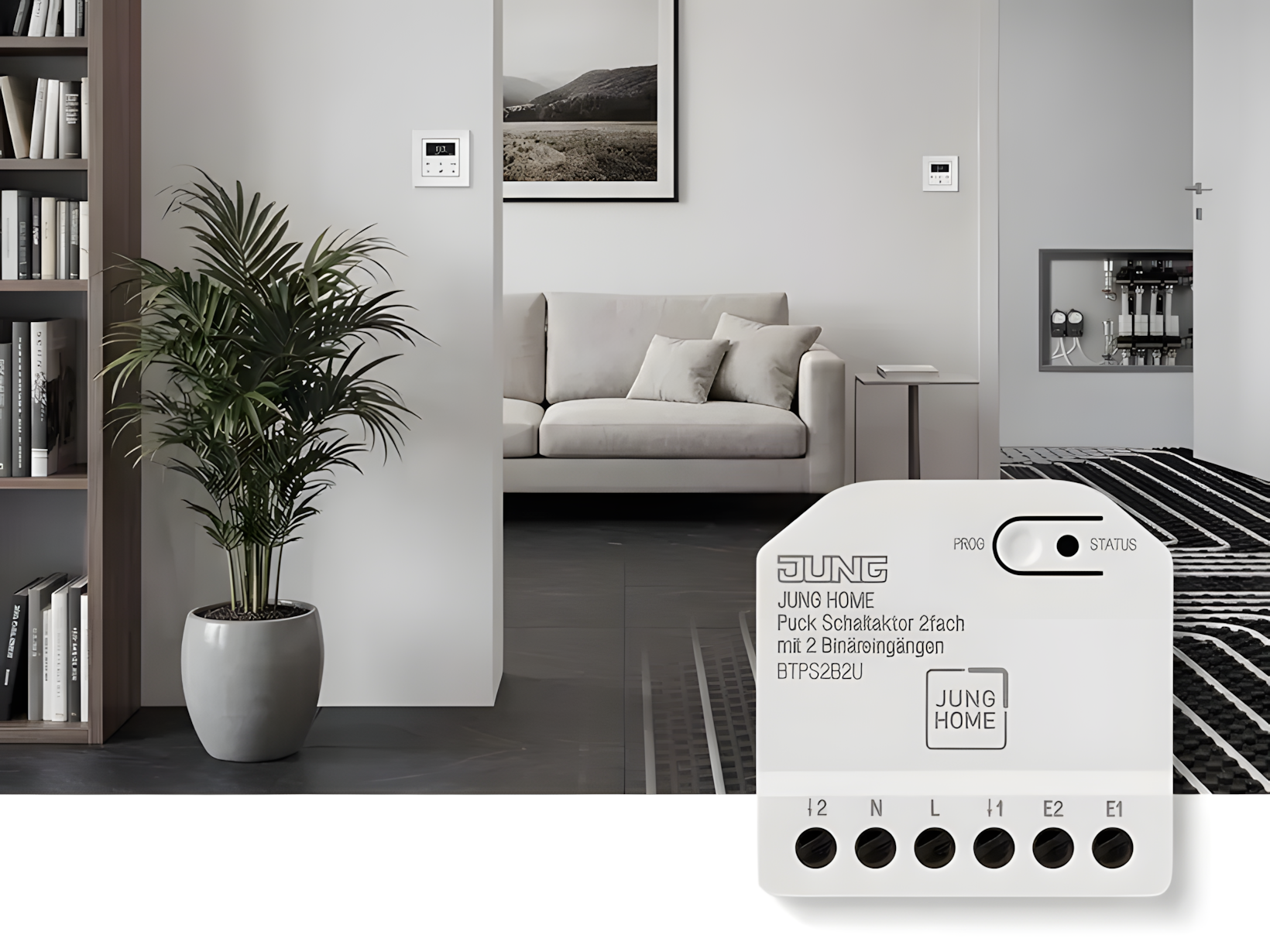 - Los actuadores compactos JUNG HOME Pucks gestionan la iluminación y la climatización mientras miden el consumo eléctrico.