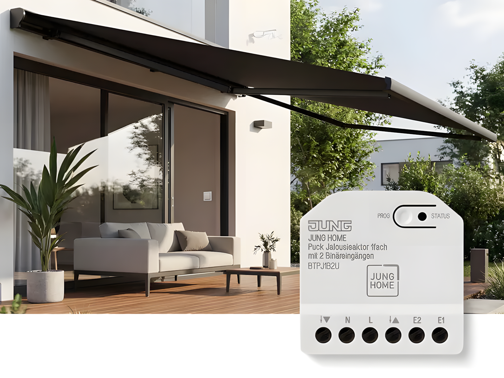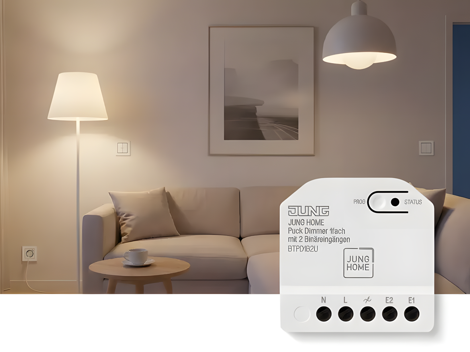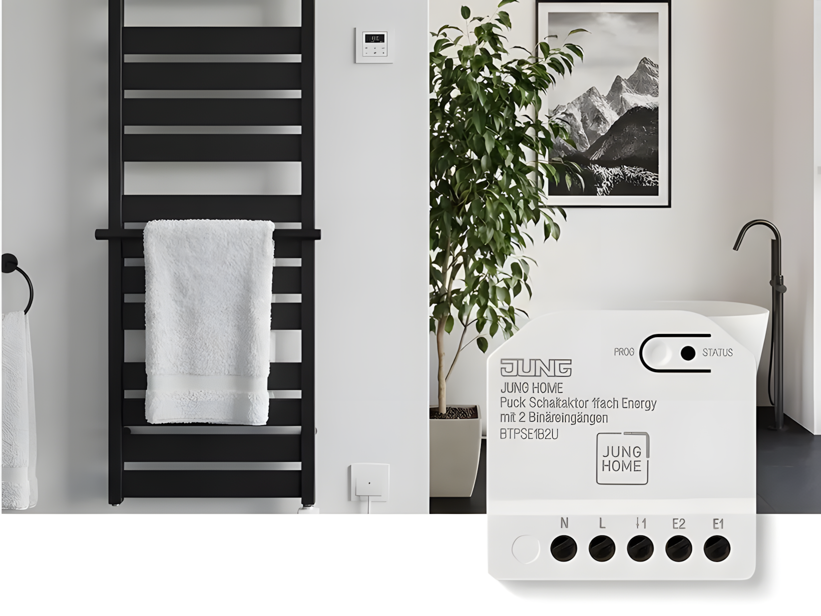 - Los actuadores compactos JUNG HOME Pucks gestionan la iluminación y la climatización mientras miden el consumo eléctrico.