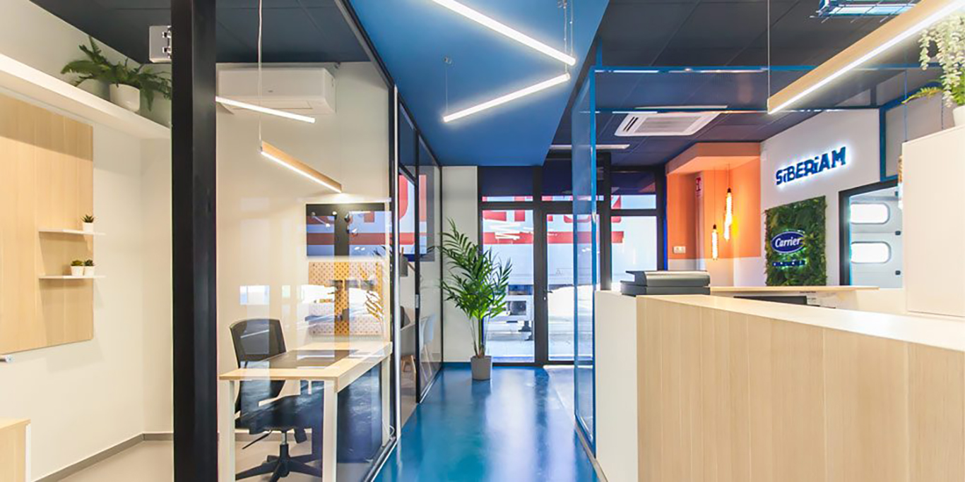 Nos decantamos por un estilo industrial acorde a la actividad de la empresa y dimos protagonismo al azul, color corporativo por excelencia, tanto en los materiales como en el mobiliario y elementos decorativos.