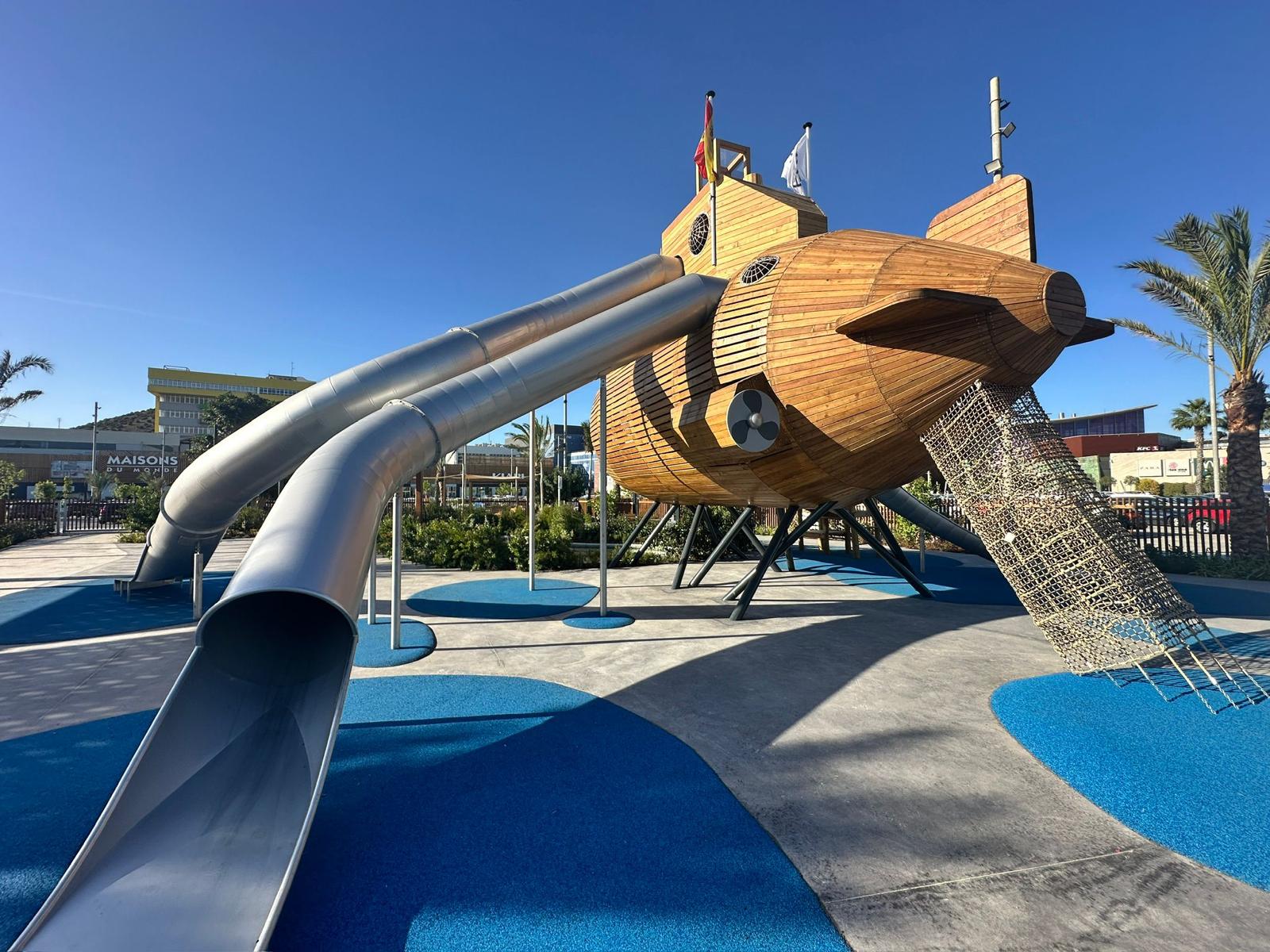La gran protagonista de esta reforma es la zona de juegos, instalada en la antigua superficie del aparcamiento y donde ahora encontramos un oasis compuesto por un palmeral, zonas estanciales, árboles singulares y un estanque. A ese espacio con agua se asoma un escultórico juego de niños con forma de submarino, que rinde homenaje a Isaac Peral, científico y militar nacido en Cartagena en 1851