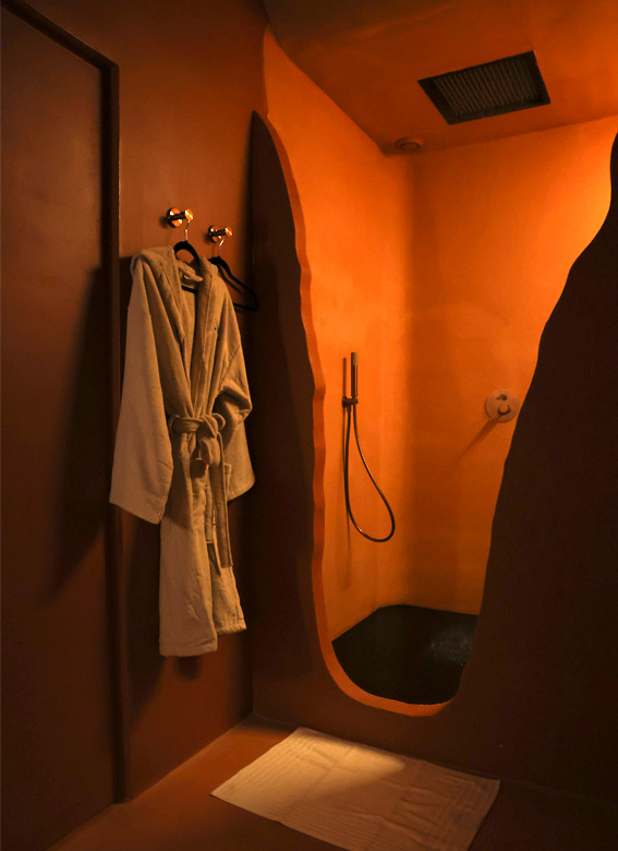 El baño se encuentra al fondo del pasillo. Previo a este se situa la zona de lavabo cumpliendo la función de hall tanto del aseo como de la sala de ducha, la sala Cosmos. Esta es la sala dónde culmina la experiencia después del masaje. La entrada a la ducha, con esa forma de curvas abruptas e irregulares invita a sentir que viajas en otra dimensión ya que además entrarás en contacto con único elemento externo a Marte, el agua. Y para finalizar, podrás relajarte o tomar un té en la butaca y mesa auxiliar propuestas para ello.
