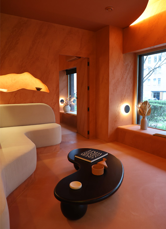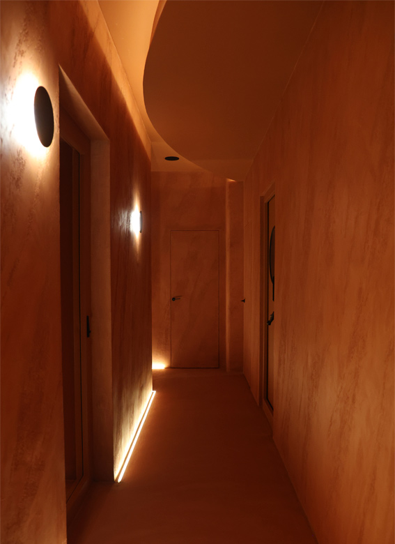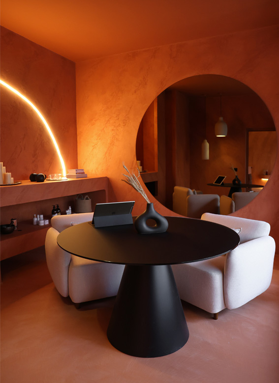 Este tiene una conexión directa con la recepción a través del techo circular que recorre ambas estancias creando así continuidad entre ellas. Es el núcleo central dónde se situan las salas de masajes.