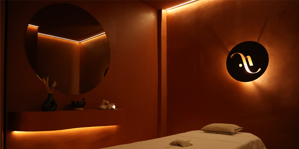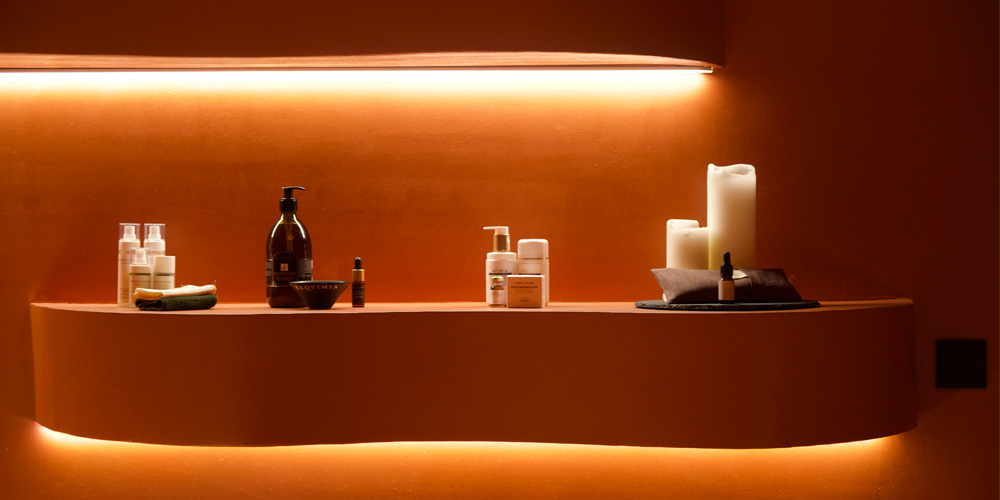 Sus estanterías de formas curvas han sido diseñadas para exponer los productos que utilizan para aplicar en los masajes.