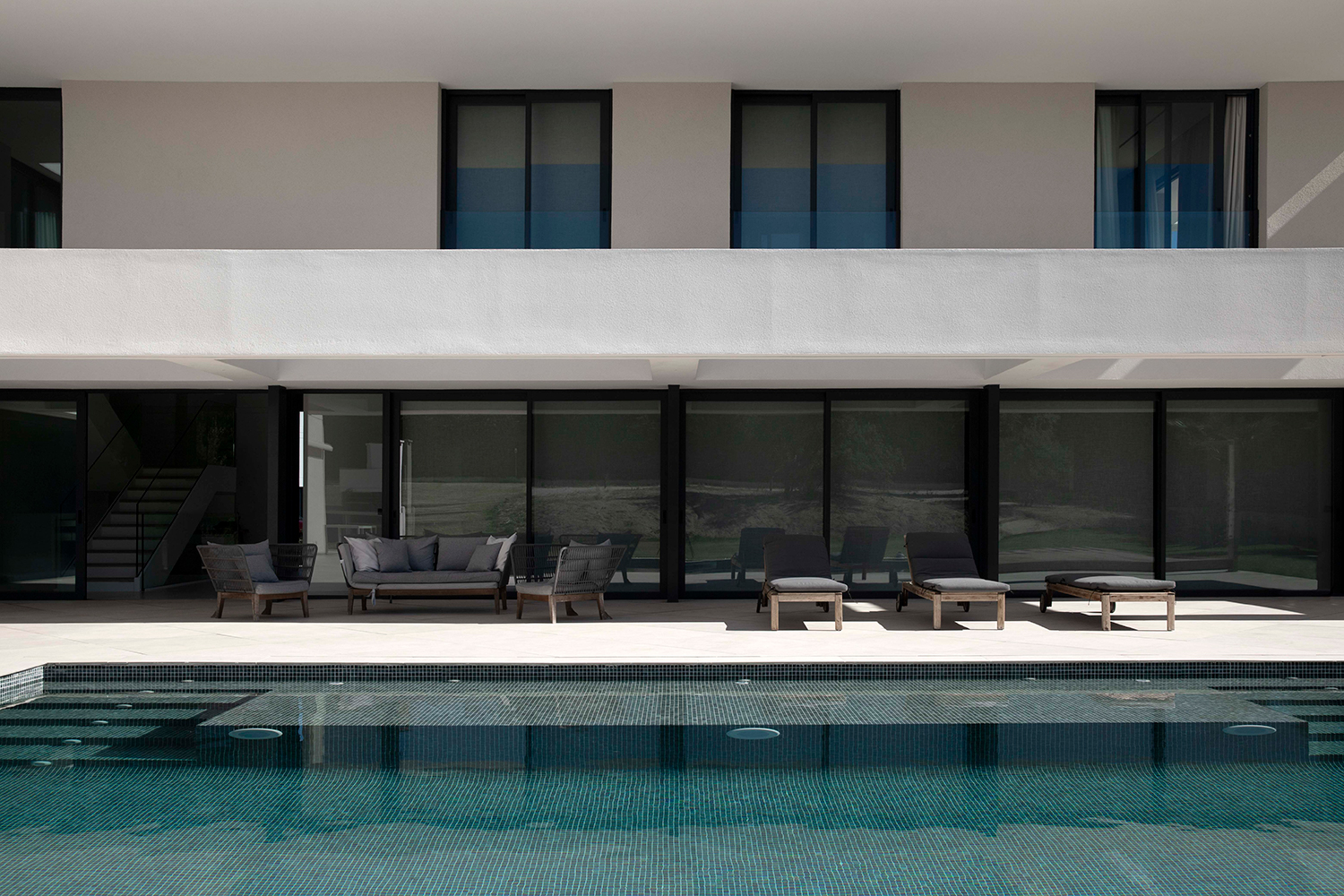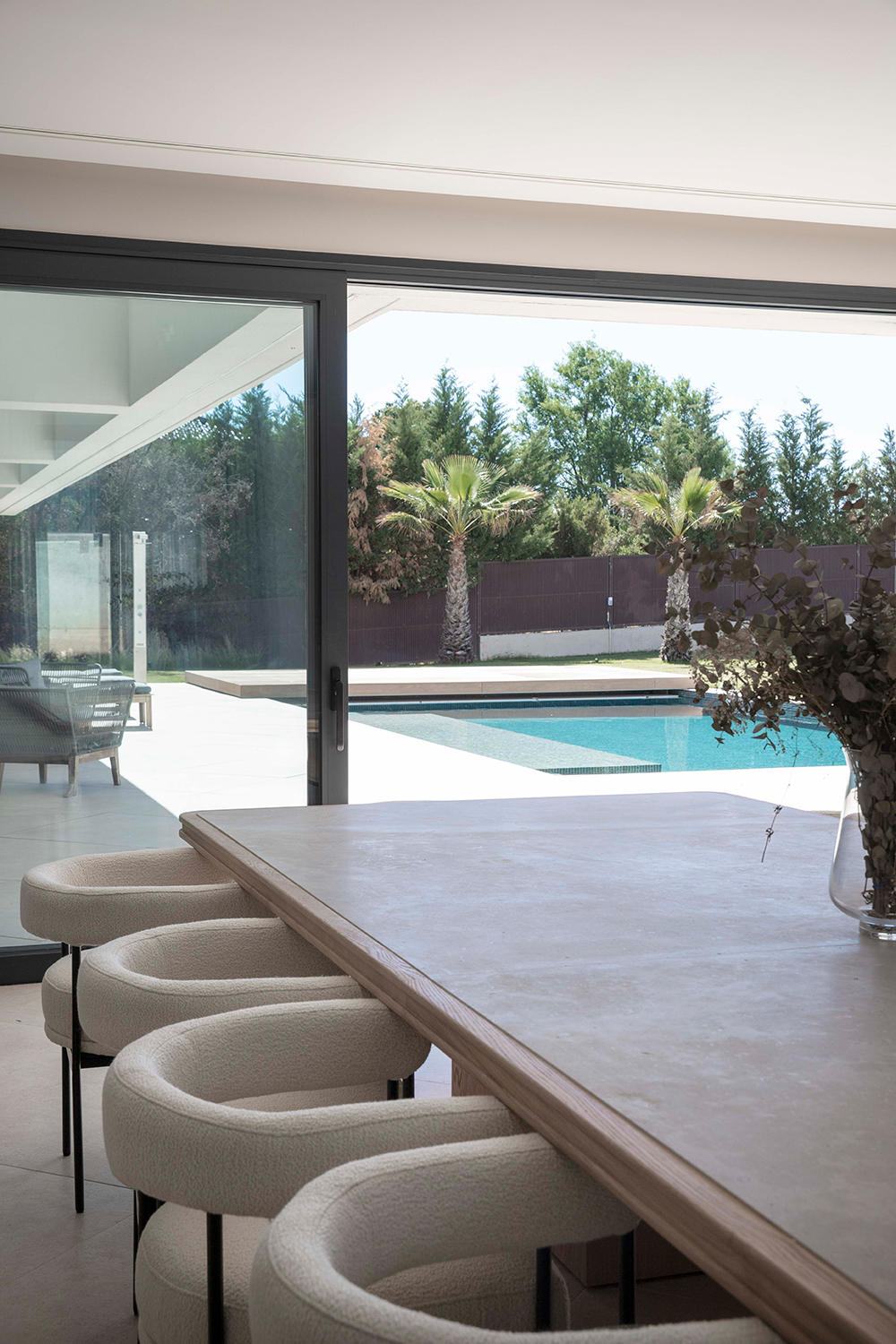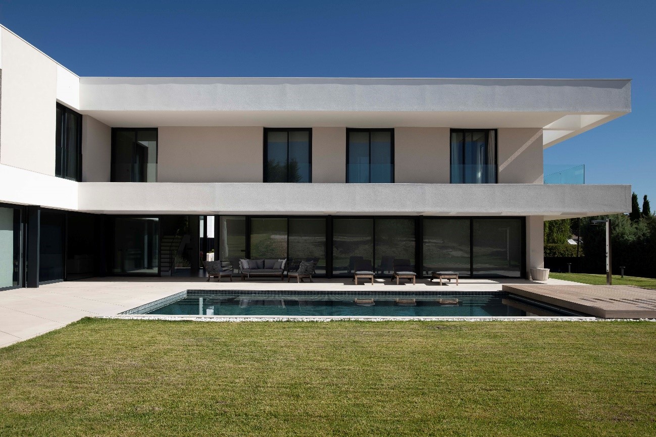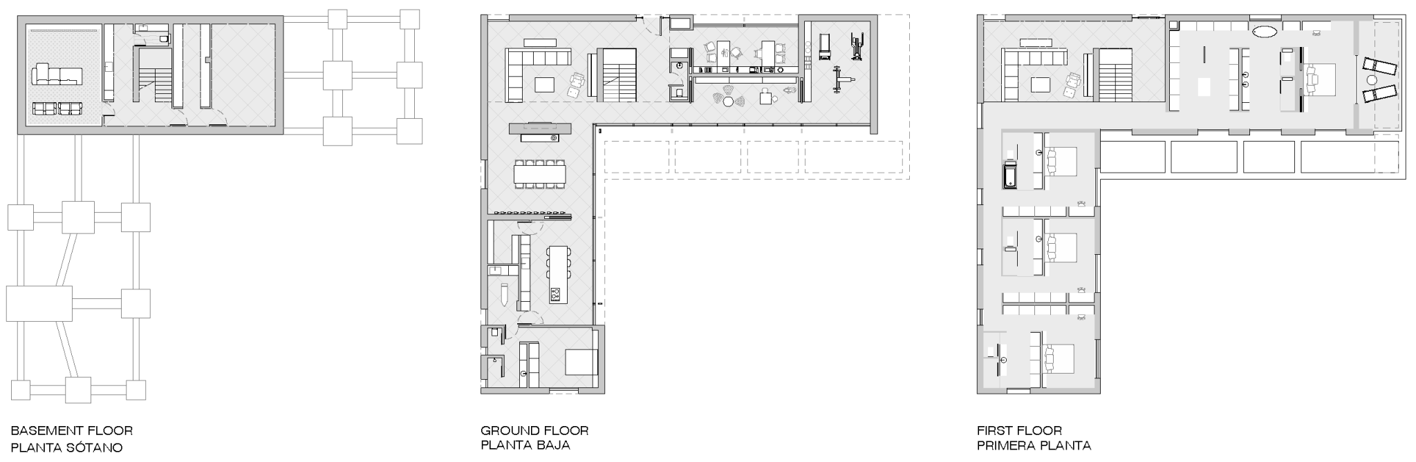 En una planta en L la rótula de unión entre los dos brazos es un punto singular del proyecto y es ahí donde se encuentra la entrada y el salón a doble altura. Anexos a él se desarrollan el comedor y la cocina, muy ligados visualmente a la piscina. En el otro brazo de la L en planta baja se ubica la zona de juegos, el aseo de respeto, el gimnasio y el despacho, único espacio que vuelca hacia el exterior de la L para captar la luz homogénea de norte y situarse al lado de la entrada, permitiendo que las visitas laborales no interfieran en la rutina doméstica.