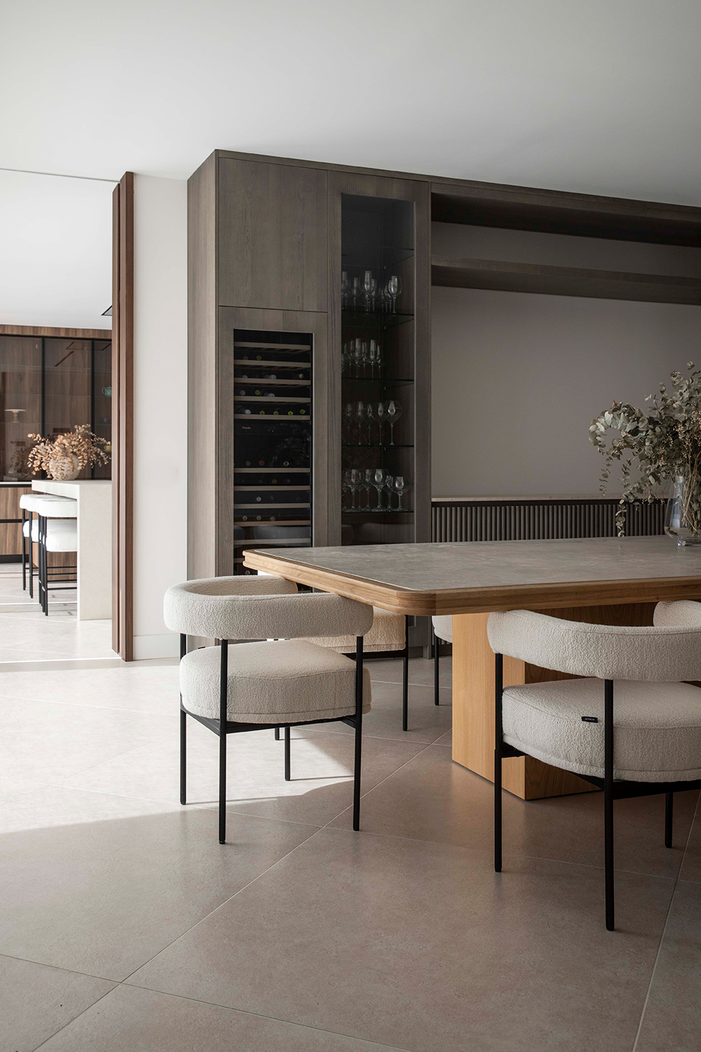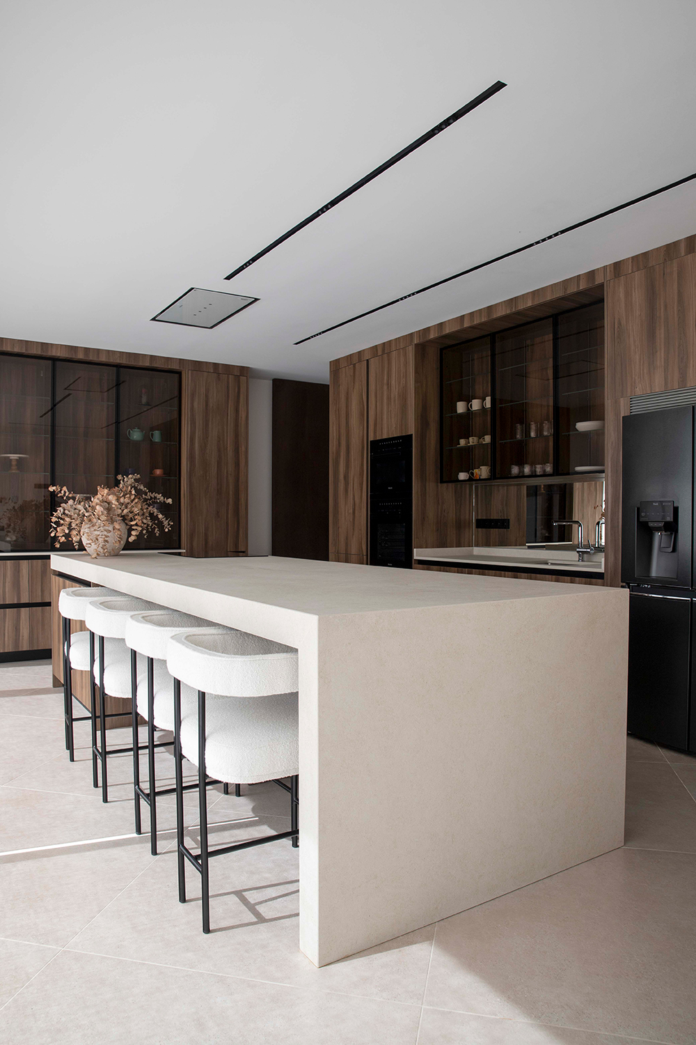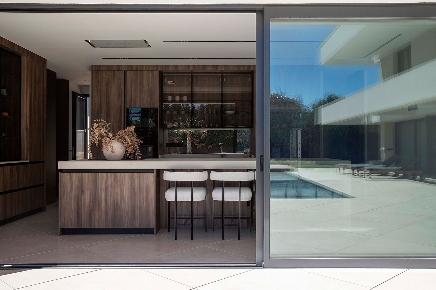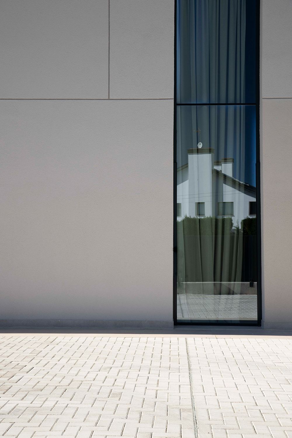 En una planta en L la rótula de unión entre los dos brazos es un punto singular del proyecto y es ahí donde se encuentra la entrada y el salón a doble altura. Anexos a él se desarrollan el comedor y la cocina, muy ligados visualmente a la piscina. En el otro brazo de la L en planta baja se ubica la zona de juegos, el aseo de respeto, el gimnasio y el despacho, único espacio que vuelca hacia el exterior de la L para captar la luz homogénea de norte y situarse al lado de la entrada, permitiendo que las visitas laborales no interfieran en la rutina doméstica.