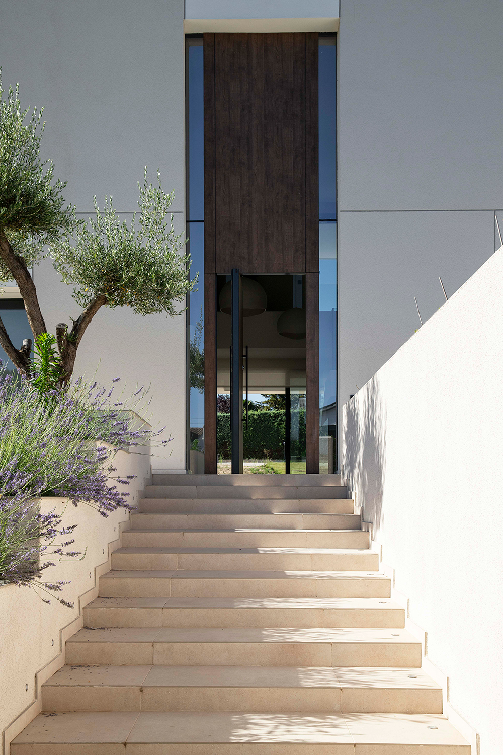 En el exterior, se juega con los propios relieves del terreno para zonificar los usos y crear una entrada peatonal en pendiente ascendente, claramente inspirada en los templos grecorromanos.