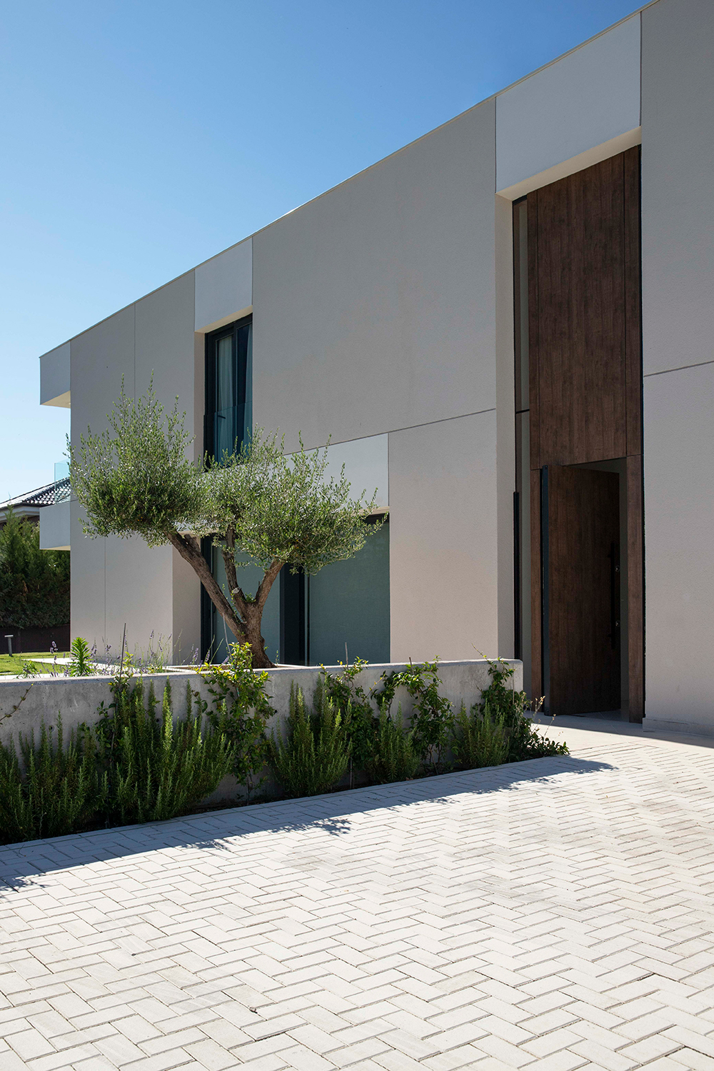 Se decide ubicar la construcción en la esquina noroeste de la parcela y desarrollarla en una geometría de planta en L para maximizar el aporte de luz solar y enmarcar las vistas sobre el encinar. Así, las fachadas exteriores de la L se cierran al tráfico rodado y las viviendas cercanas, mientras que las interiores se vuelcan hacia dentro de la parcela, donde se ubica la piscina y abundante vegetación, y las vistas al encinar.