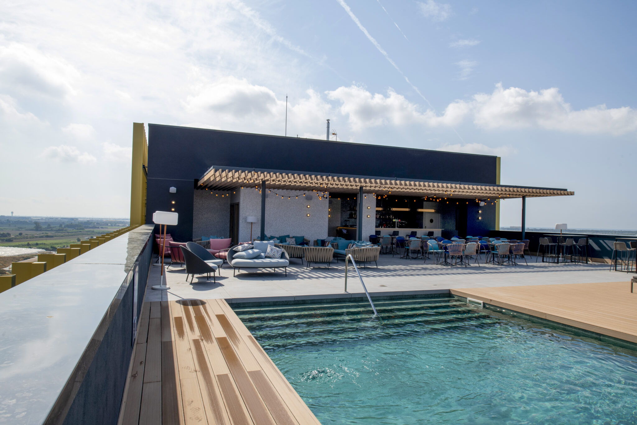 Para el descanso después de una larga jornada laboral y de viajes, REQUENA Y PLAZA ha diseñado también varios restaurantes donde cobra especial protagonismo la azotea, con una magnífica piscina y un bar que recuerda al tradicional “chiringuito de playa” pero revisado con toques de elegante chill-out. Hasta en el fitness center se cuidan todos los detalles, continuando con la estética de lujo sofisticado, elegancia y discreción de todo el conjunto.