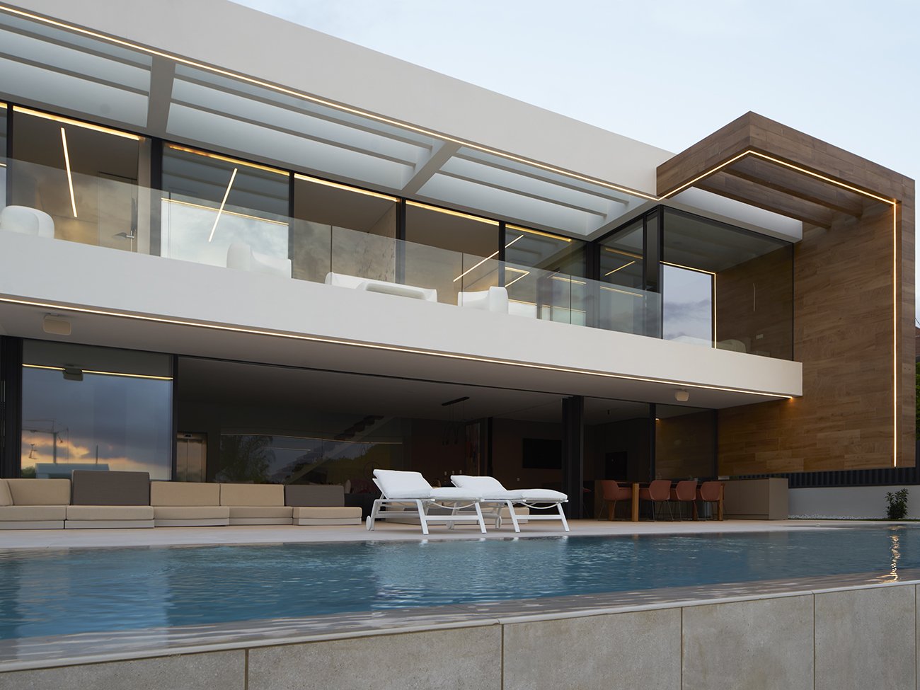 Para la materialidad exterior se optó para las fachadas por una combinación entre un revestimiento multicapa continuo de color blanco, grandes paneles de vidrio con carpintería empotrada minimalista de aluminio de la marca Cortizo, Serie COR VISION, COR 70 HO y Serie COR 60 con un acabado gris antracita y un tercer material, revestimiento porcelánico en acabado imitación madera de gran formato. La puerta principal, la caja del ascensor o el volumen que interiormente contiene el espacio de las escaleras se trabajan con dicho porcelánico imitación madera, al igual que en la fachada que vuelca a la zona de la piscina, en la pieza que protege y da privacidad de vistas con las viviendas próximas,