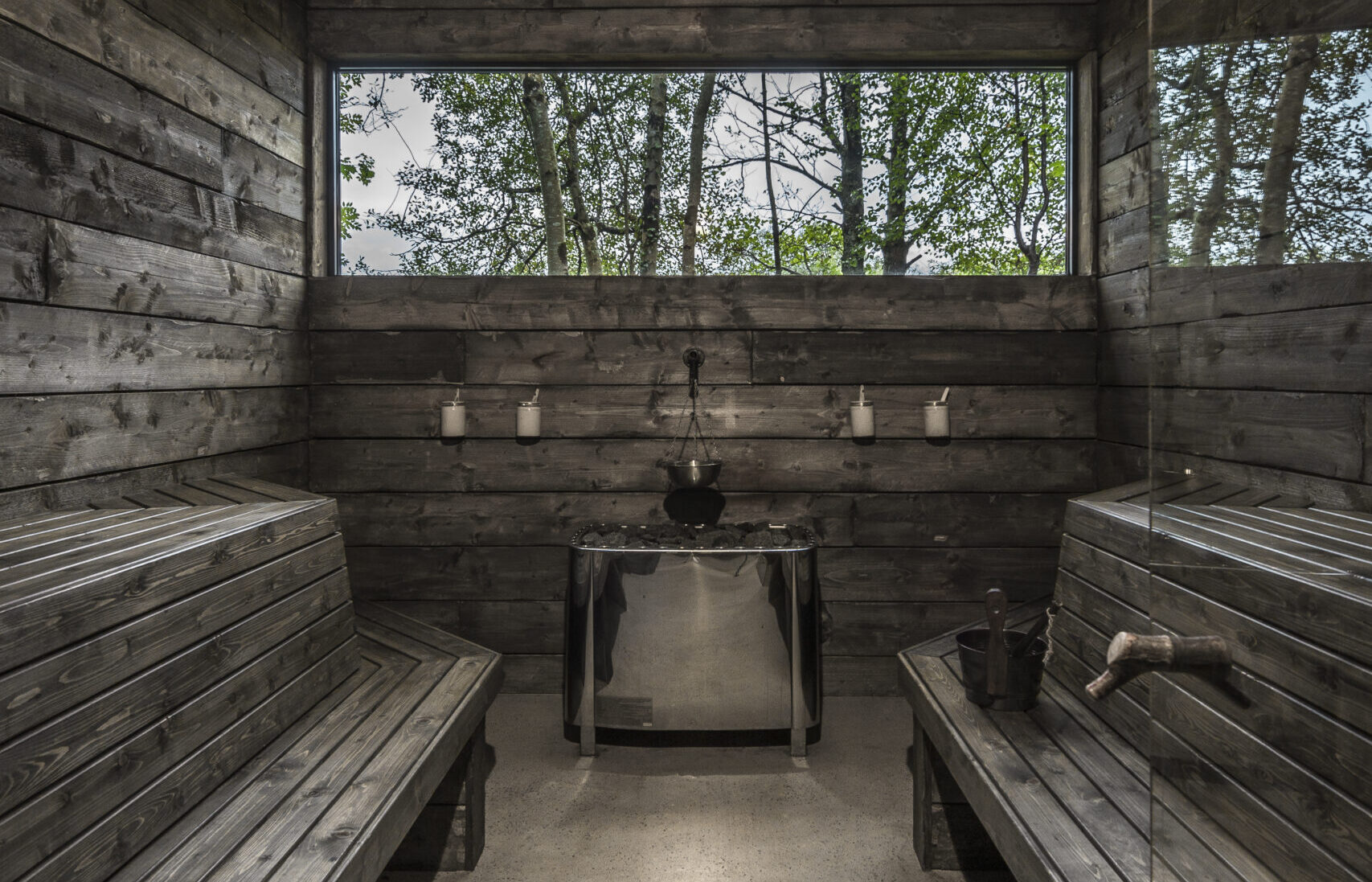 El exterior de los volúmenes está revestido con chapa ondulada oxidada para acelerar el proceso natural de envejecimiento del material. De su color dorado inicial pasará a tonos pardos que terminarán por fundirse con el entorno boscoso. En el interior, la madera quemada cubre las superficies y refuerza la integración de los volúmenes en la naturaleza, generando continuidad entre arquitectura y paisaje.