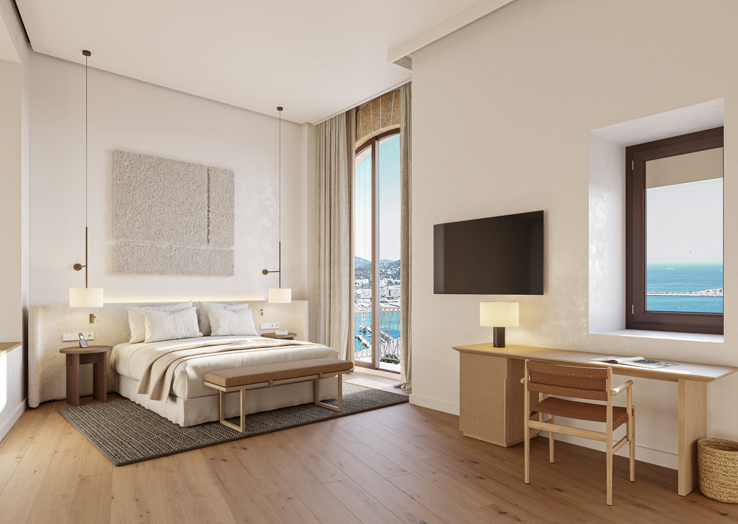 Distribuidas en cinco edificios dentro del conjunto de la fortaleza, sus 66 magníficas habitaciones ofrecen una experiencia de alojamiento única en la isla, caracterizada por unas espectaculares vistas, ventilación natural, materiales de gran calidez y soluciones técnicas que proporcionan confort sin alterar la esencia histórica del lugar. Los espacios comunes -restaurante, cafetería, salones, zona wellness, piscina exterior y solárium- han sido concebidos como puntos de encuentro abiertos a la ciudad y a sus visitantes, integrándose en el tejido urbano y social de Dalt Vila y de toda la isla ibicenca.