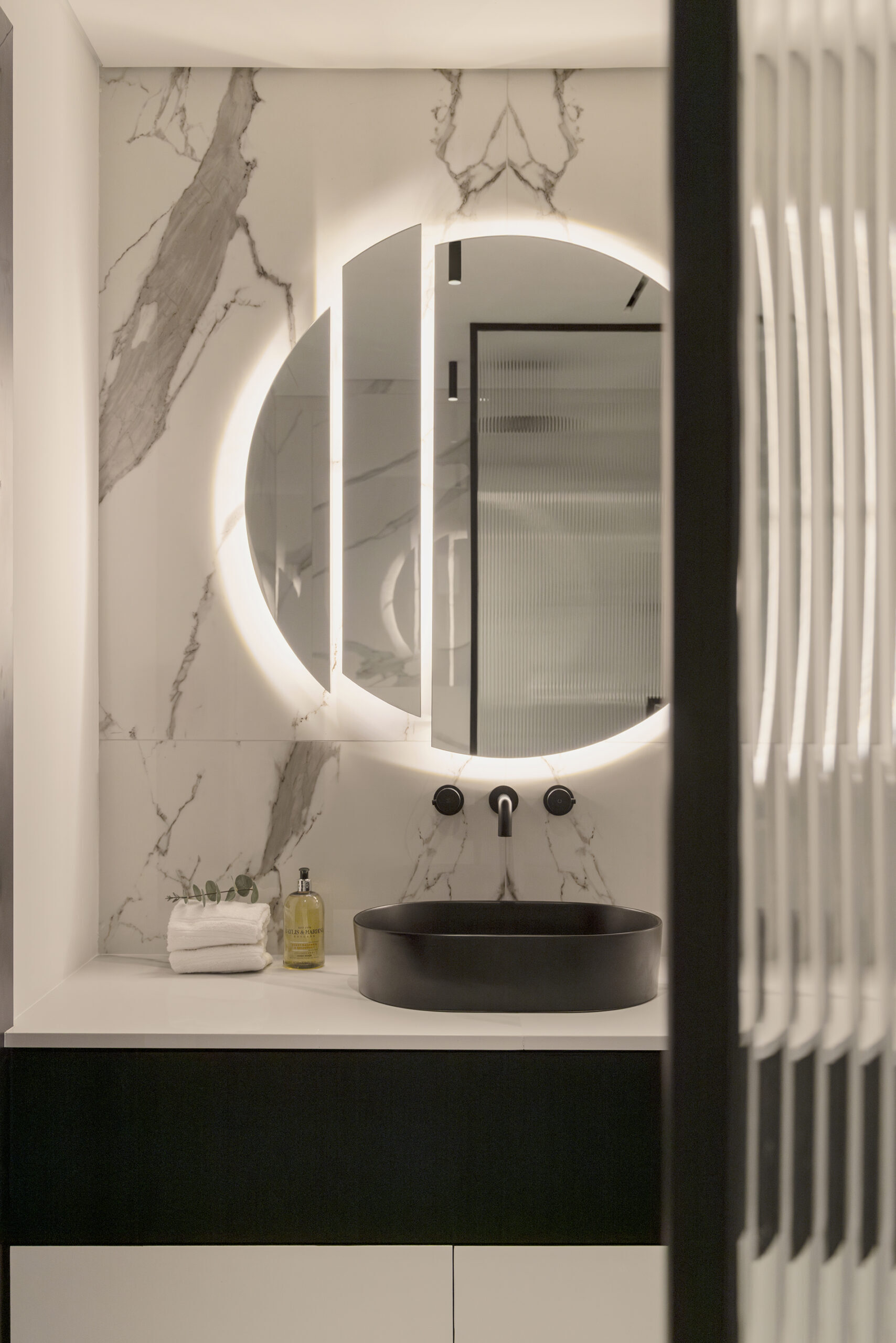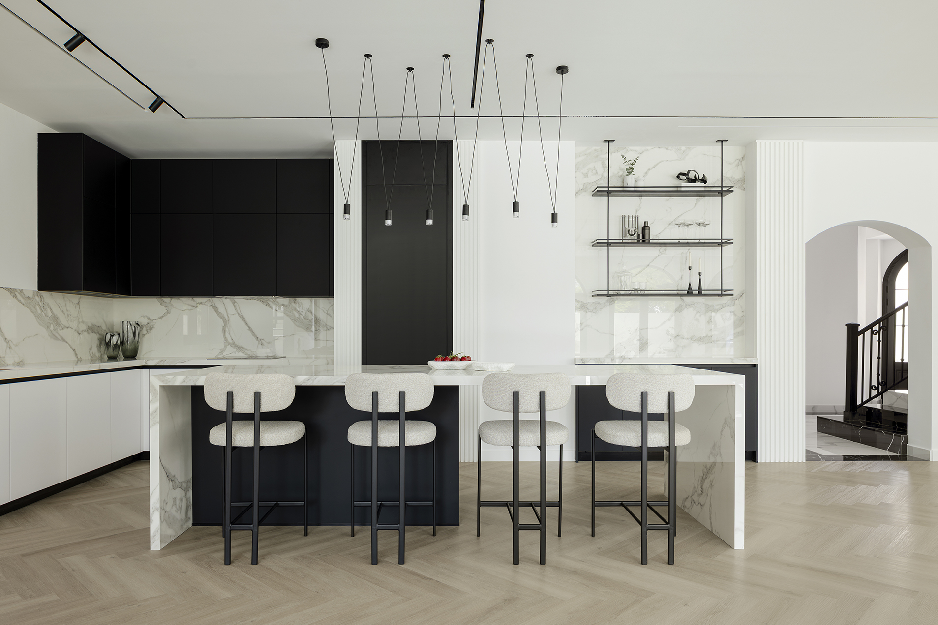 Desde el primer vistazo, la fachada blanca enmarcada en negro anuncia una narrativa visual basada en el contraste sutil y la armonía de materiales. En el interior, la pureza de las líneas se combina con la riqueza de texturas naturales, mármoles suaves y carpinterías oscuras, generando una atmósfera envolvente que transmite calma y equilibrio. Cada estancia ha sido concebida para fluir de manera orgánica: la cocina se integra con el salón y el comedor, creando un espacio continuo que favorece la interacción y la luz natural.