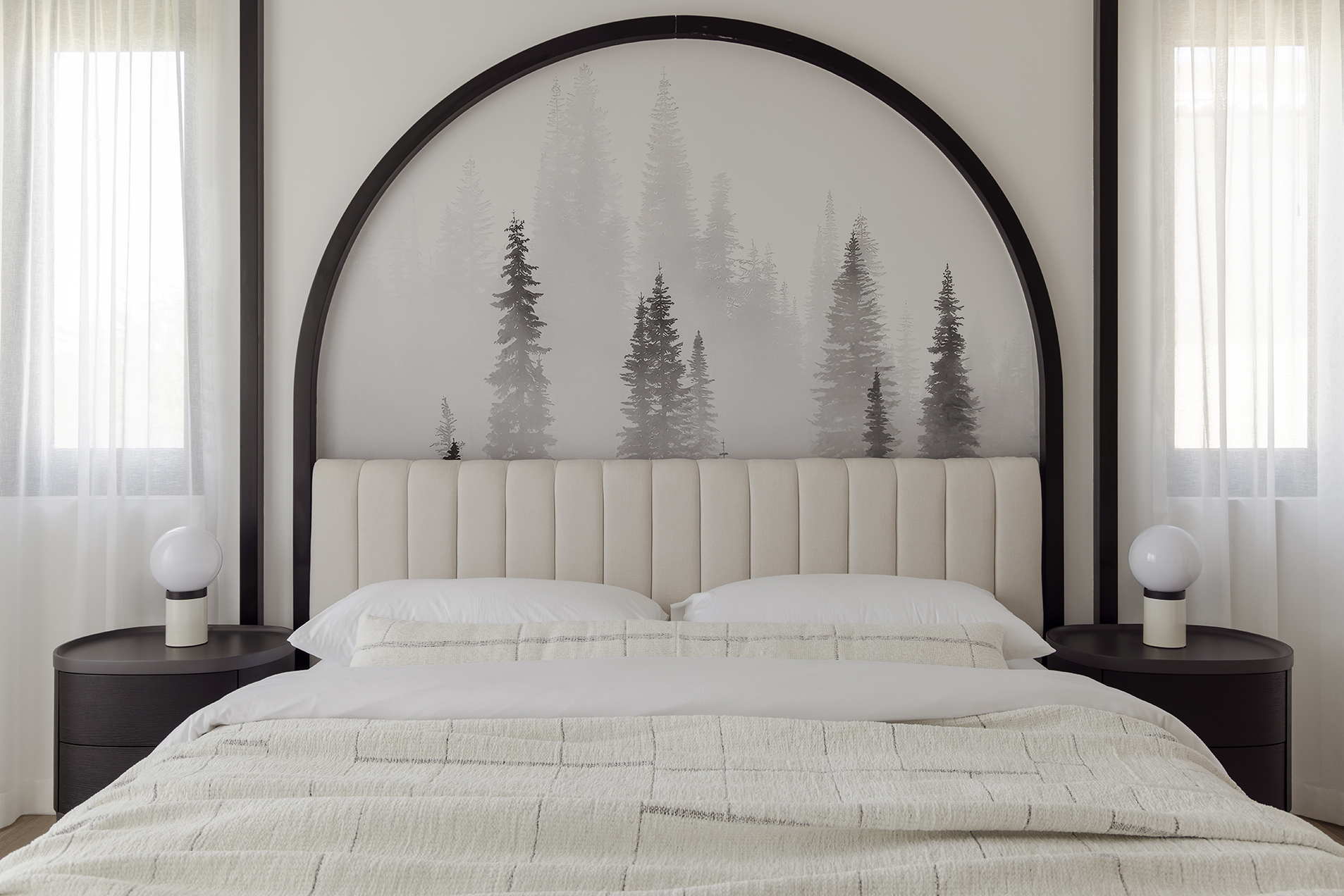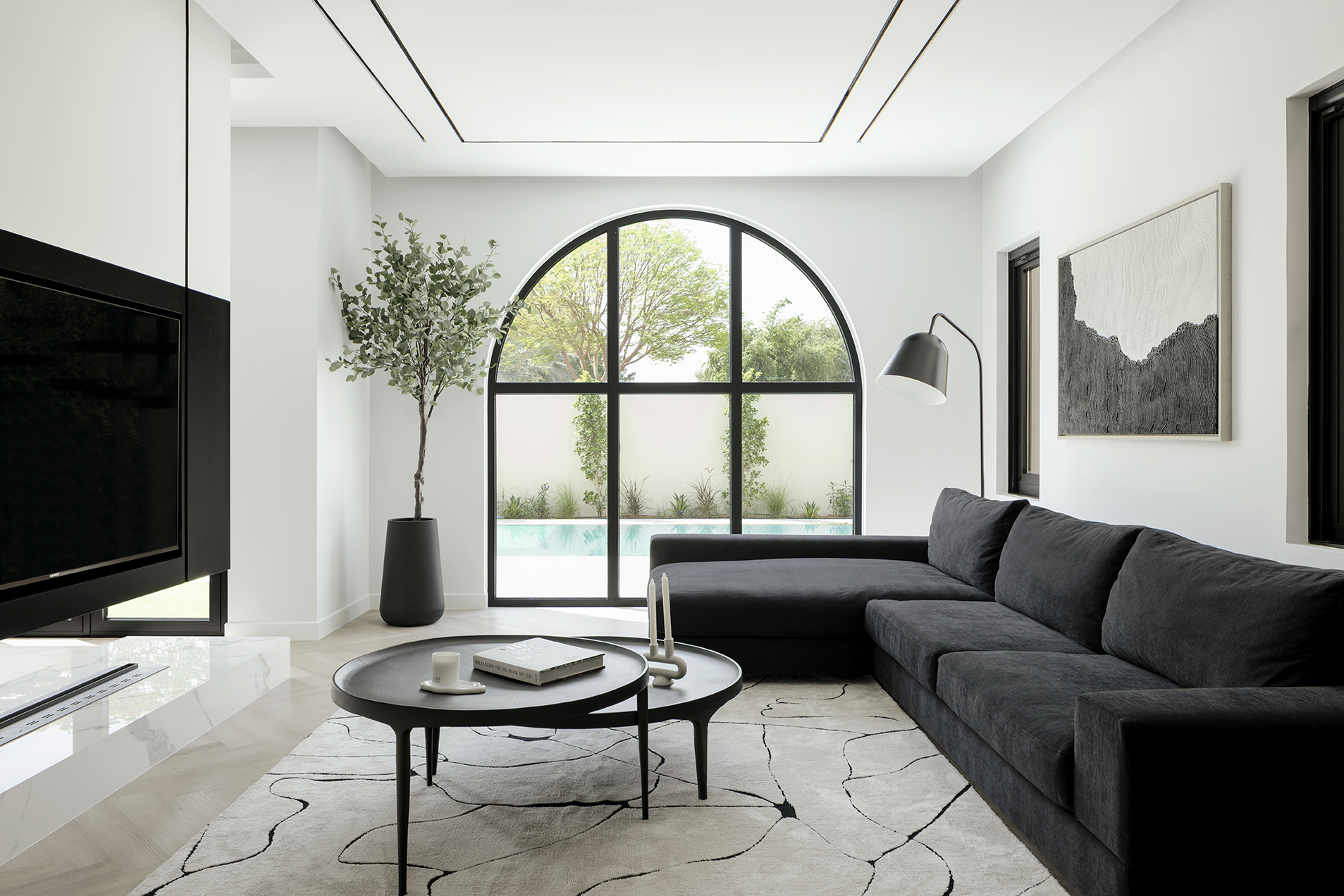 Los grandes ventanales arqueados, una seña de identidad mediterránea reinterpretada desde una mirada contemporánea, inundan los espacios de luz y proyectan sombras suaves que cambian a lo largo del día, aportando dinamismo y vida al interior. Este juego de luces y volúmenes refuerza la sensación de amplitud y acentúa la conexión con el exterior.