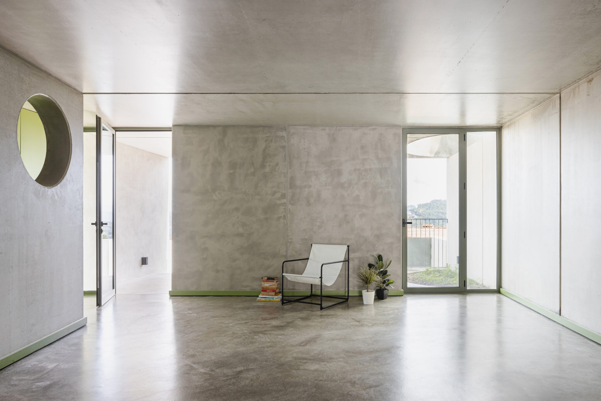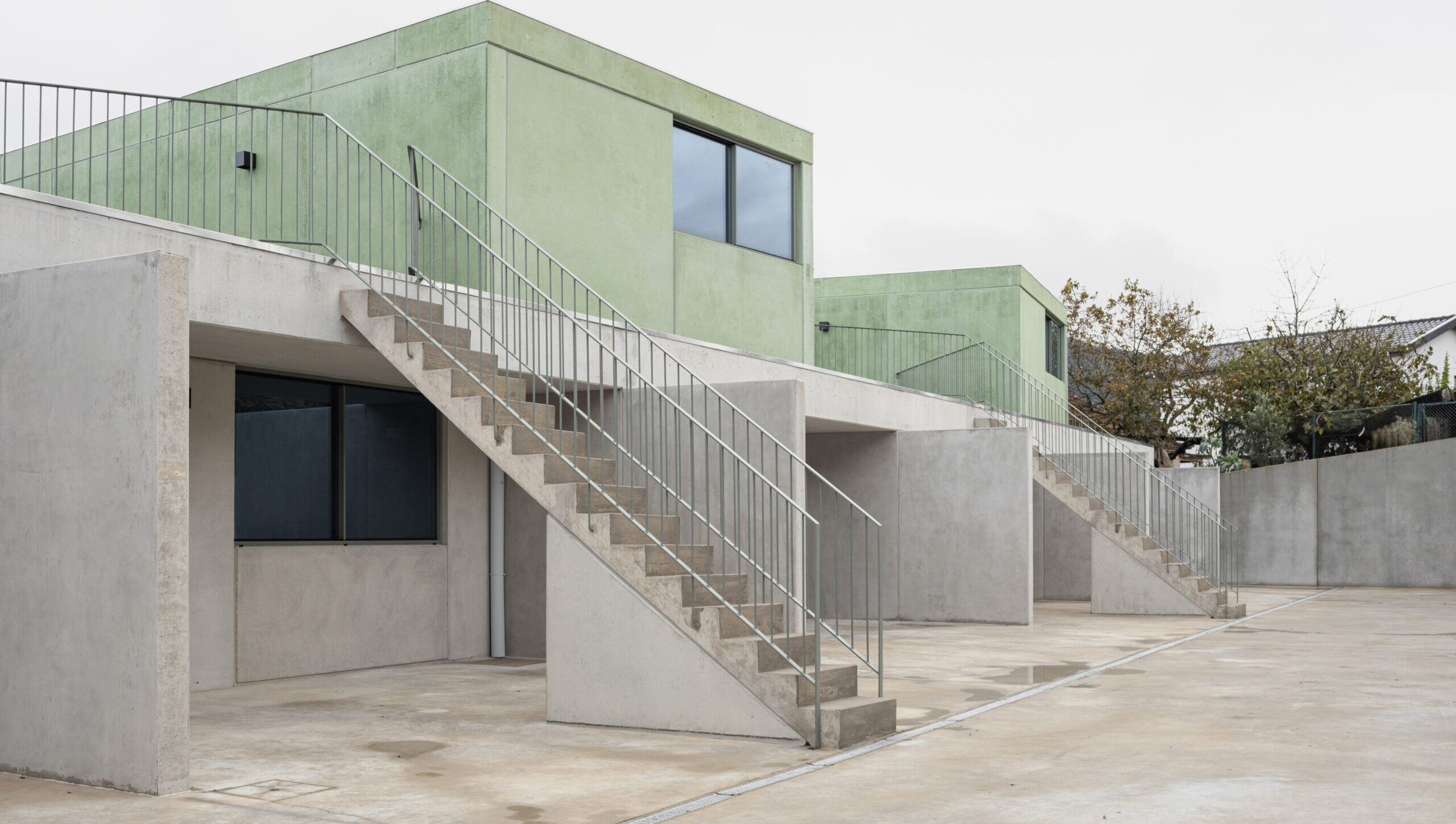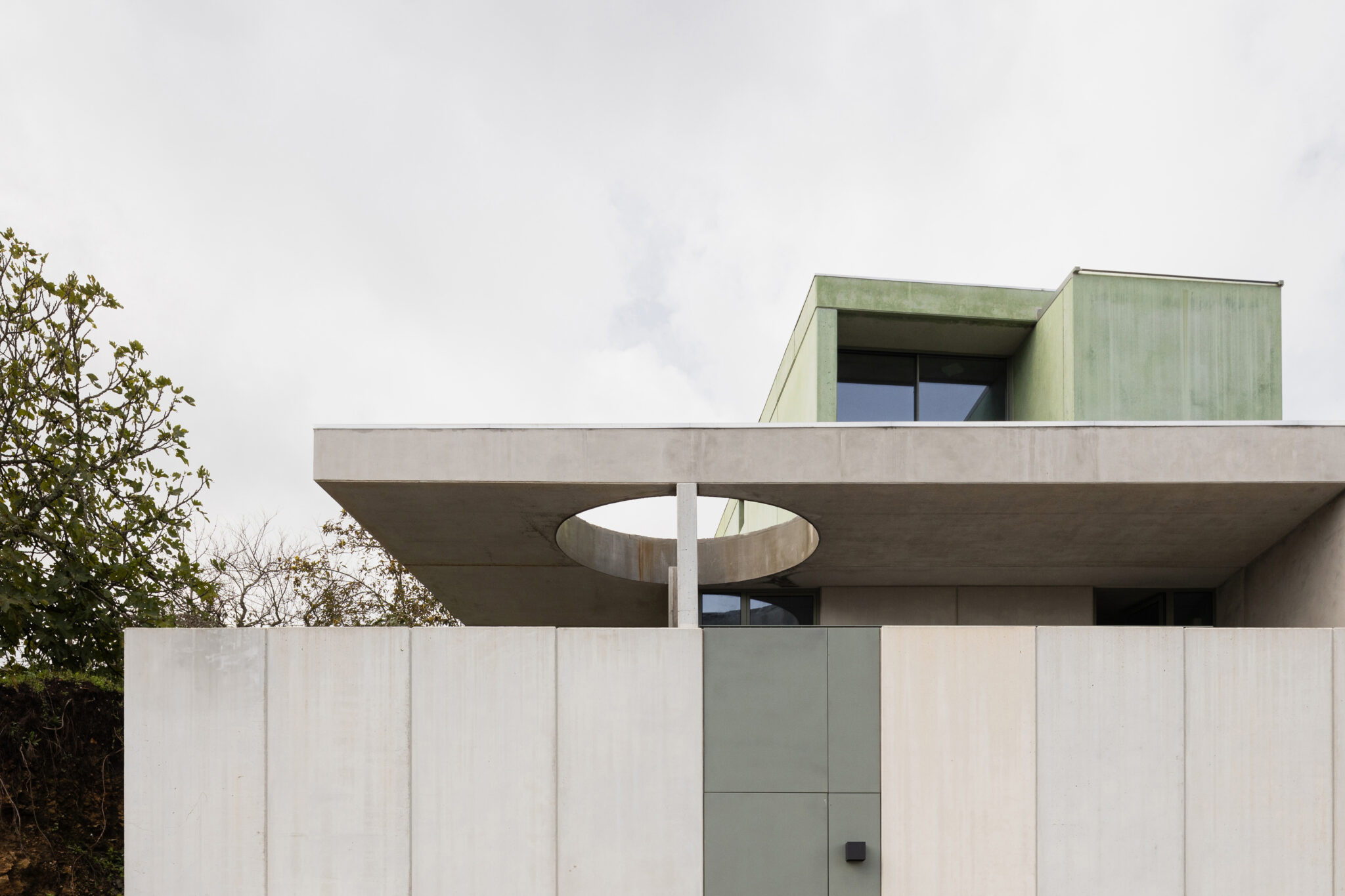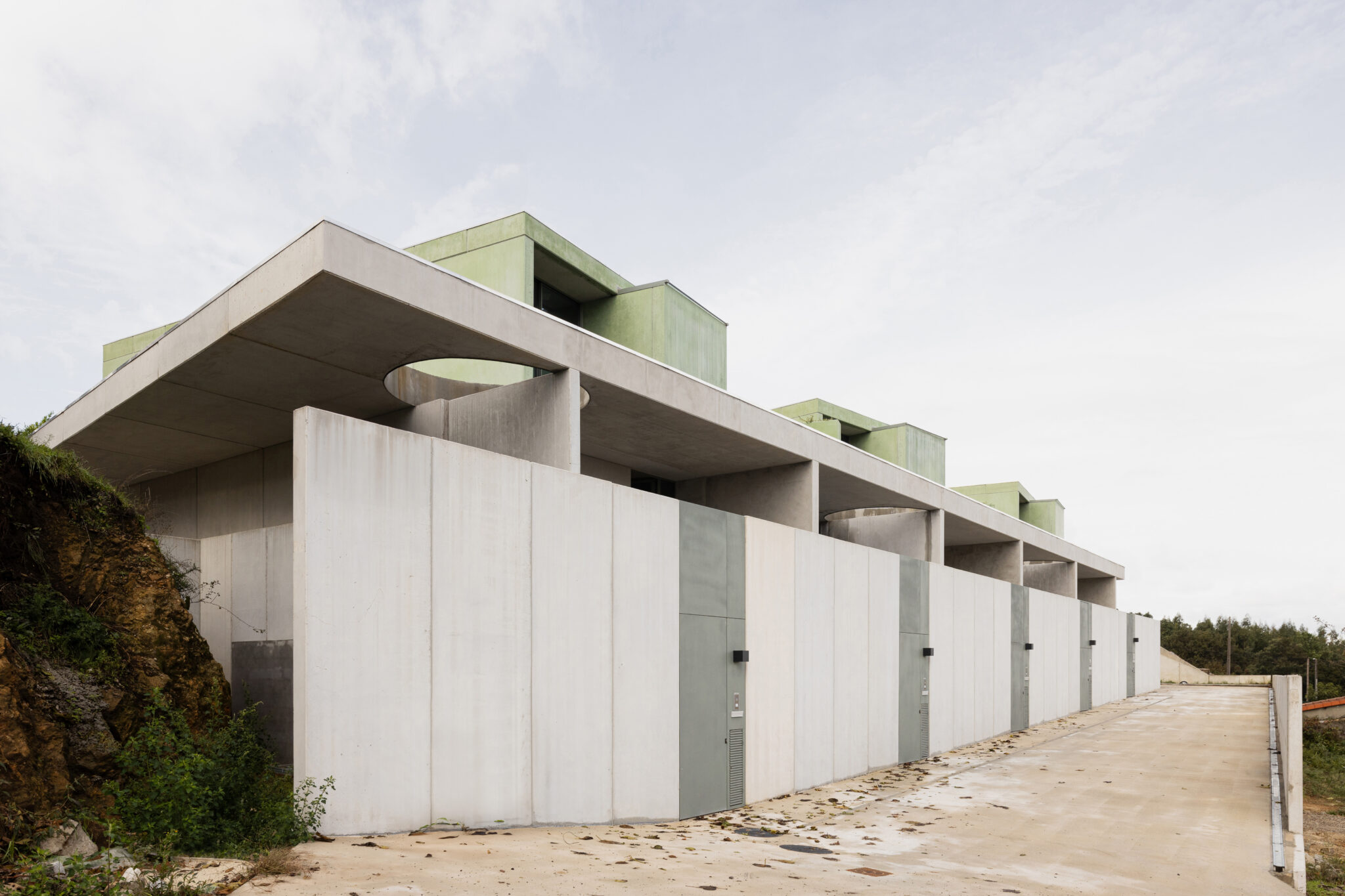 Los paneles de pared prefabricados definen luces libres de 6,30 metros, funcionando como elementos estructurales verticales sobre los que apoyan las piezas de prelosas que conforman la cubierta de la planta baja. Esta losa desempeña un papel fundamental en la lectura formal del edificio: por debajo de ella, el hormigón mantiene su tonalidad natural; por encima, aparece pigmentado en color verde, estableciendo una clara separación visual entre la base construida y los volúmenes superiores que se apoyan sobre ella.