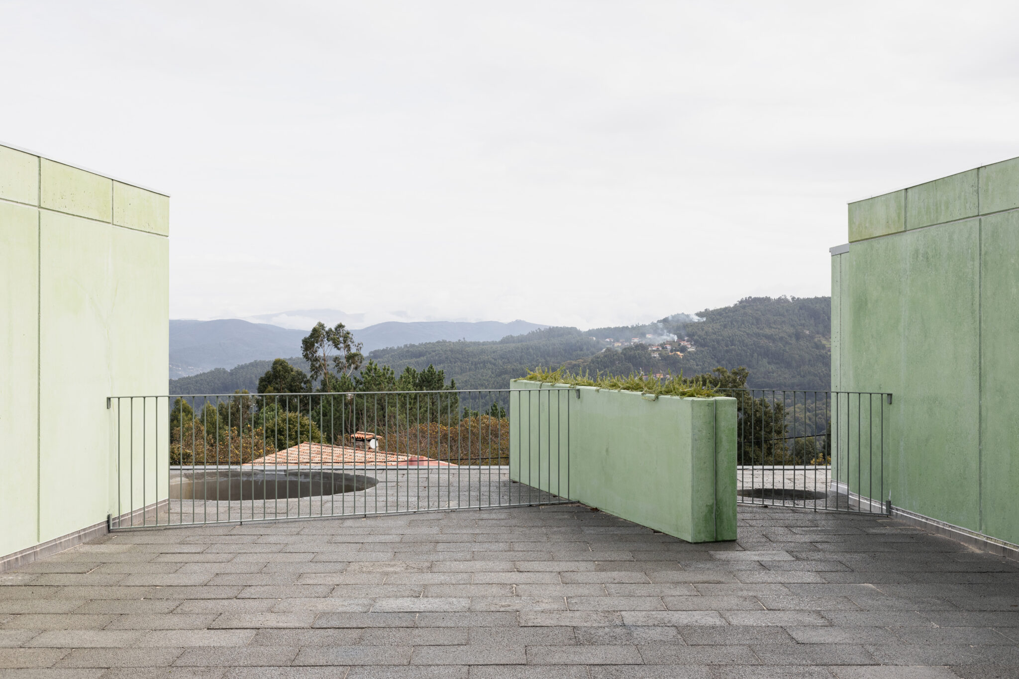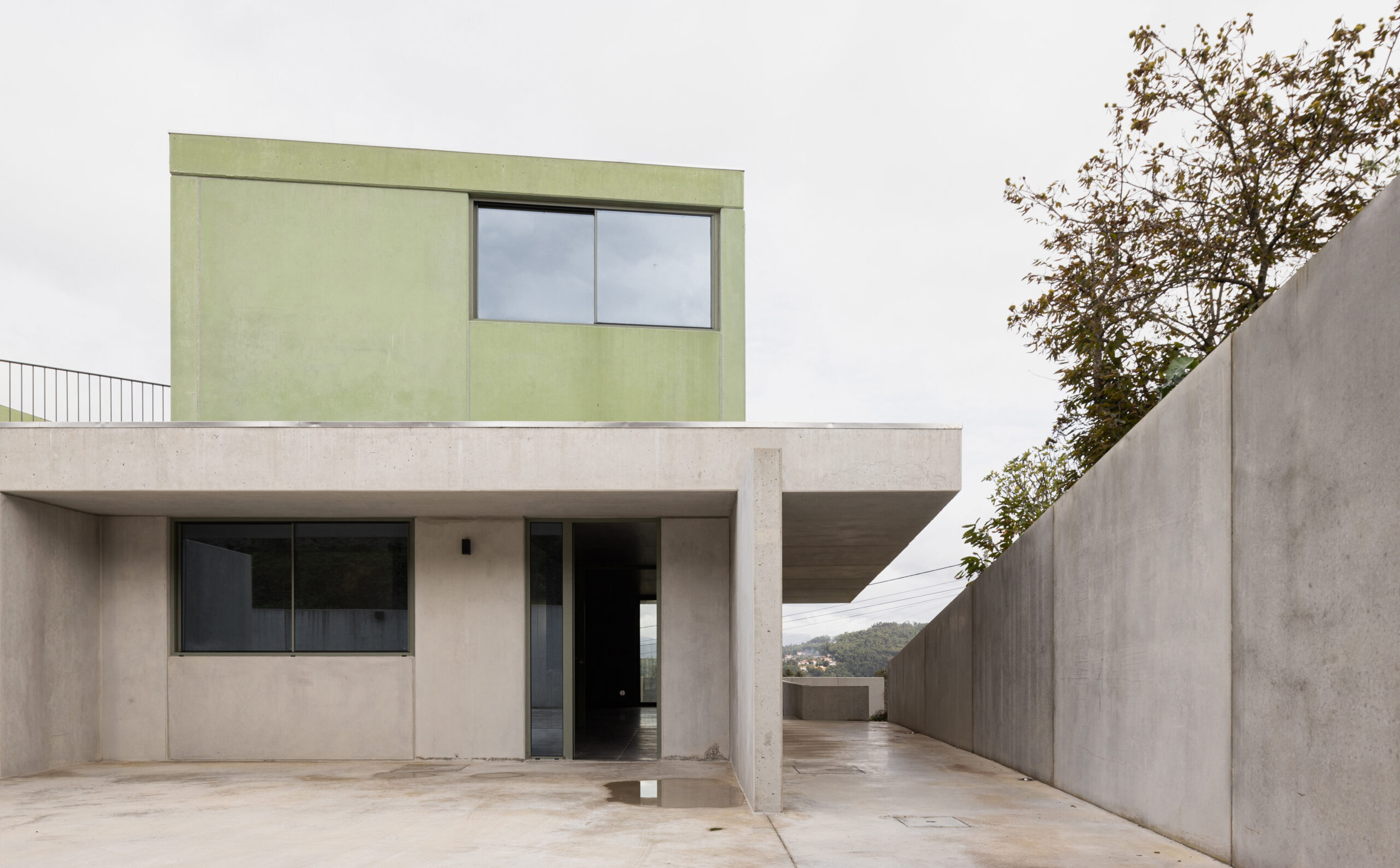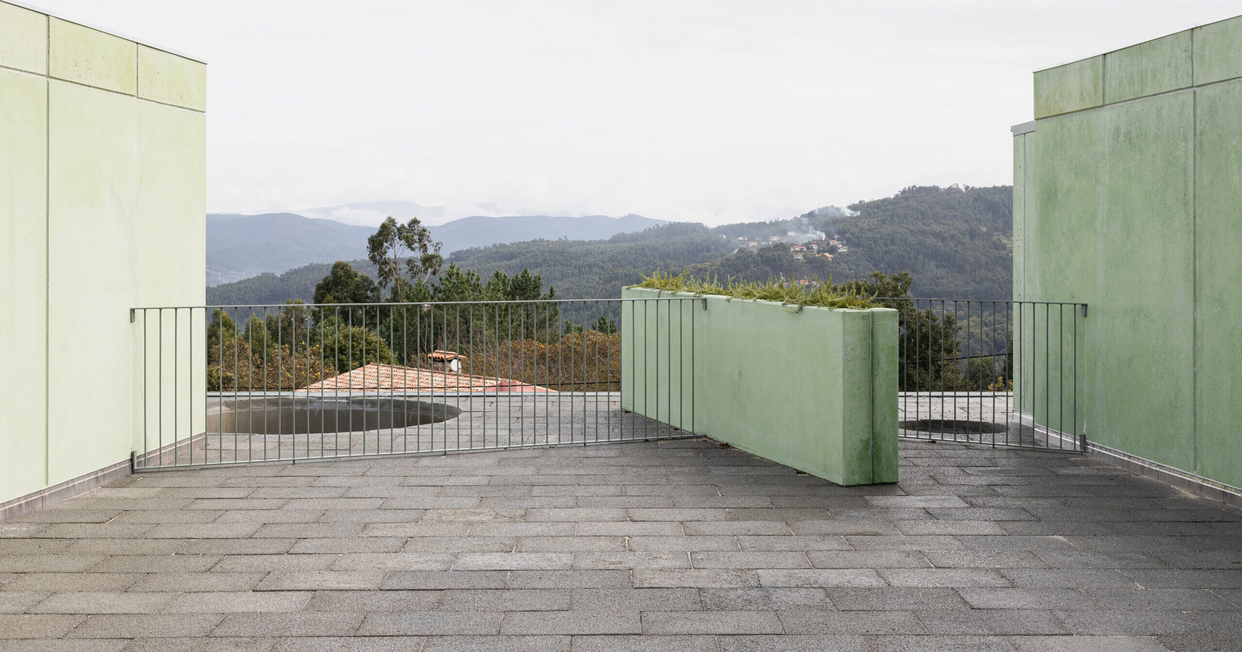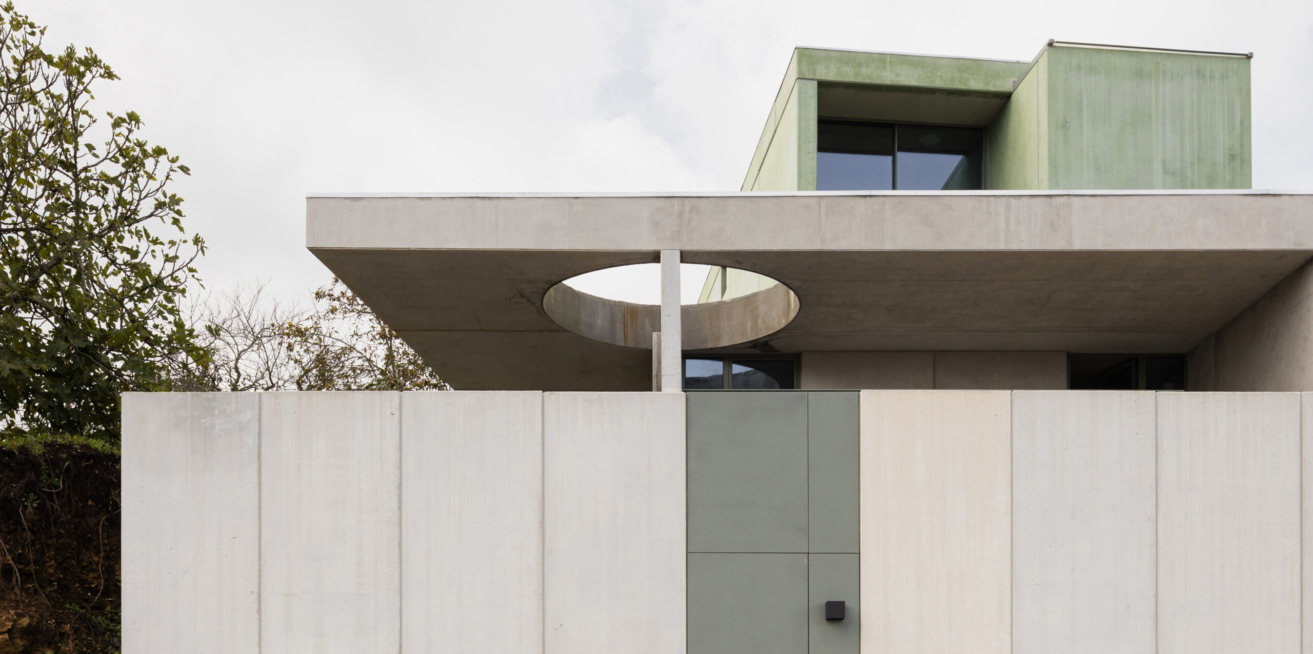Los paneles de pared prefabricados definen luces libres de 6,30 metros, funcionando como elementos estructurales verticales sobre los que apoyan las piezas de prelosas que conforman la cubierta de la planta baja. Esta losa desempeña un papel fundamental en la lectura formal del edificio: por debajo de ella, el hormigón mantiene su tonalidad natural; por encima, aparece pigmentado en color verde, estableciendo una clara separación visual entre la base construida y los volúmenes superiores que se apoyan sobre ella.