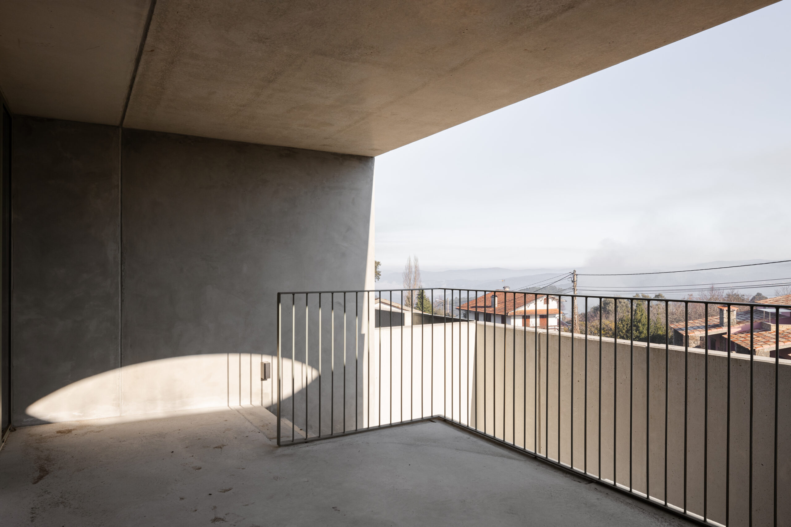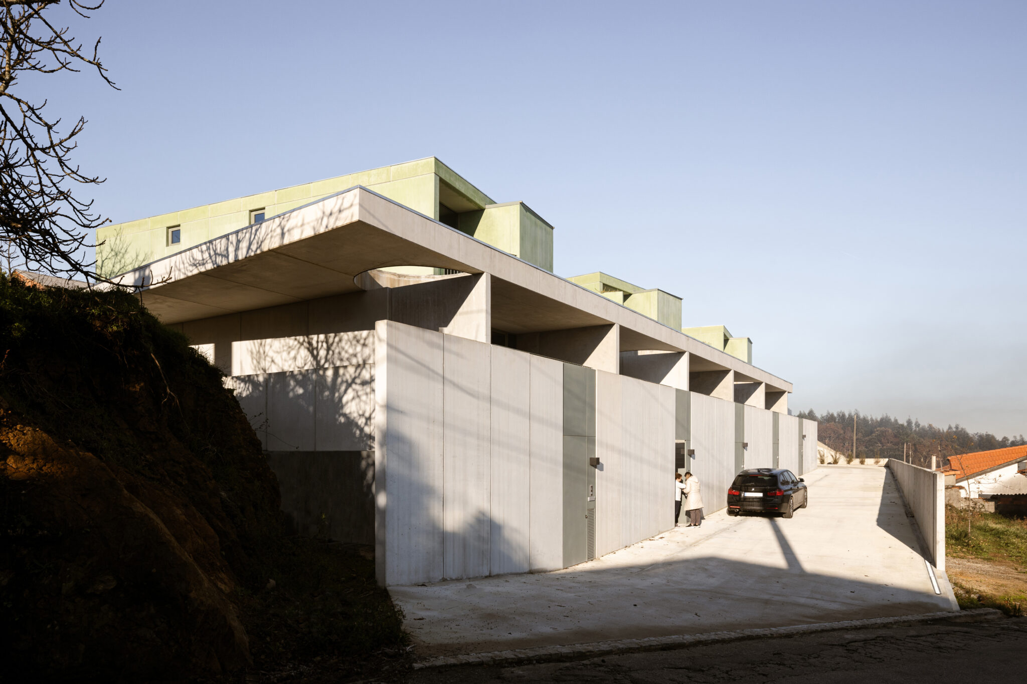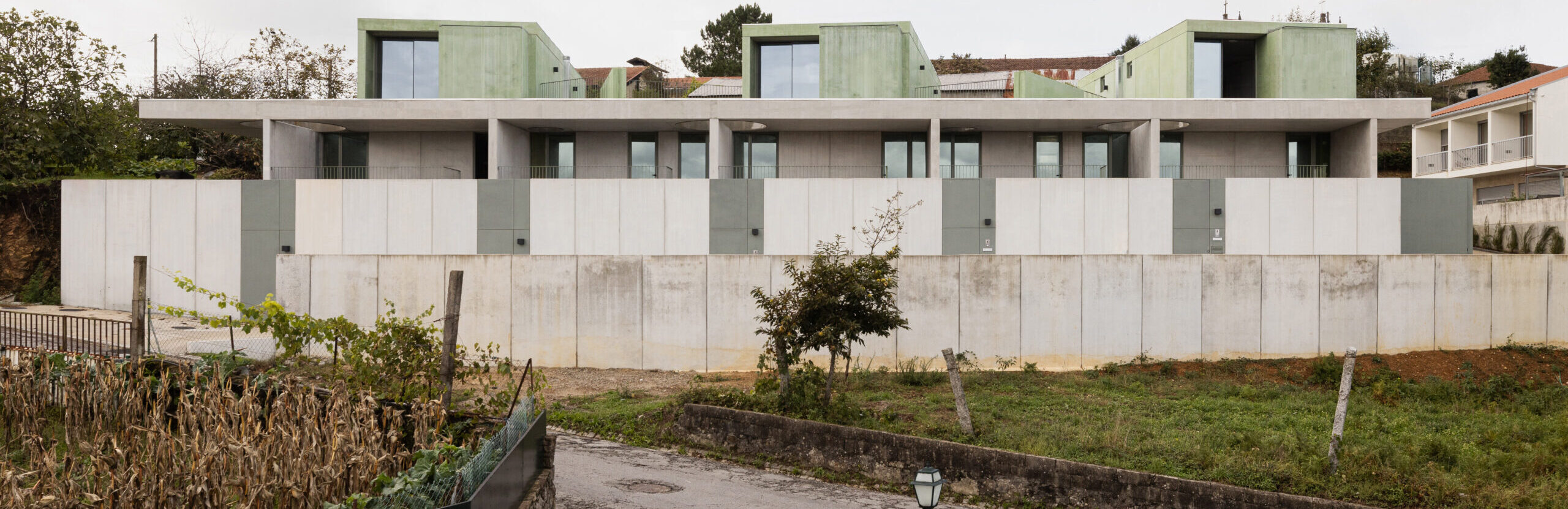 El conjunto está compuesto por cinco viviendas, de las cuales tres se desarrollan en dos plantas y dos en una sola. En la planta baja, todas las viviendas presentan una planta rectangular y disponen de dos fachadas libres, garantizando una relación directa con el exterior. En la planta superior emergen tres volúmenes paralelepipédicos independientes, implantados de forma irregular sobre la gran losa de cubierta del nivel inferior. Los espacios intermedios se destinan a terrazas, accesibles mediante escaleras de un solo tramo desde la parte posterior del edificio, orientadas al este y con vistas directas a la Serra da Freita.