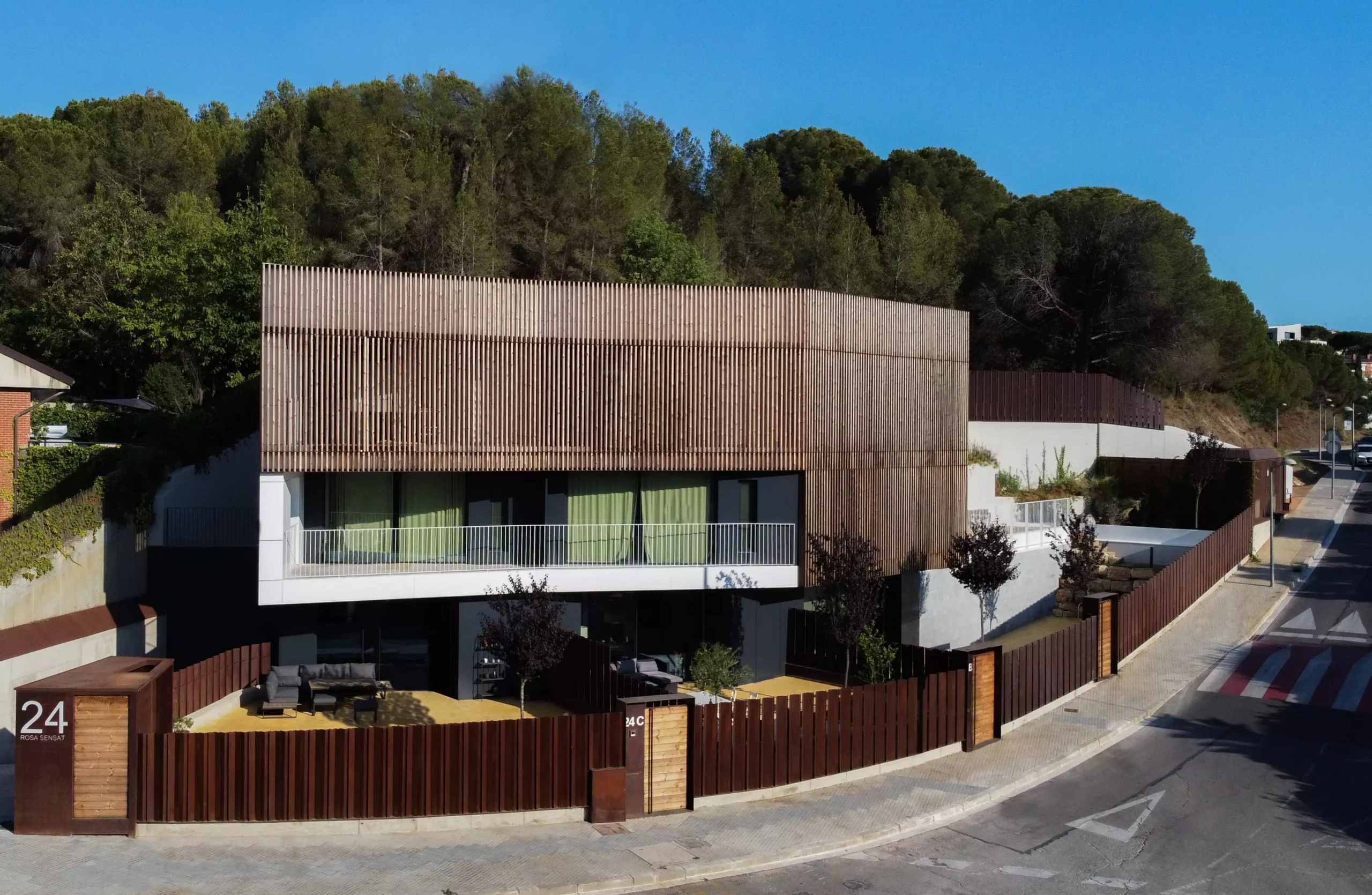 Envuelto, las plantas piso de la fachada soleada, con una piel parcialmente practicable de lamas de madera de pino deshidratada que deja en sombra las terrazas de los pisos superiores, que esconde la medida de la edificación y reduce el impacto del volumen edificado contra el fondo del bosque de pinos. Esta piel es replicada, en planta baja, por una superficie de perfiles de acero corten que rodea la totalidad del perímetro del solar haciendo de valla y contiene los accesos a las viviendas, como únicos elementos arquitectónicos identificables.