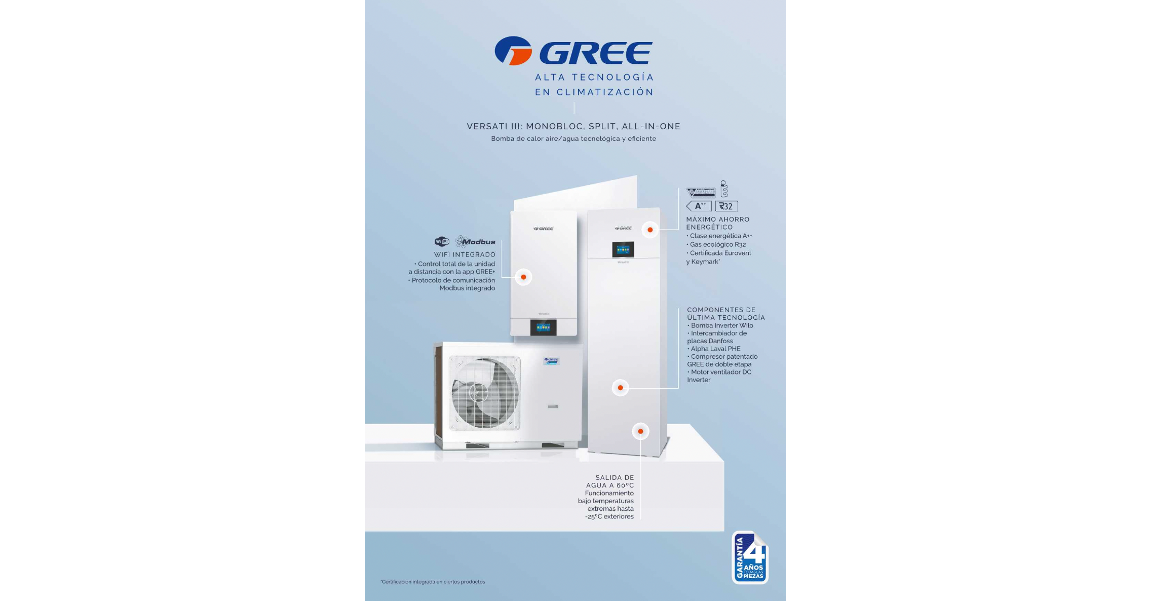 | · Formada por los modelos Monobloc, All-in-One y Split, la serie Versati incorpora un compresor de doble etapa patentado por GREE que permite producir agua a 60°C sin apoyo eléctrico. |