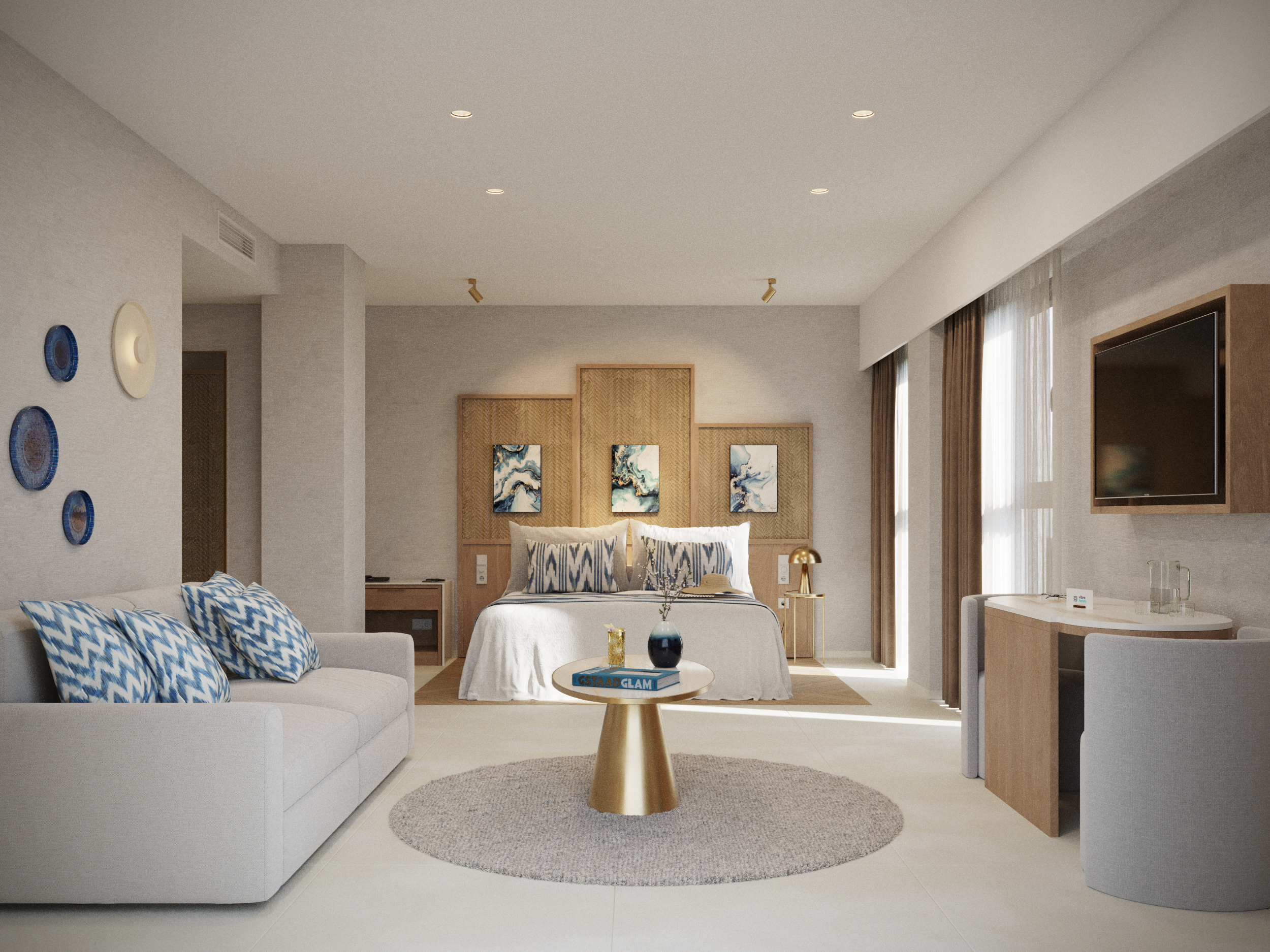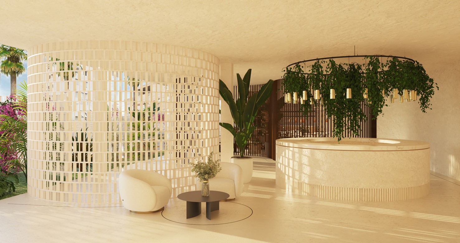 Vibra Jabeque Blue, que pasará a tener 4 llaves tras la reforma, ha sido concebido como un refugio moderno donde diseño y confort se dan la mano, a pocos pasos de las impresionantes playas de la isla de Ibiza. El proyecto asciende a 6.000.000 € y revela una propuesta arquitectónica contemporánea que maximiza la luz natural y la sensación de paz, inspirado en el azul del mar, así como en la pureza y la calma del agua. Las líneas limpias y los espacios abiertos dominan tanto en las áreas comunes como en los apartamentos creando un ambiente atractivo y acogedor.