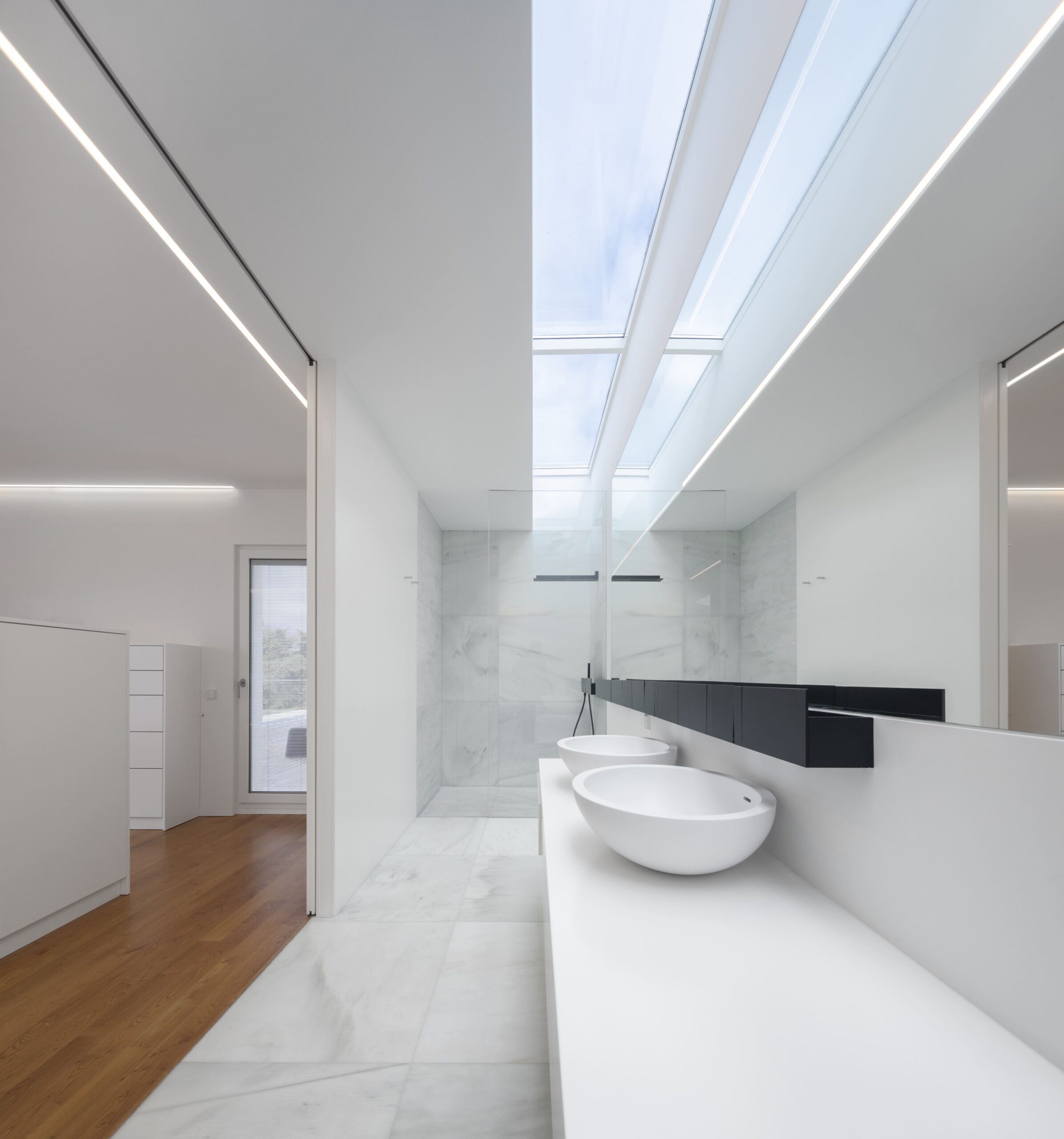 La casa ha sido revestida con mármol blanco de Macael, envuelta en una prenda de preciosidad y lujo contemporáneo discreto. Se añadieron ventanales de suelo a techo a esta vivienda de 600 m² para aumentar la entrada de luz y maximizar la vista de un entorno incomparable.